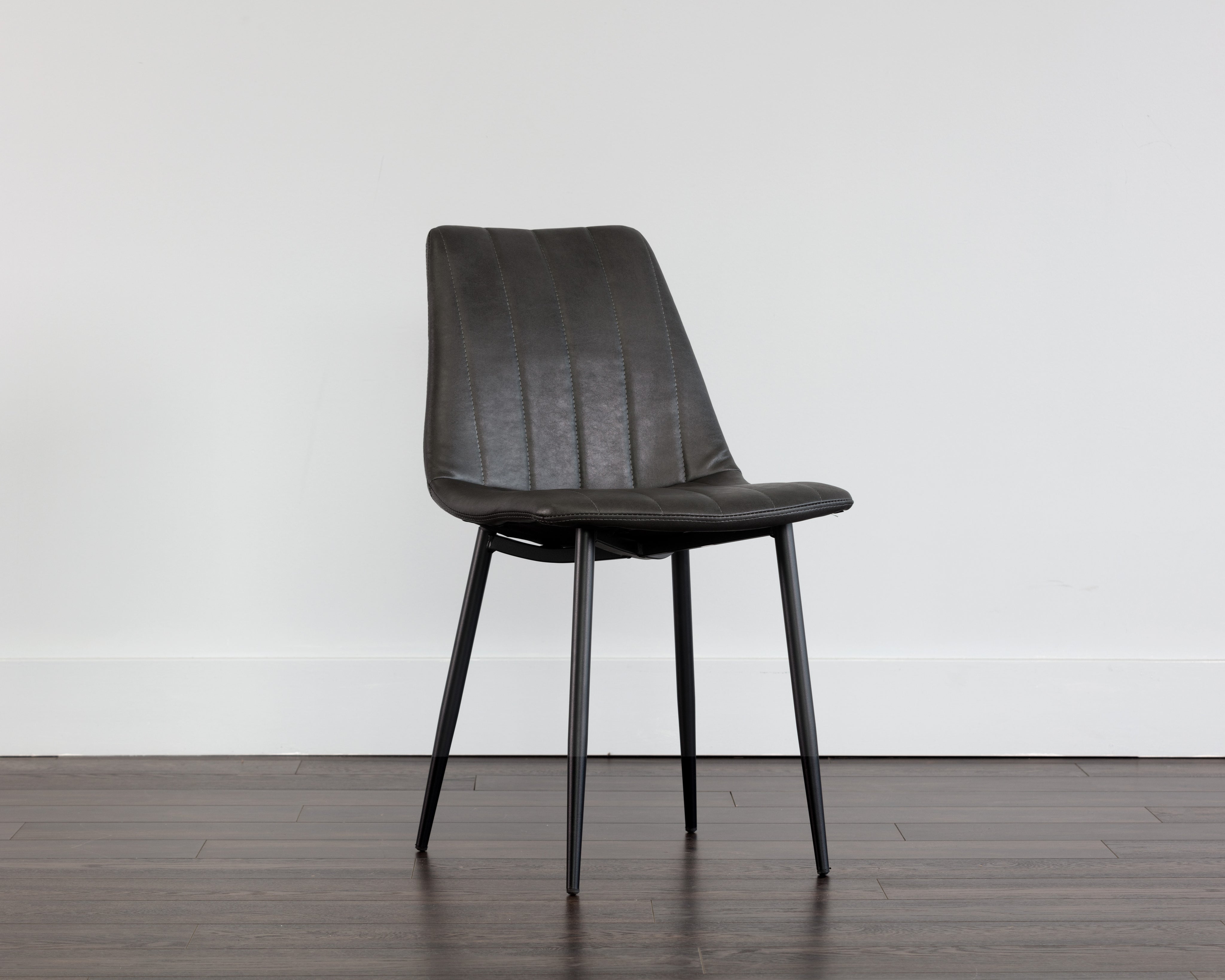 This compact dining chair creates a cool and casual mood. Features channel tufting on the seat and seatback. Stocked in bravo cognac and portabella faux leather or light grey fabric with a black powder-coated steel frame.
