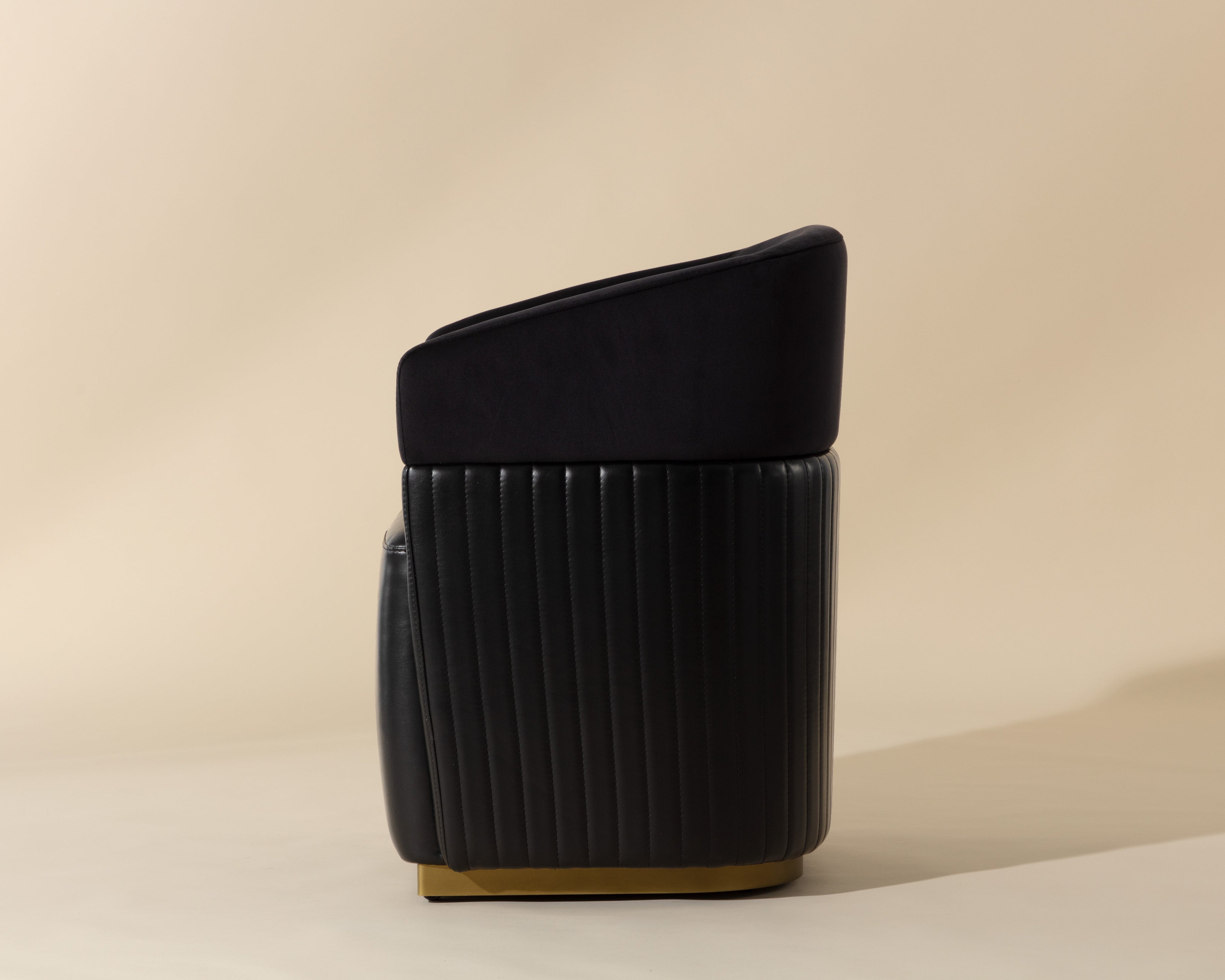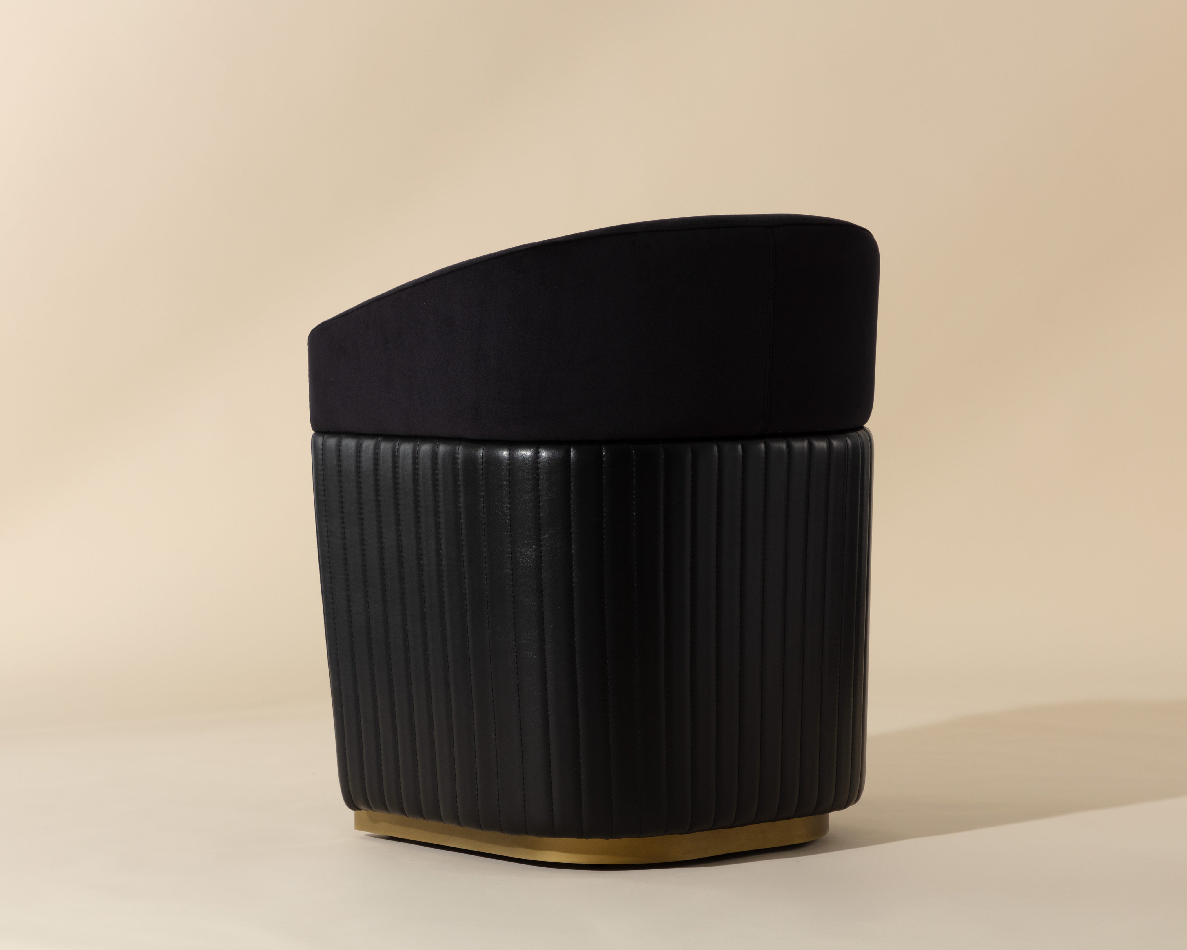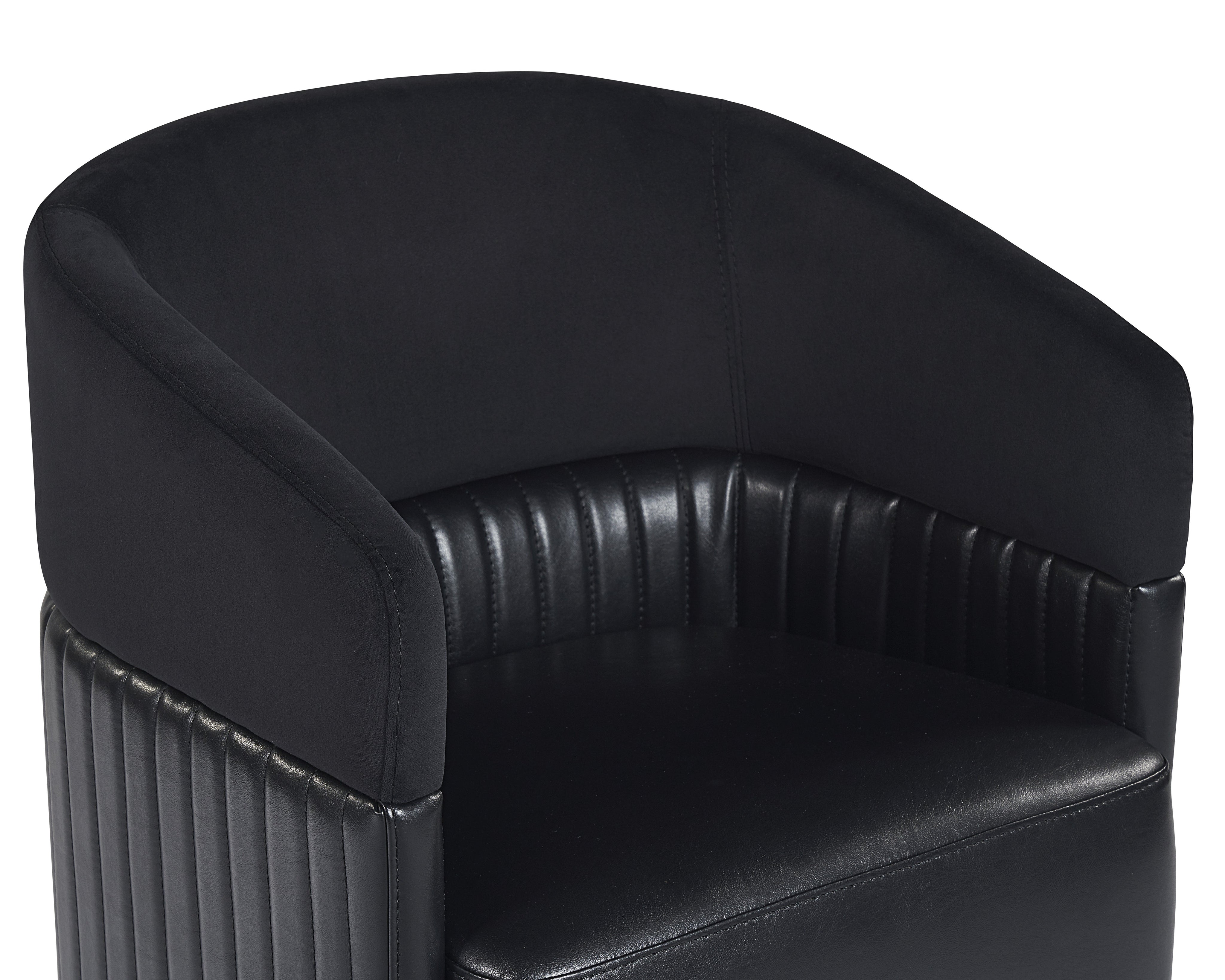 Guests will be intrigued by the unique design details found on this wheeled lounge chair. Designed with contemporary styling, this chair features a channel tufted seatback in abbington black fabric and cantina black bonded leather with a brass frame. Handle with Care: This design has been crafted with bonded leather. Bonded leather is a blend of reconstituted leather and synthetic materials crafted to reflect the natural characteristics of leather; as such, colour variations, markings, wrinkles, grooves and light scratches are acceptable and appreciated characteristics. No two pieces are alike. Visit our Product Care page for more information on how to ensure the lasting beauty of this piece.