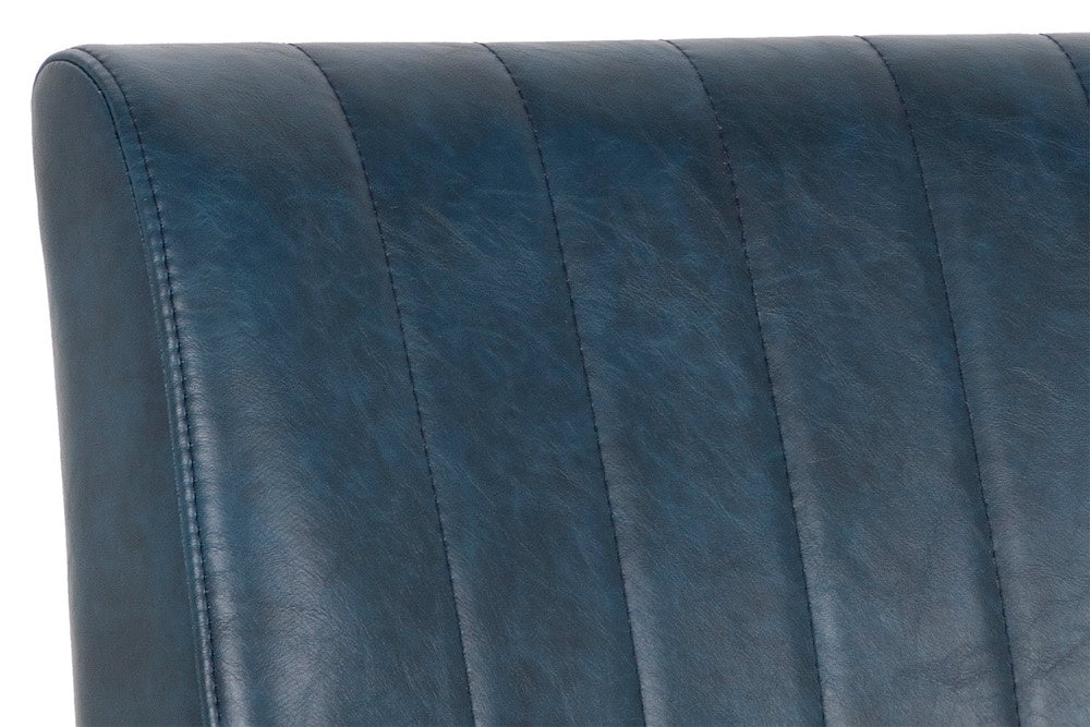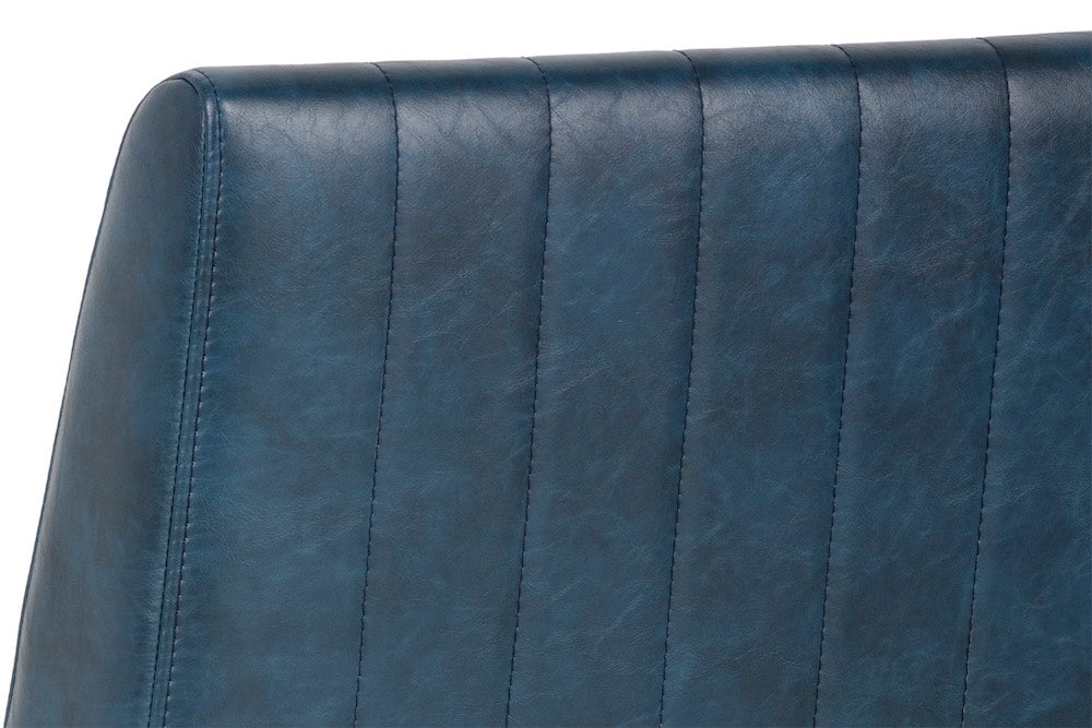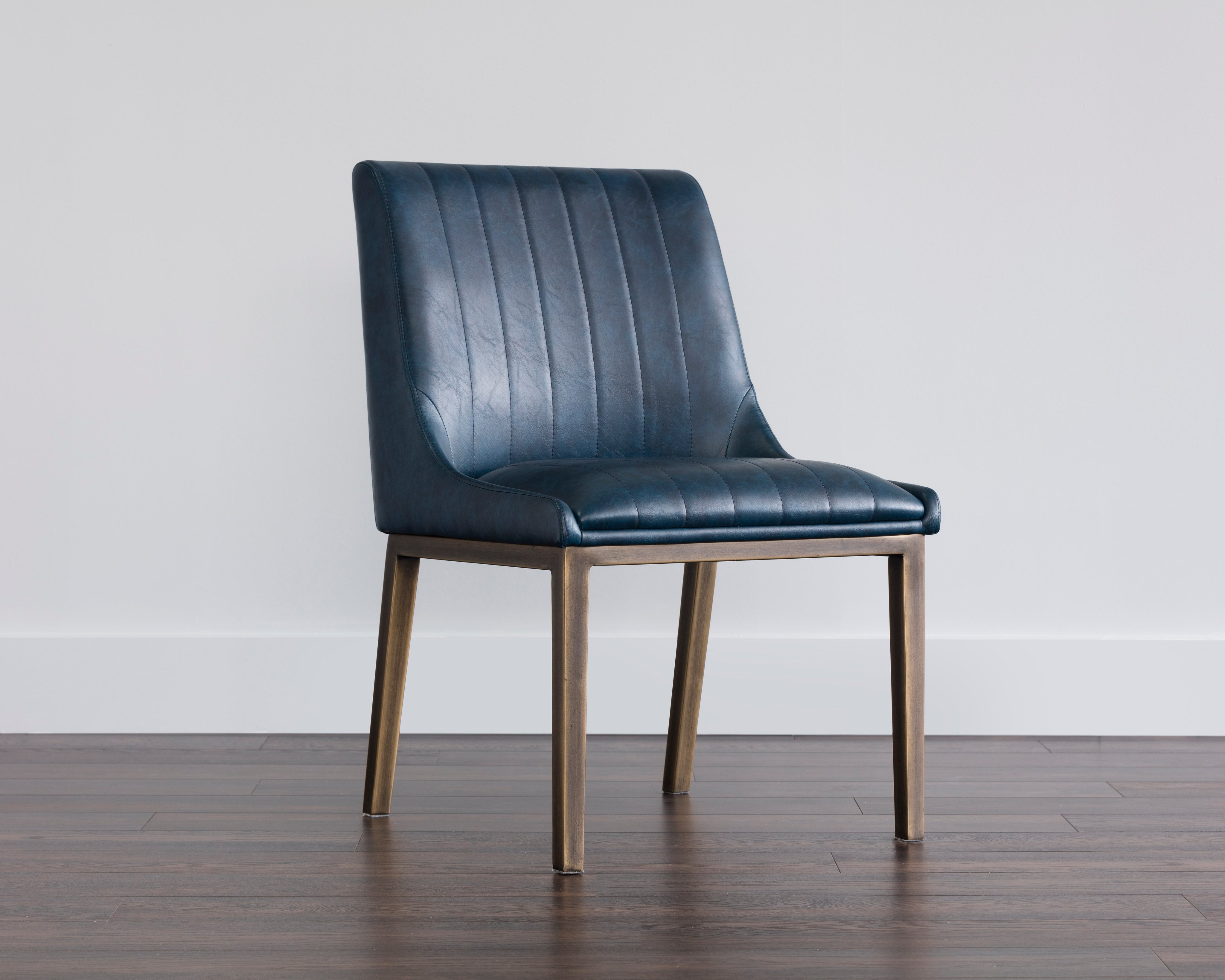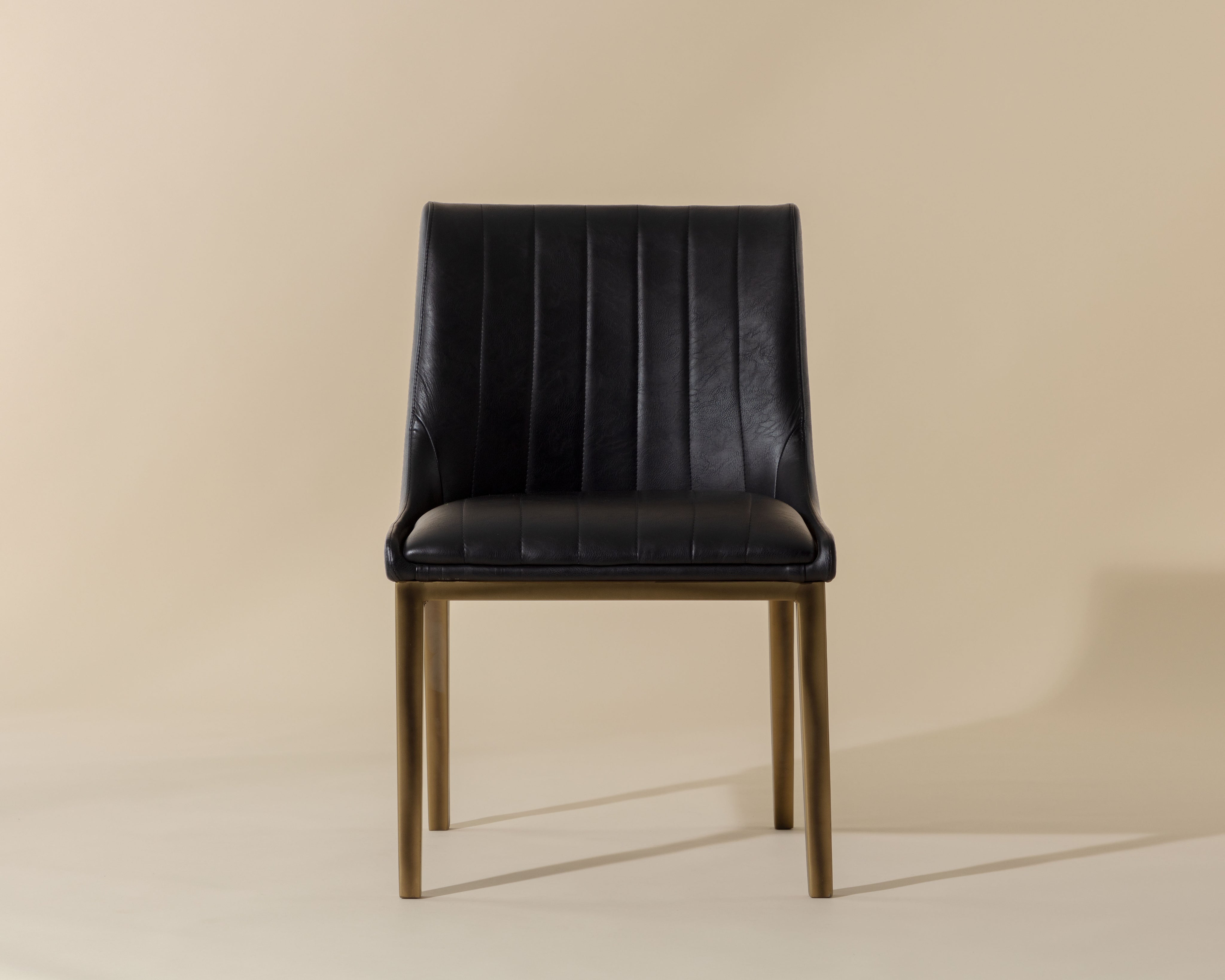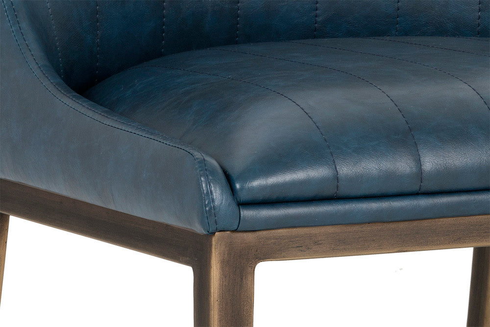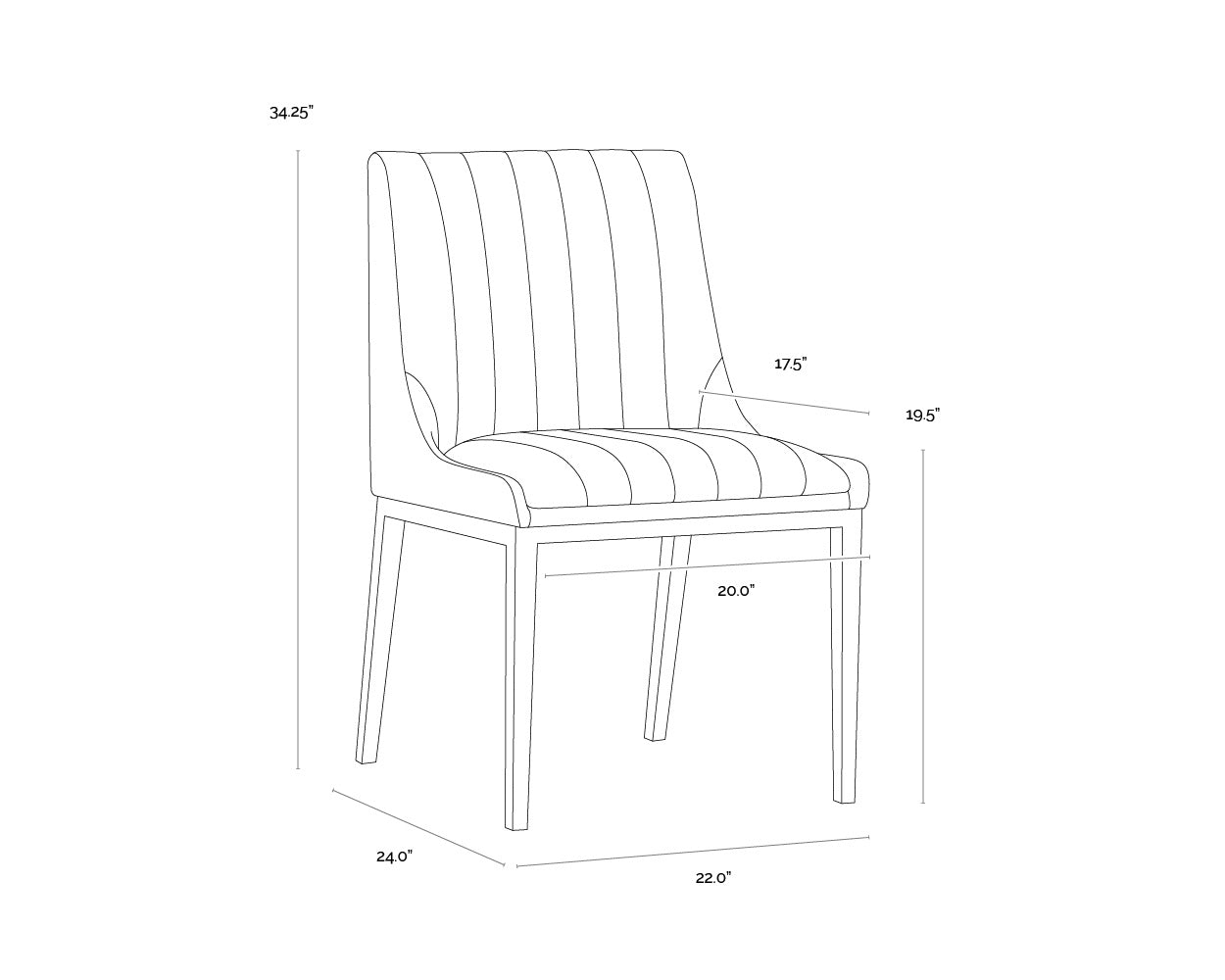 A sleek, urban designed dining chair featuring bold vertical stitching on the seat and back in a beige linen fabric. Finished with a rustic bronze steel frame. Place in dining and office spaces for a retro look.