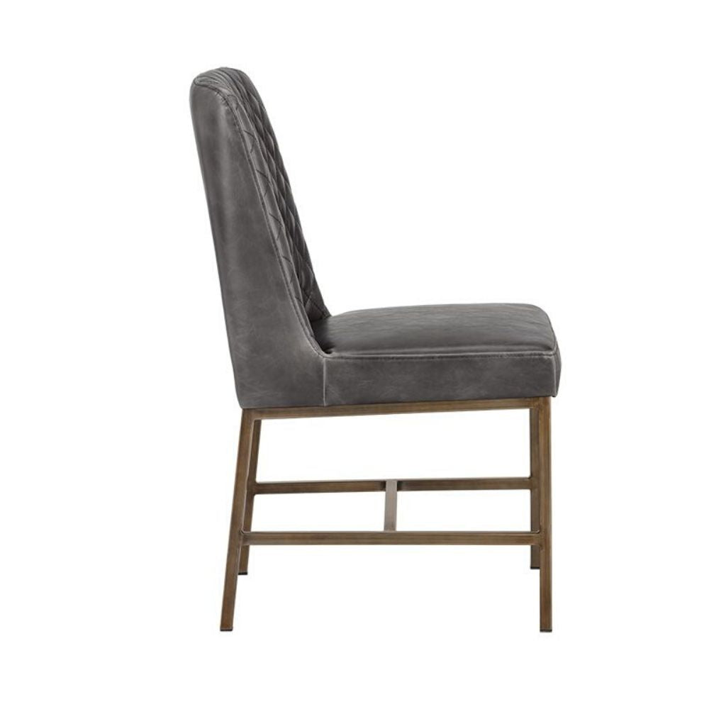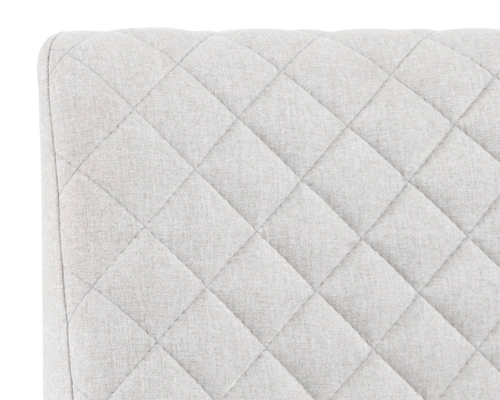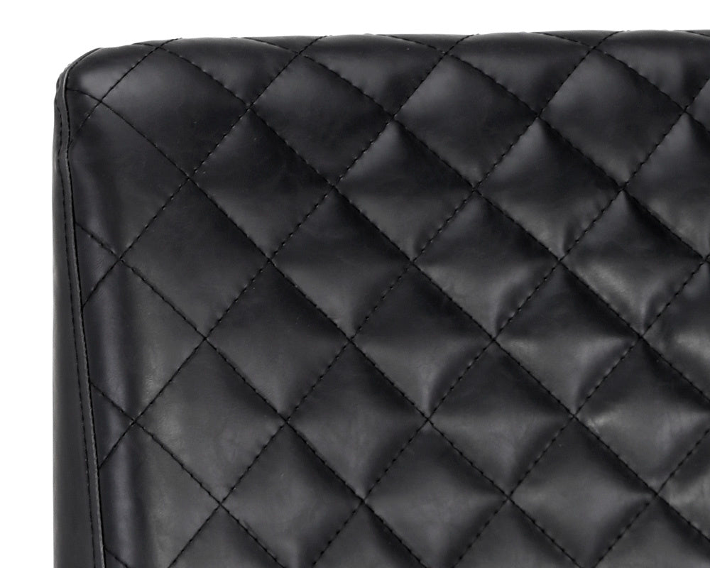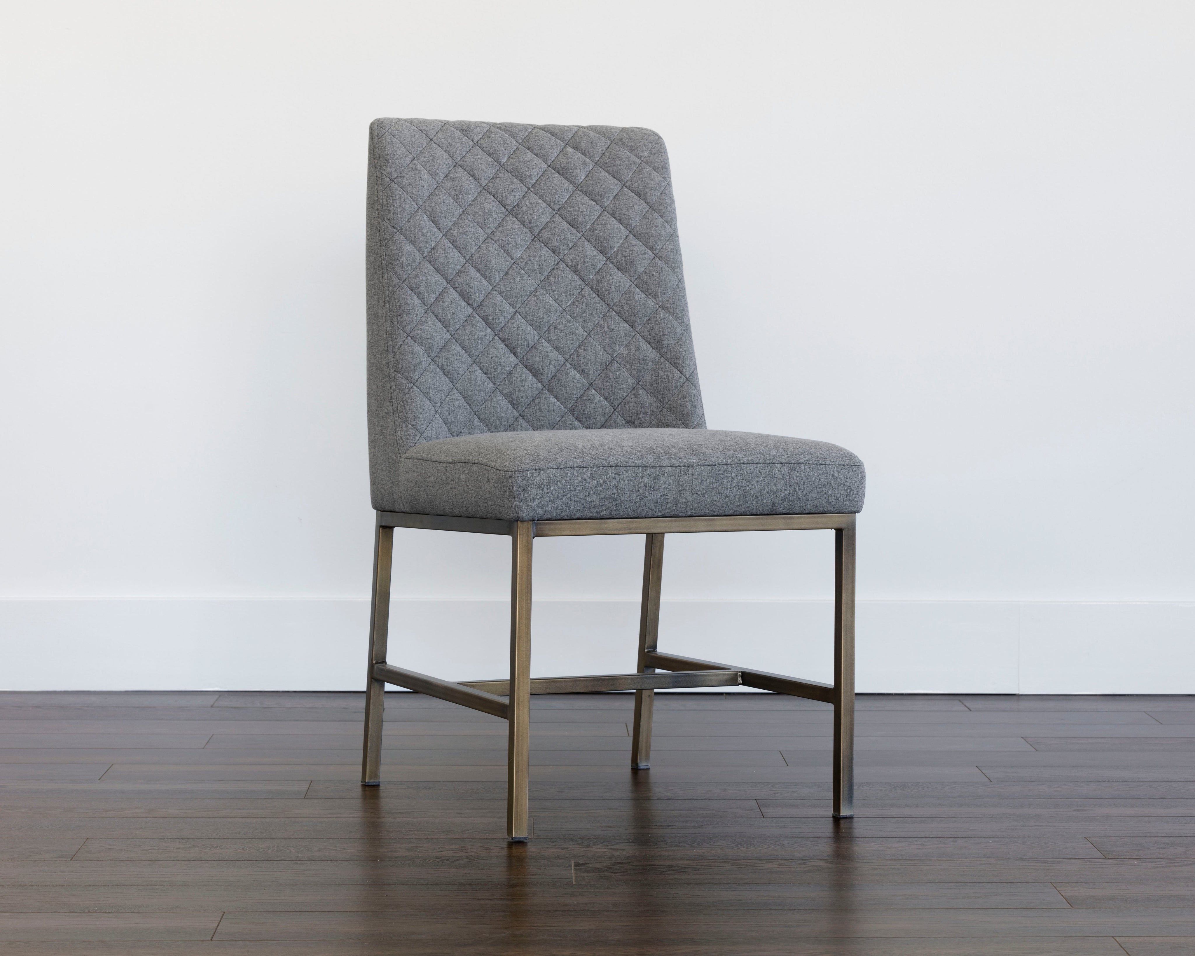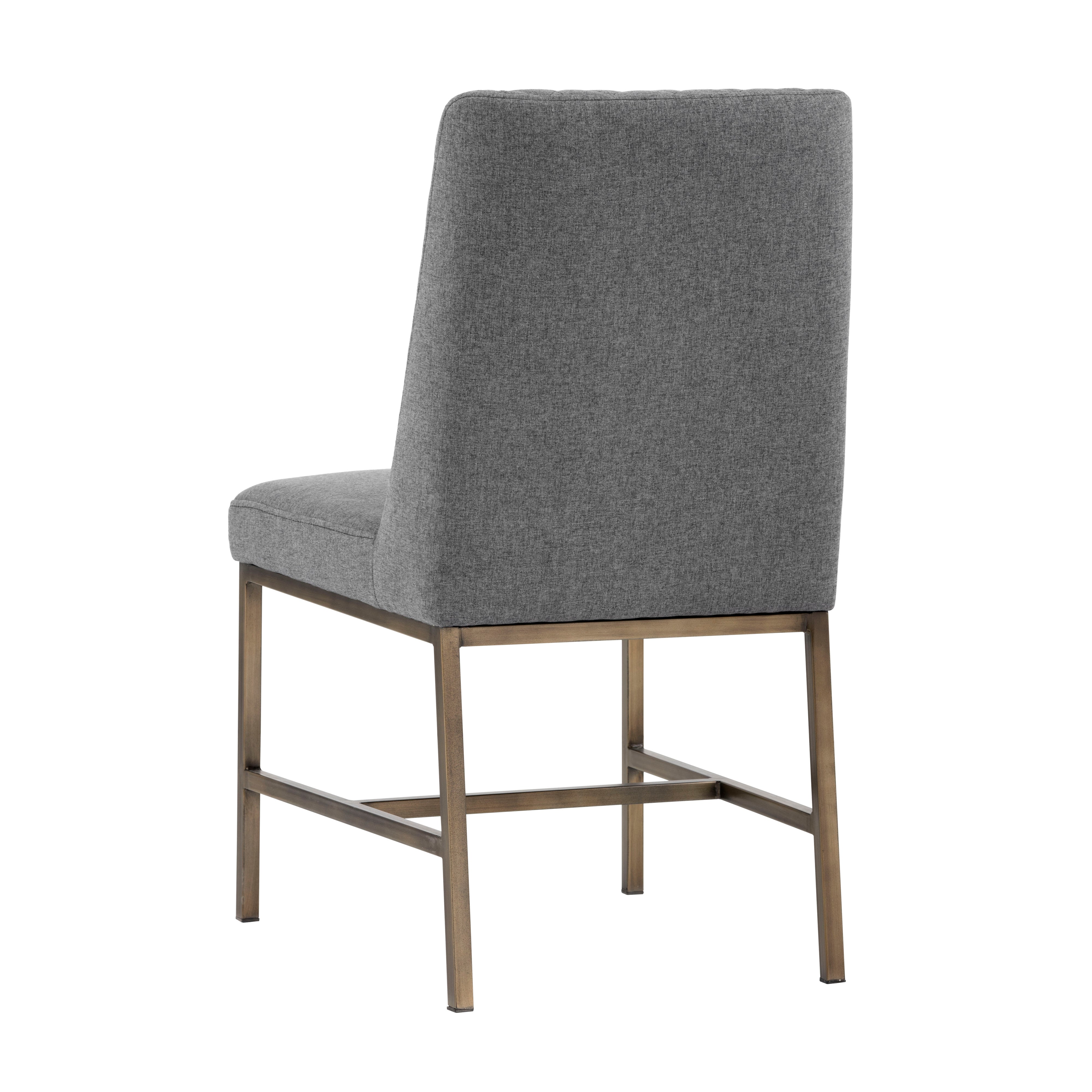 Invigorate dining spaces with this classic dining chair. Features beautiful diamond stitching on the interior seat back and an antique brass frame steel frame. Stocked in castillo cream faux leather.
