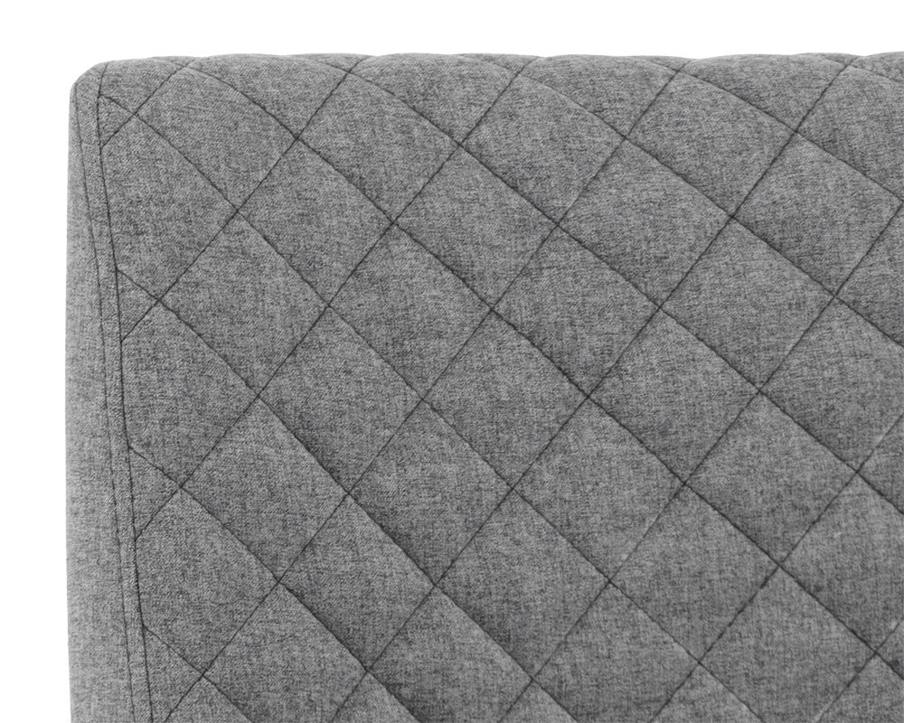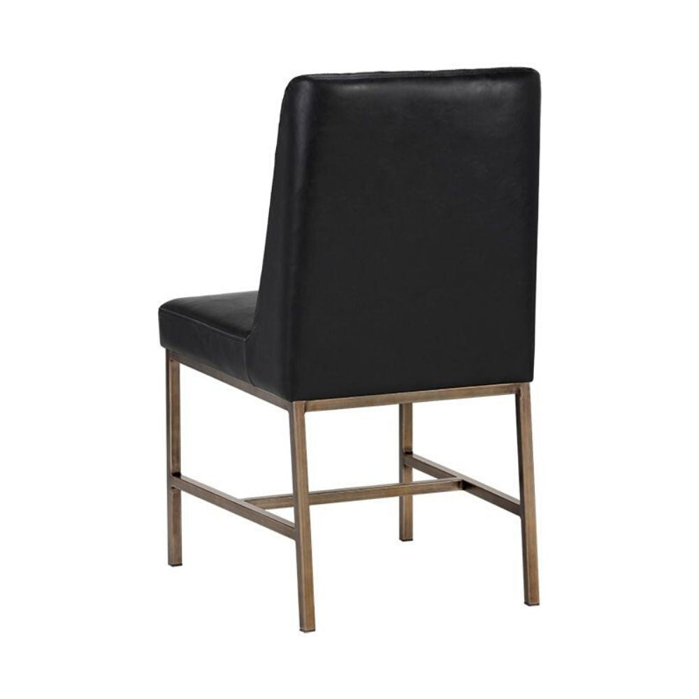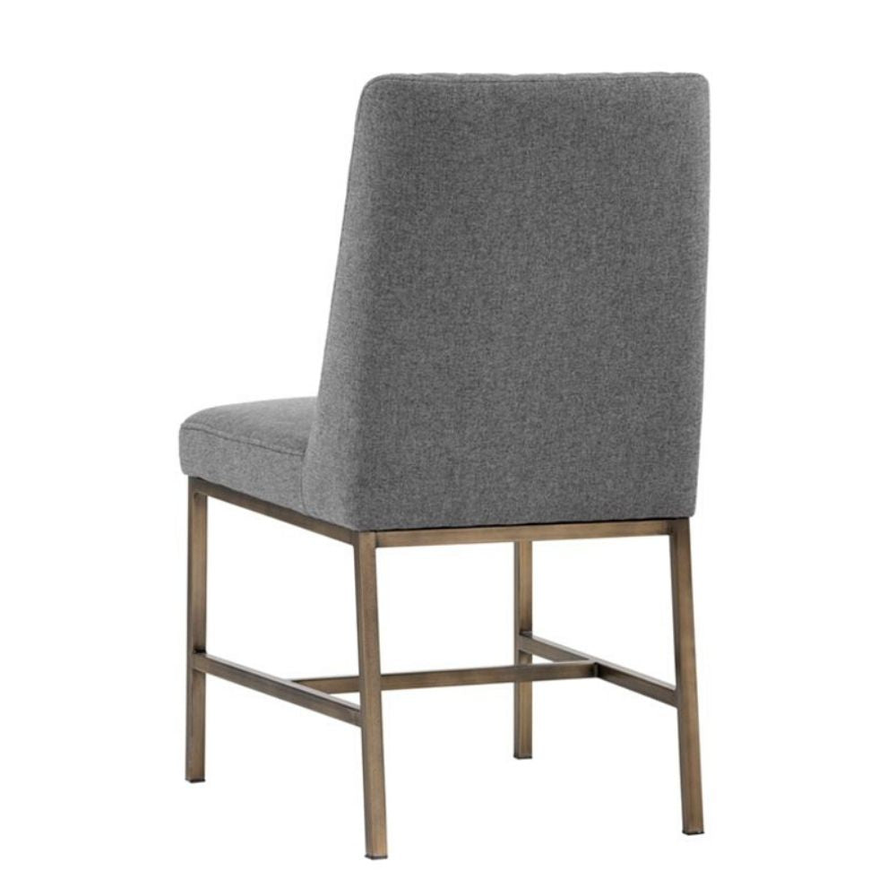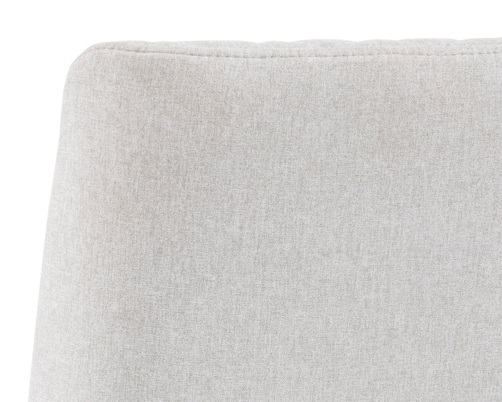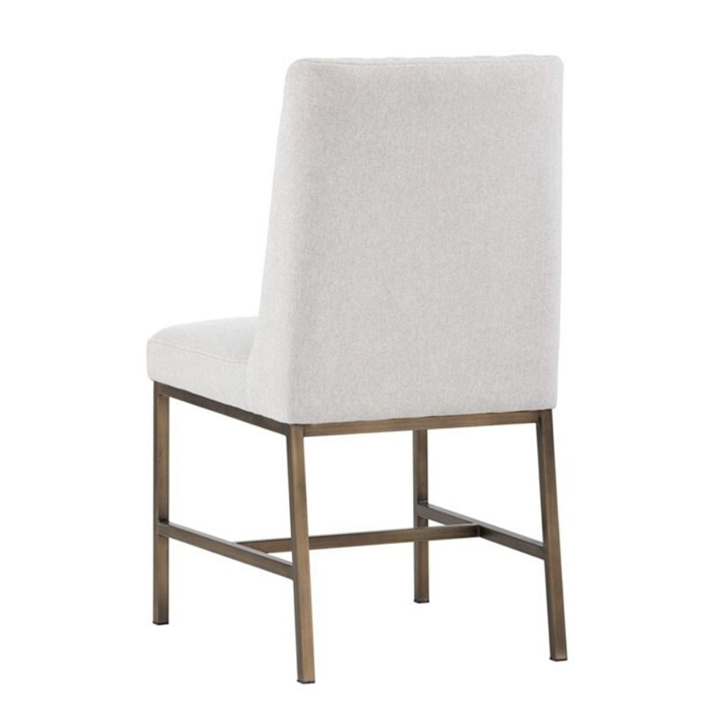Invigorate dining spaces with this classic dining chair. Features beautiful diamond stitching on the interior seat back and an antique brass frame steel frame. Stocked in castillo cream faux leather.