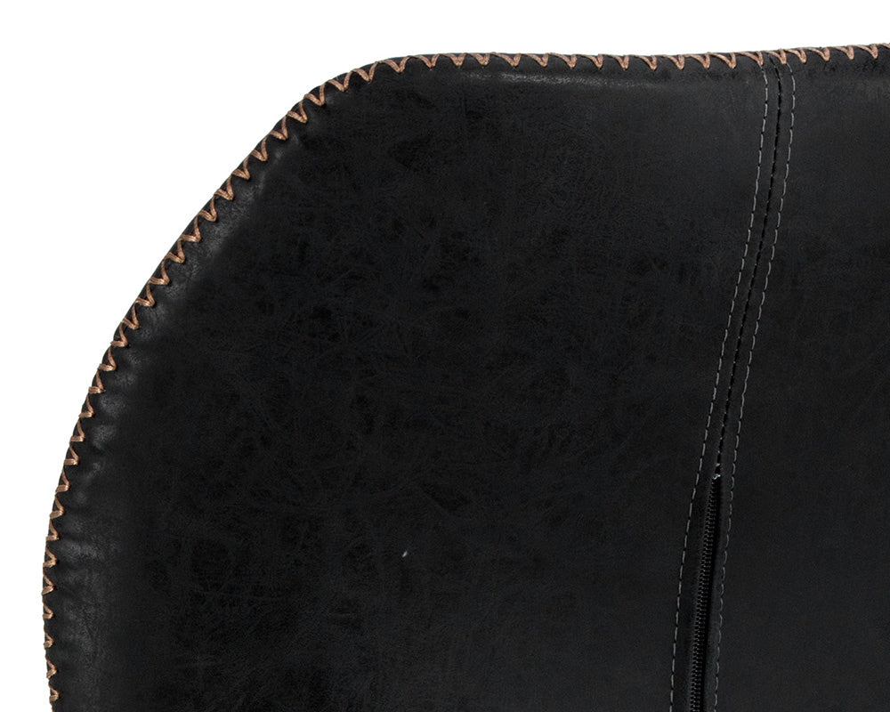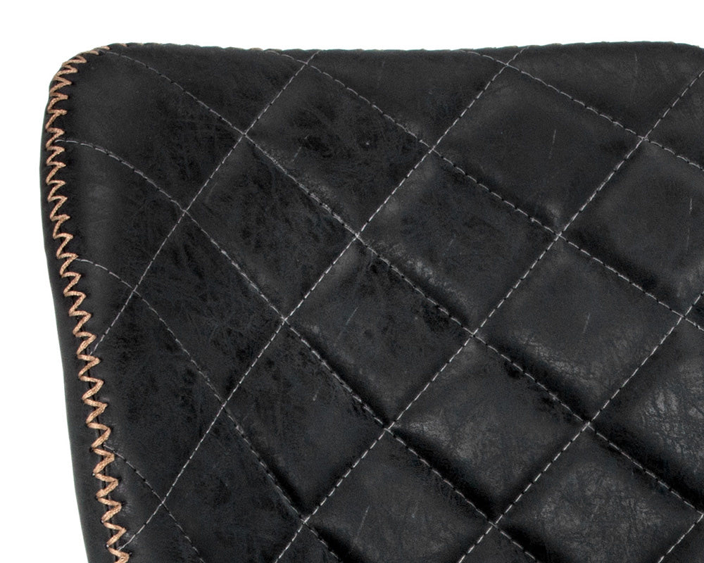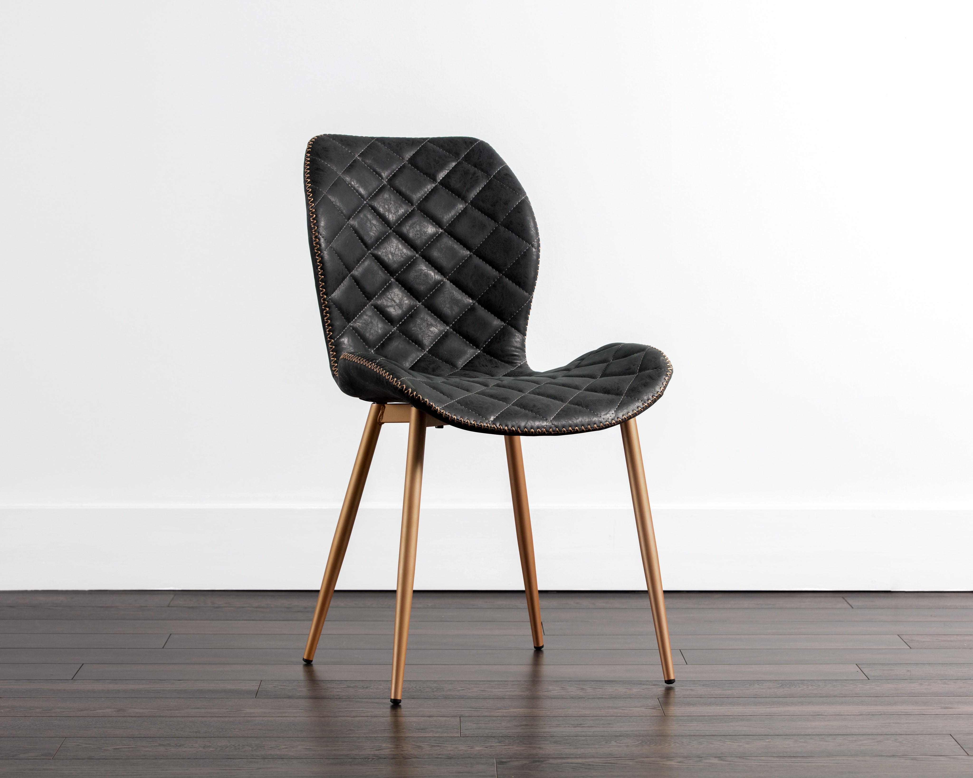 A chic and comfortable dining chair featuring beautiful diamond tufting and stylish zig-zag stitching on the seatback. Stocked in antique black faux leather with steel legs in a champagne gold finish.