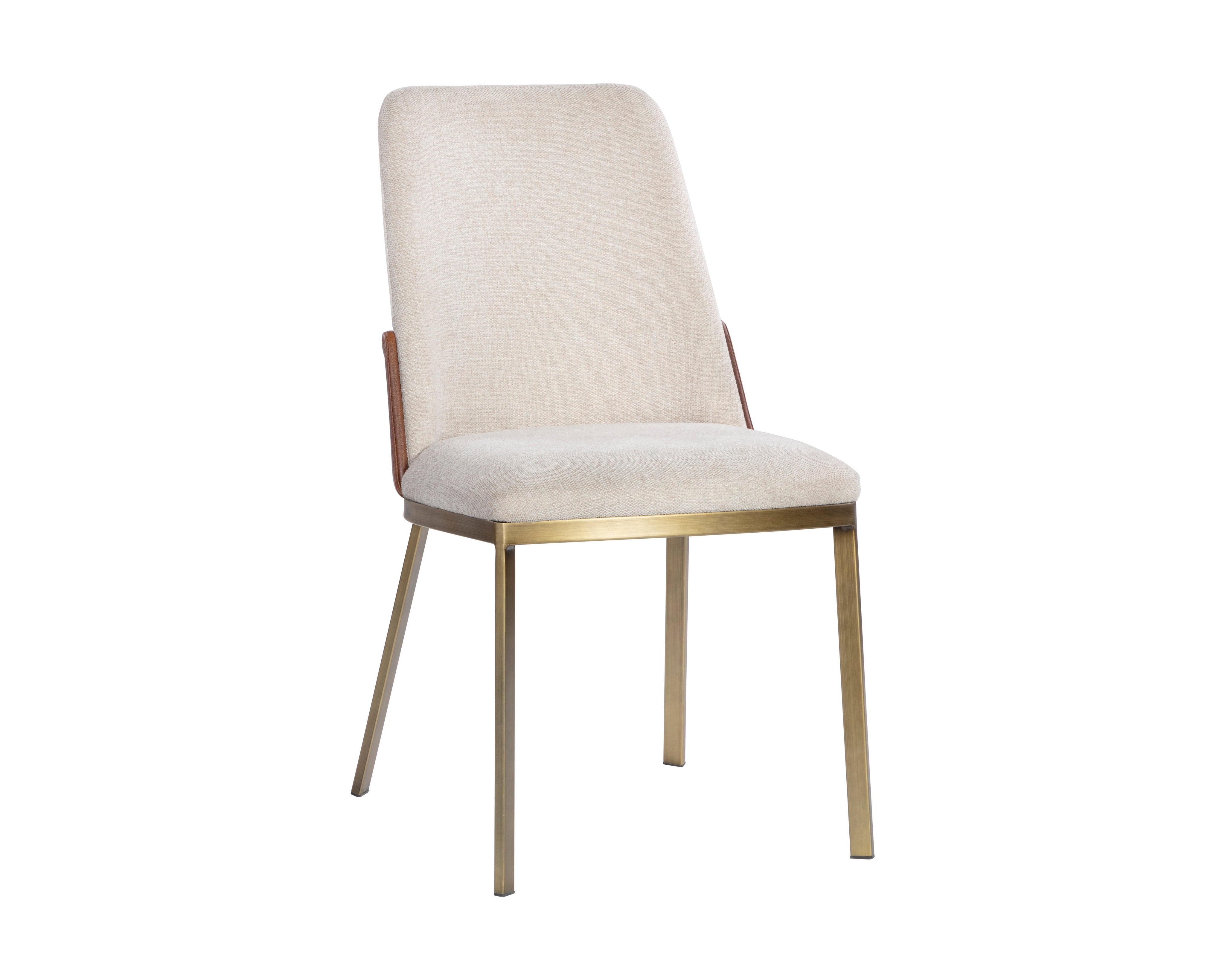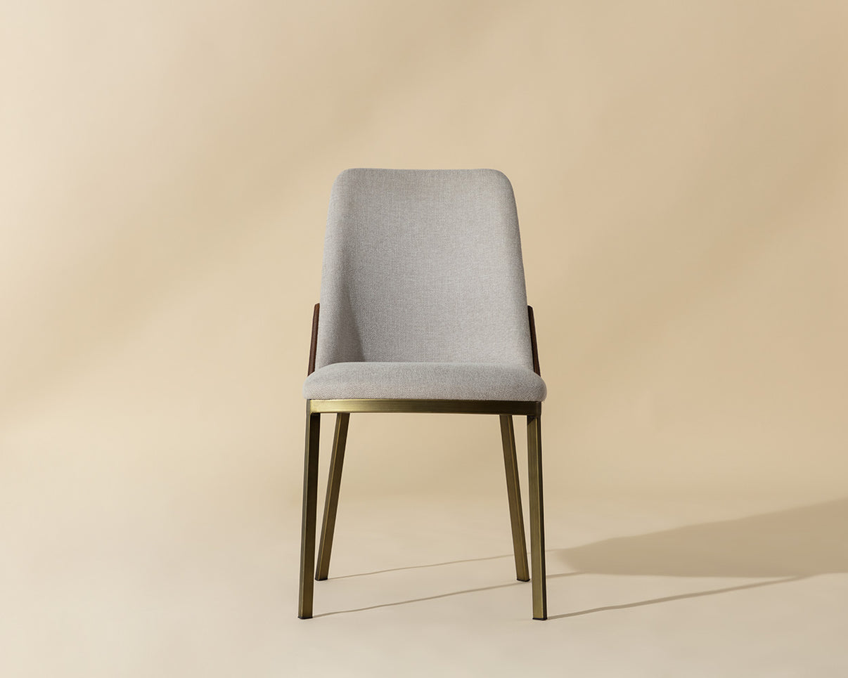 Make a bold statement with this modern dining chair that is full of luxe details. Stocked in belfast heather grey fabric with accenting on the back in bravo metal faux leather. Finished with brushed steel legs in antique brass.
