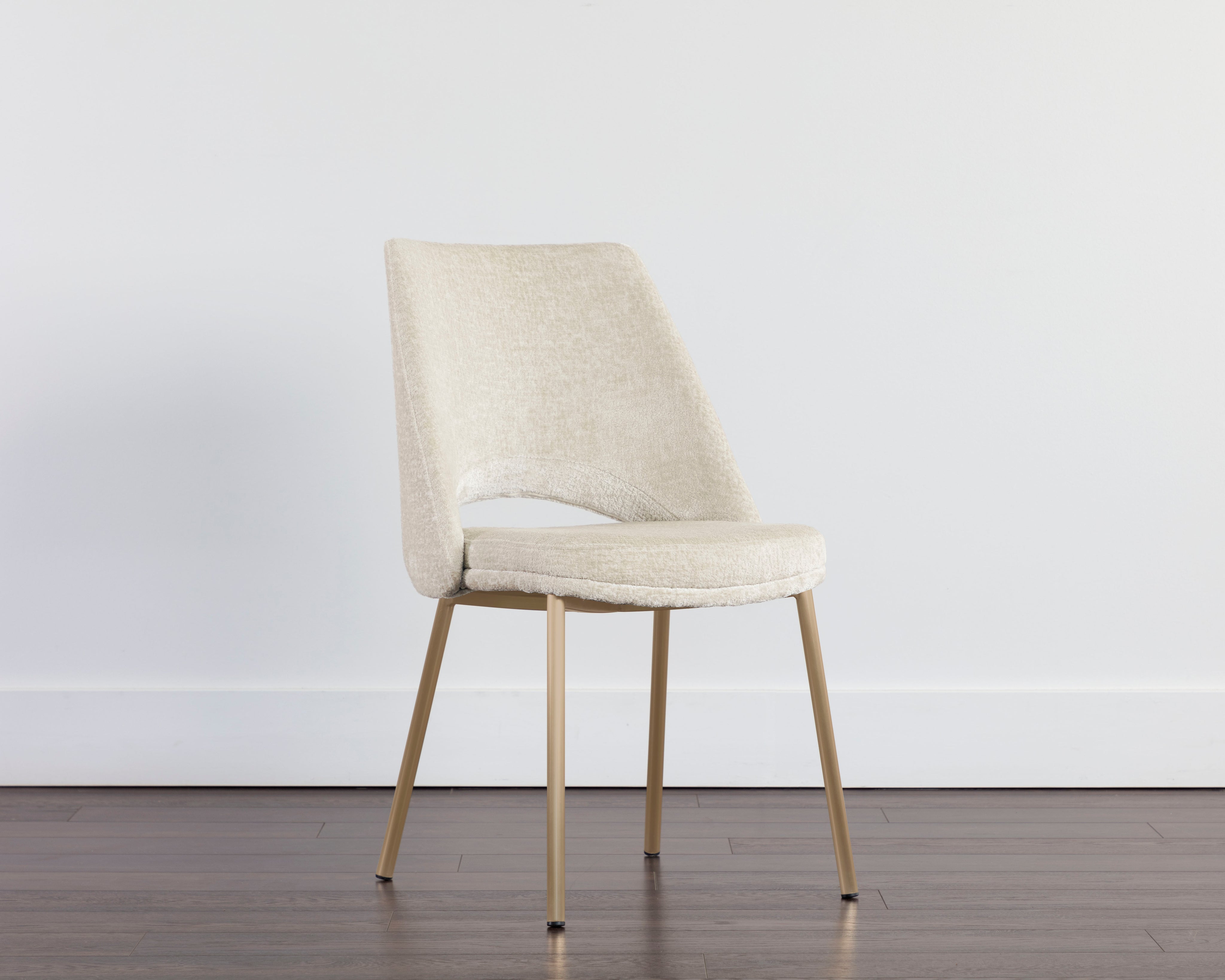 Dashing with contemporary style, this dining chair is designed with a refined touch. Upholstered in bergen french blue fabric with a stylish cutout on the seatback. Completed with an antique brass stainless steel base.