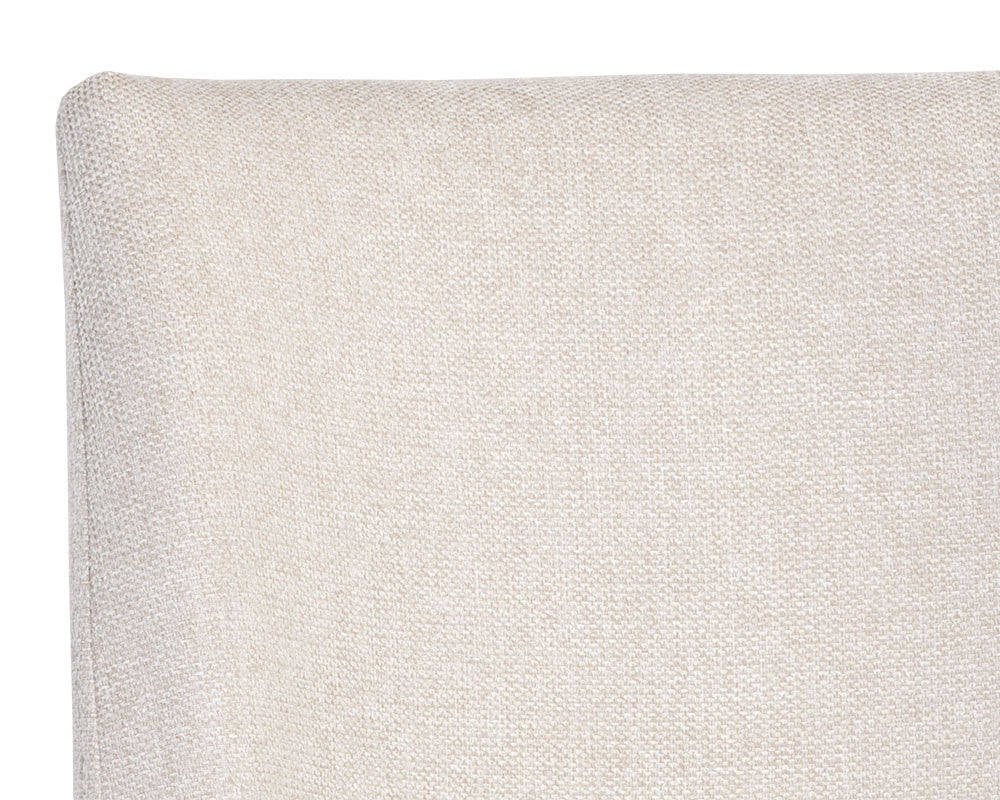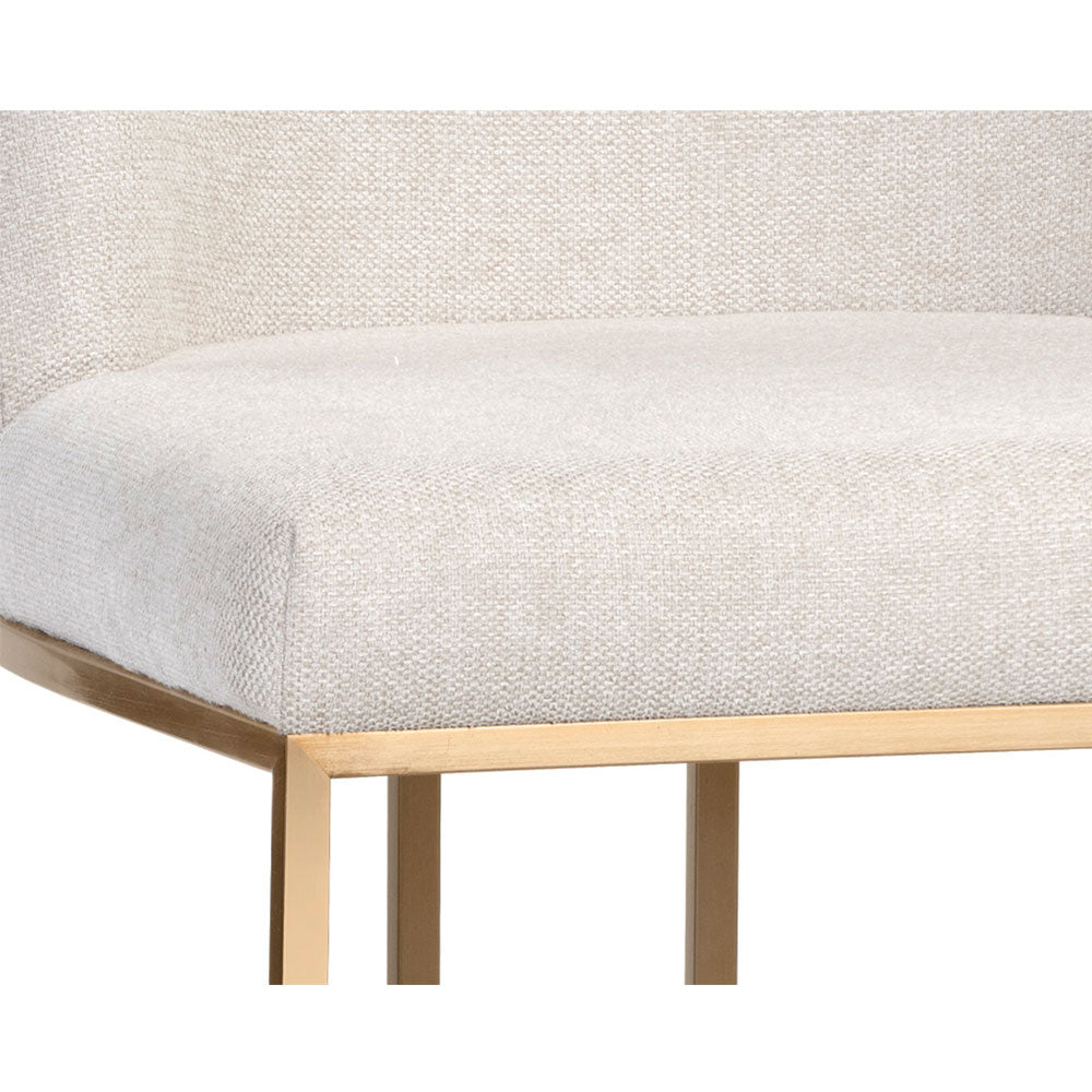 An elegant cantilever dining chair designed with soft, textured belfast oatmeal fabric and an exposed antique brass stainless steel frame.