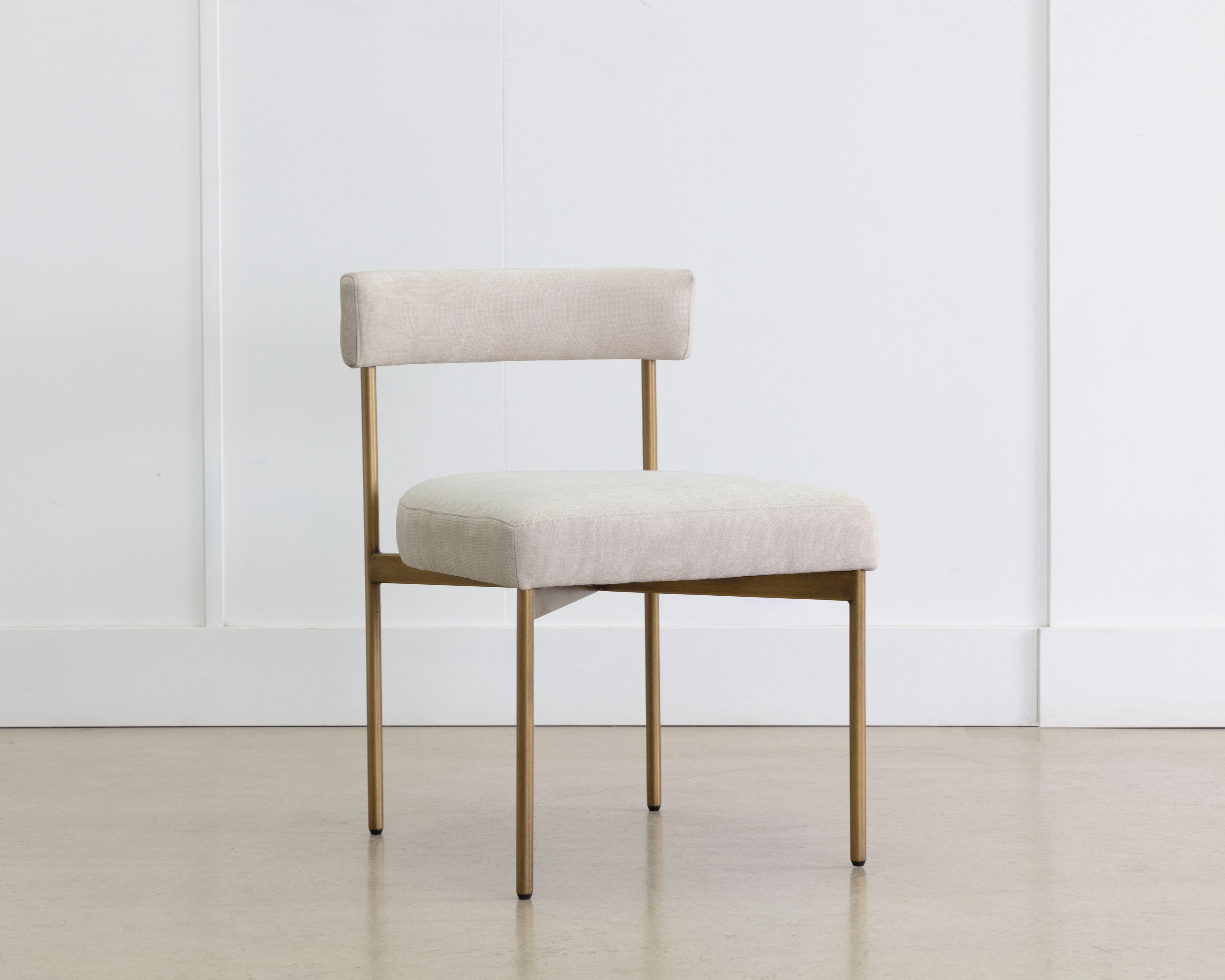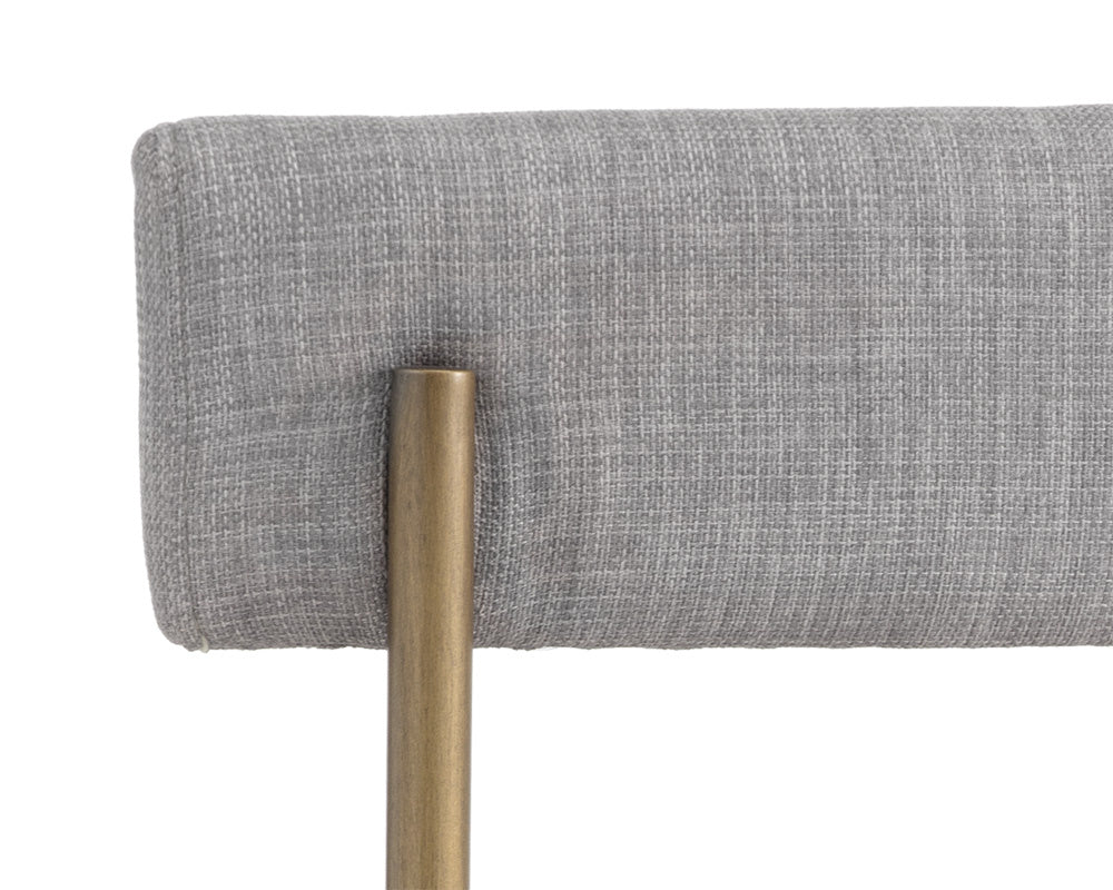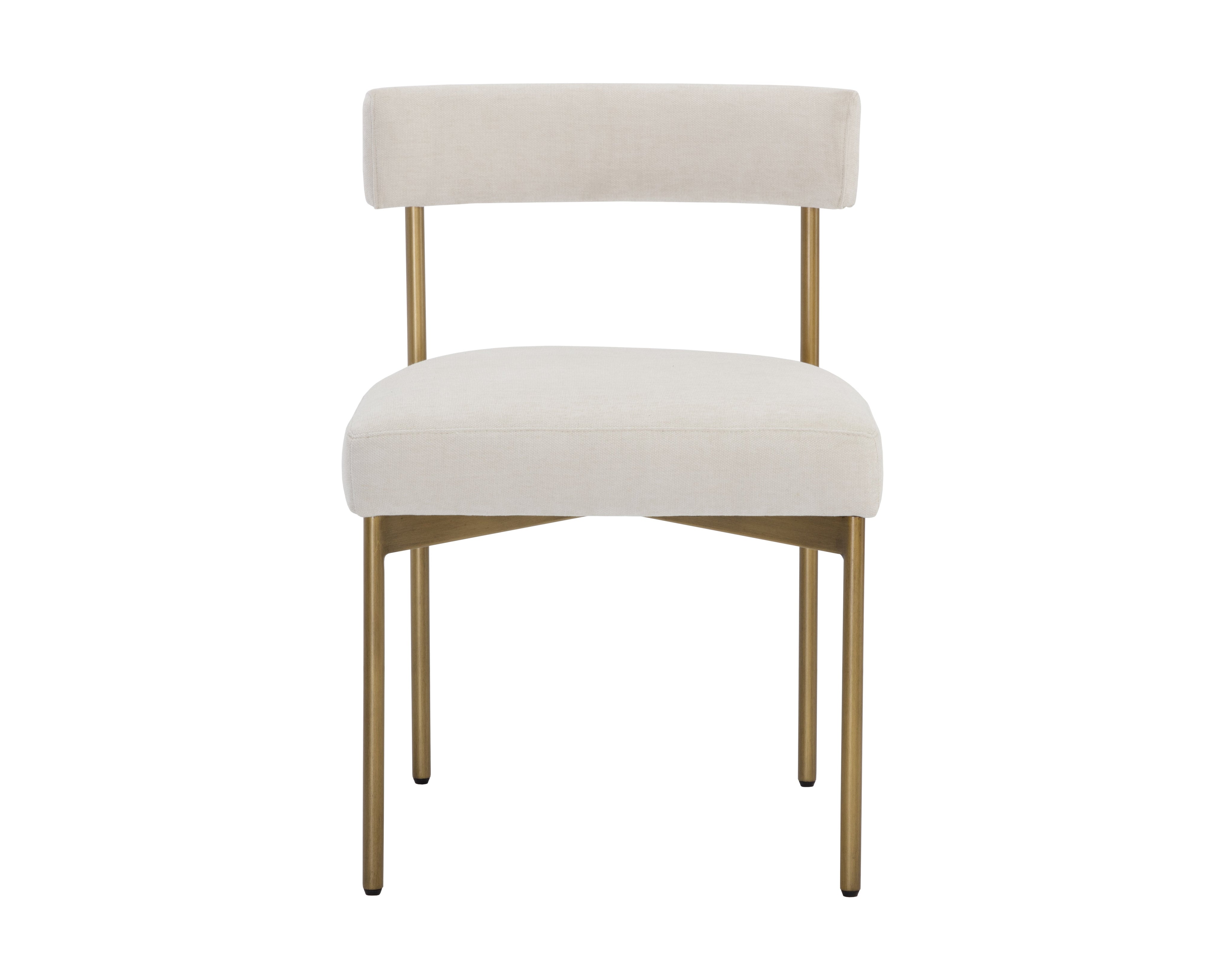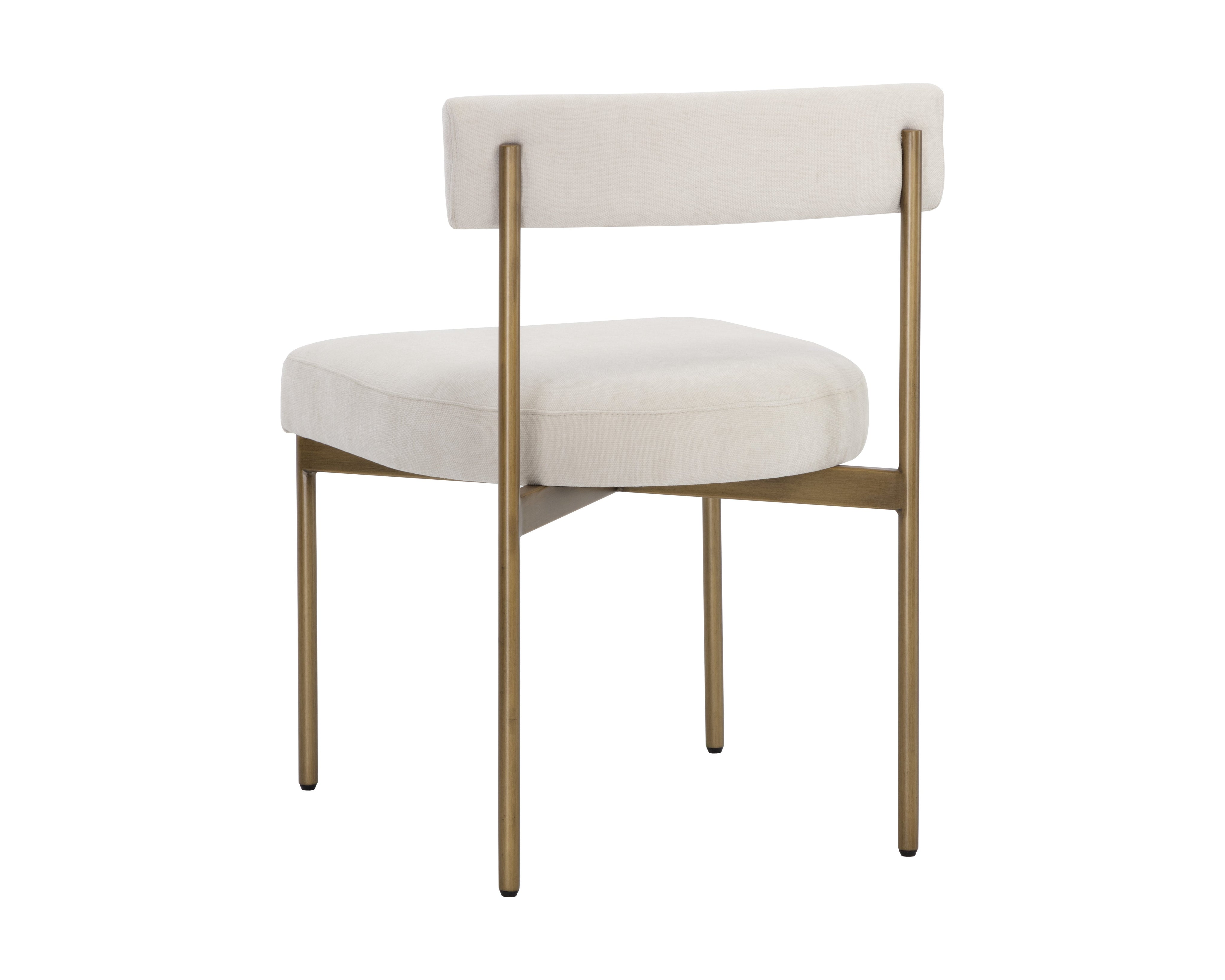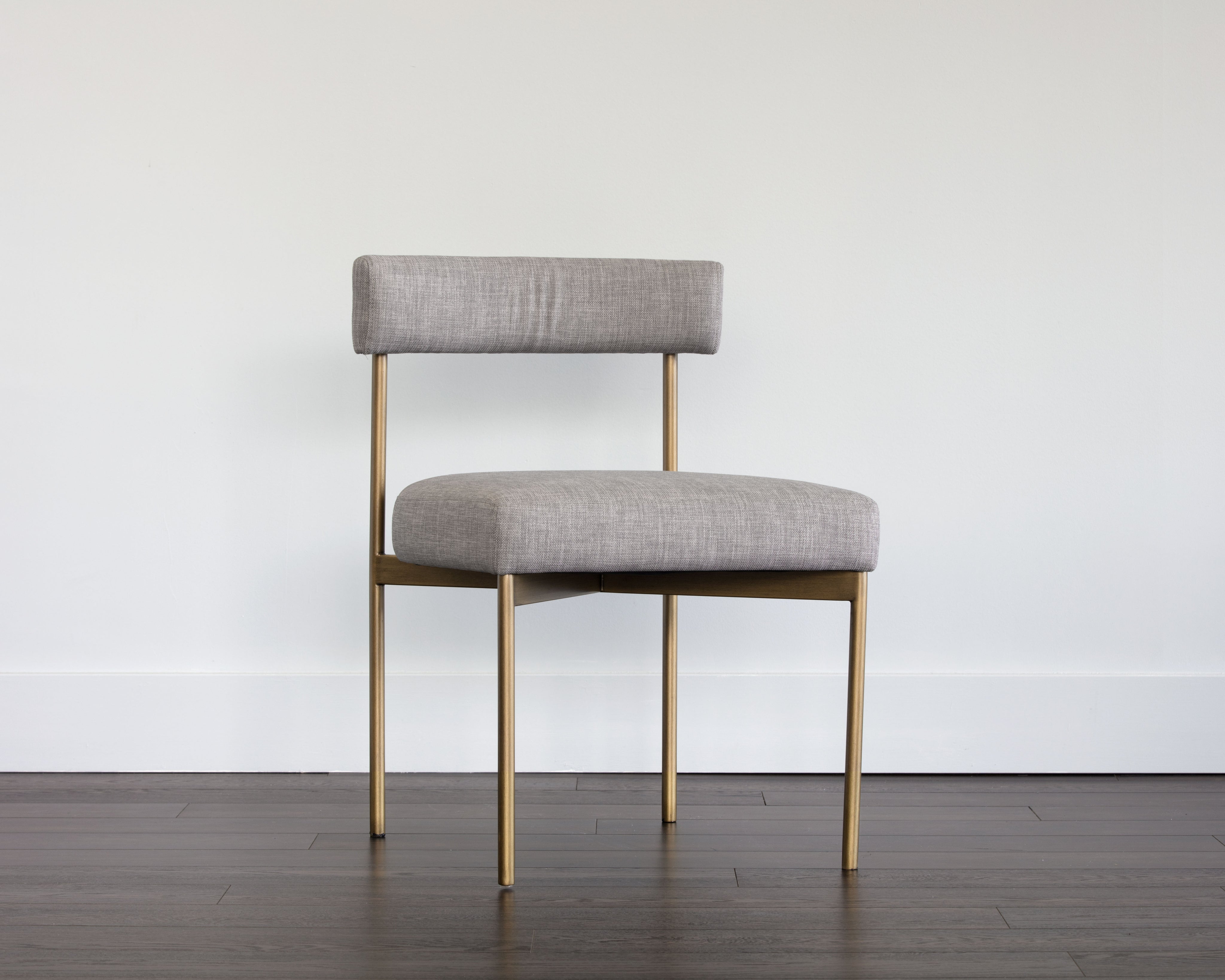 Exude modern style with this open back dining chair. Stocked in arena cement fabric with an antique brass steel frame.