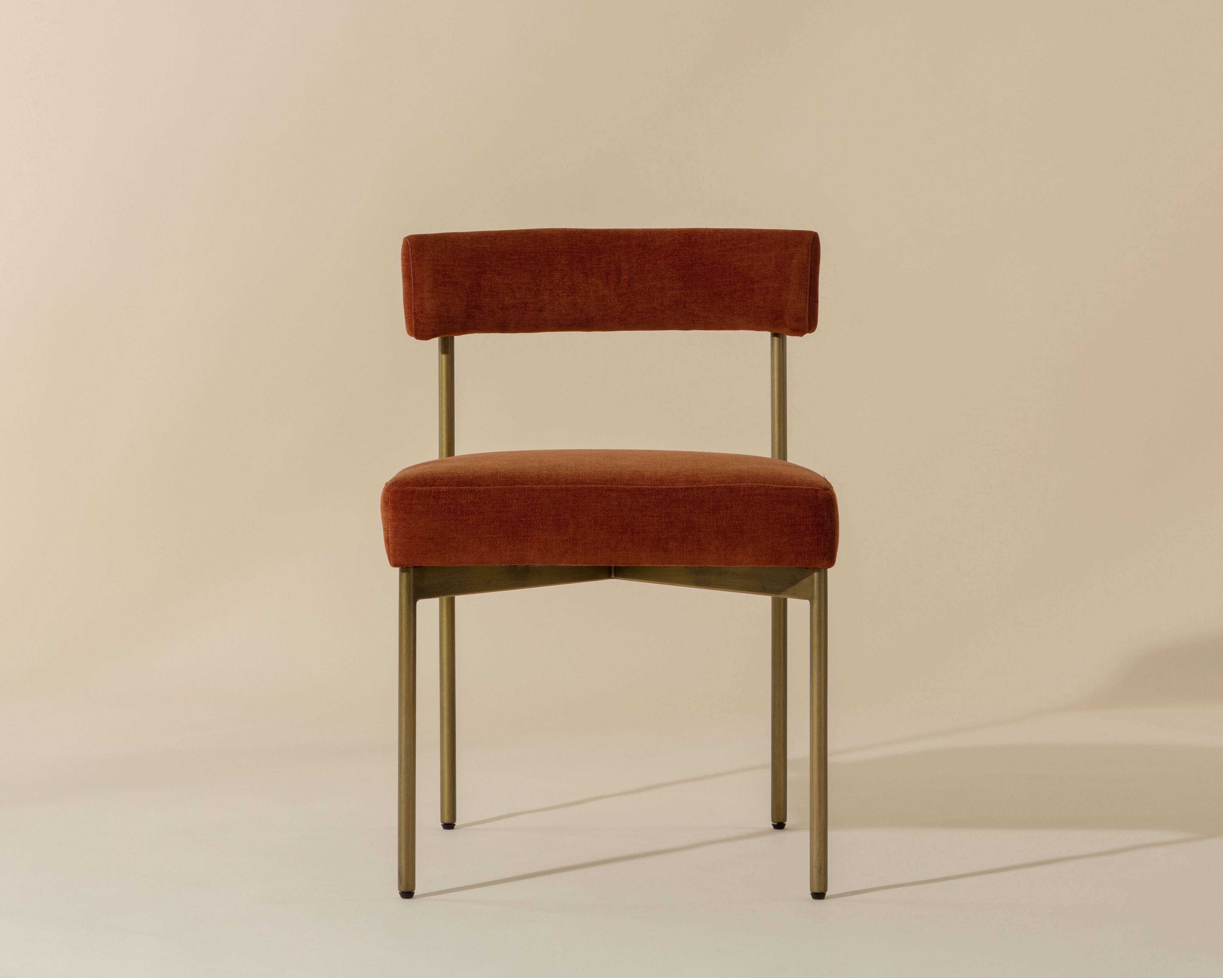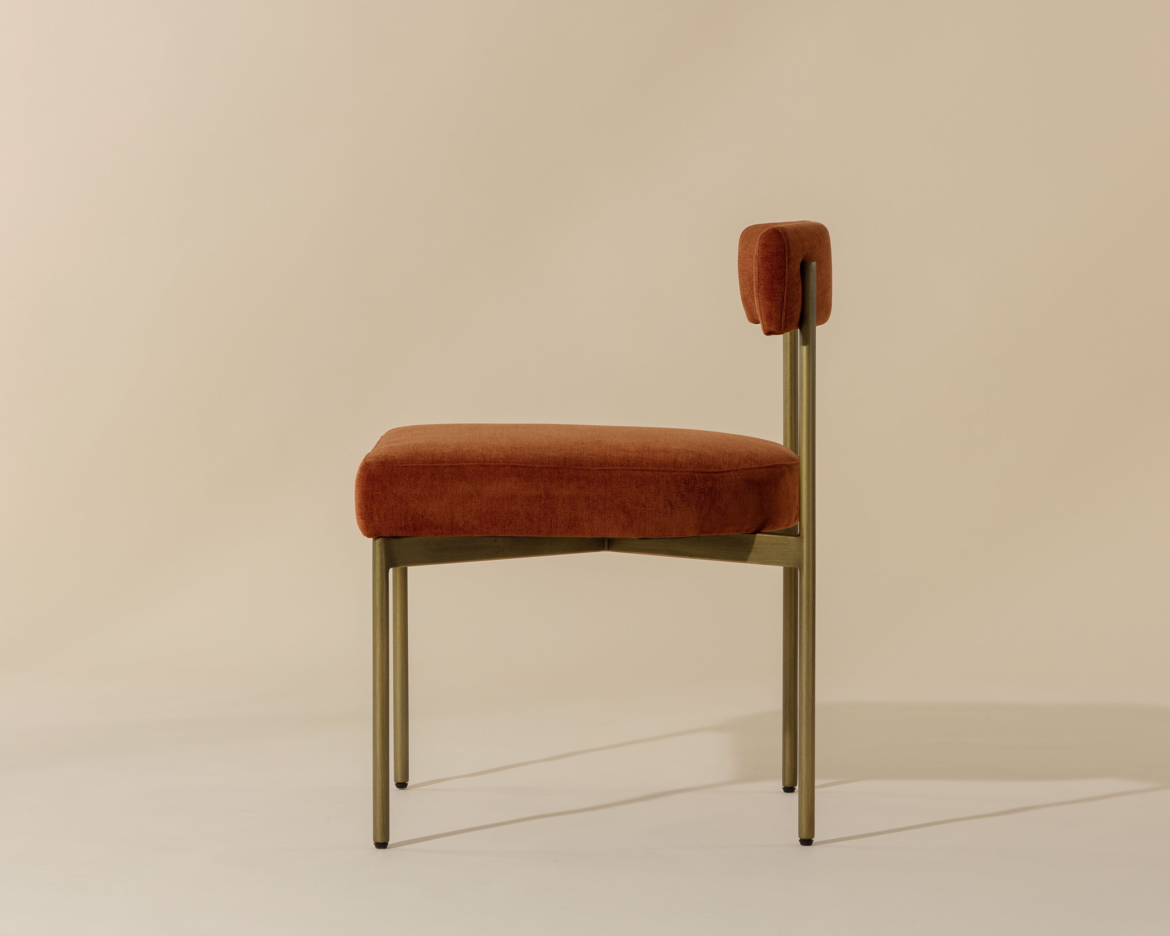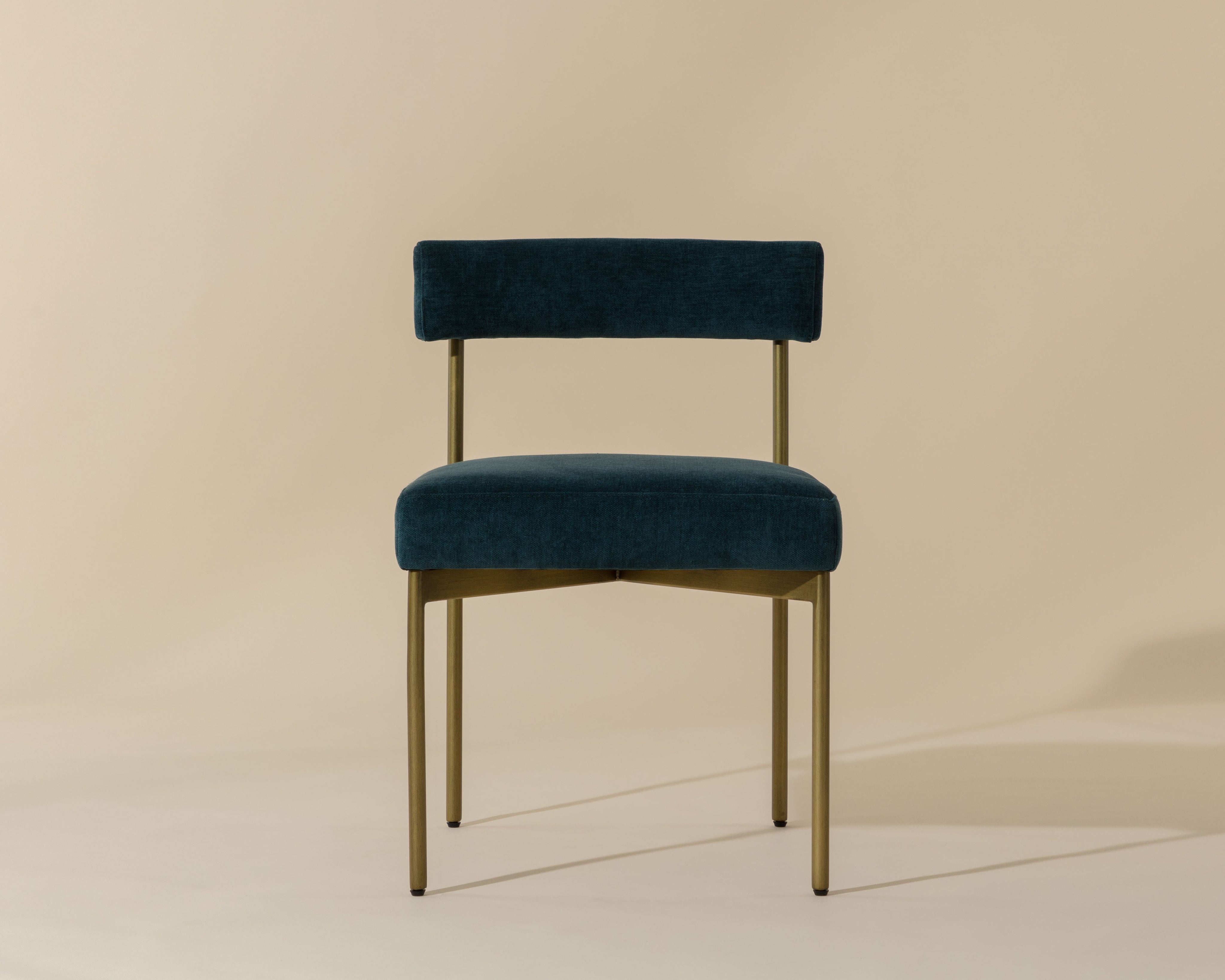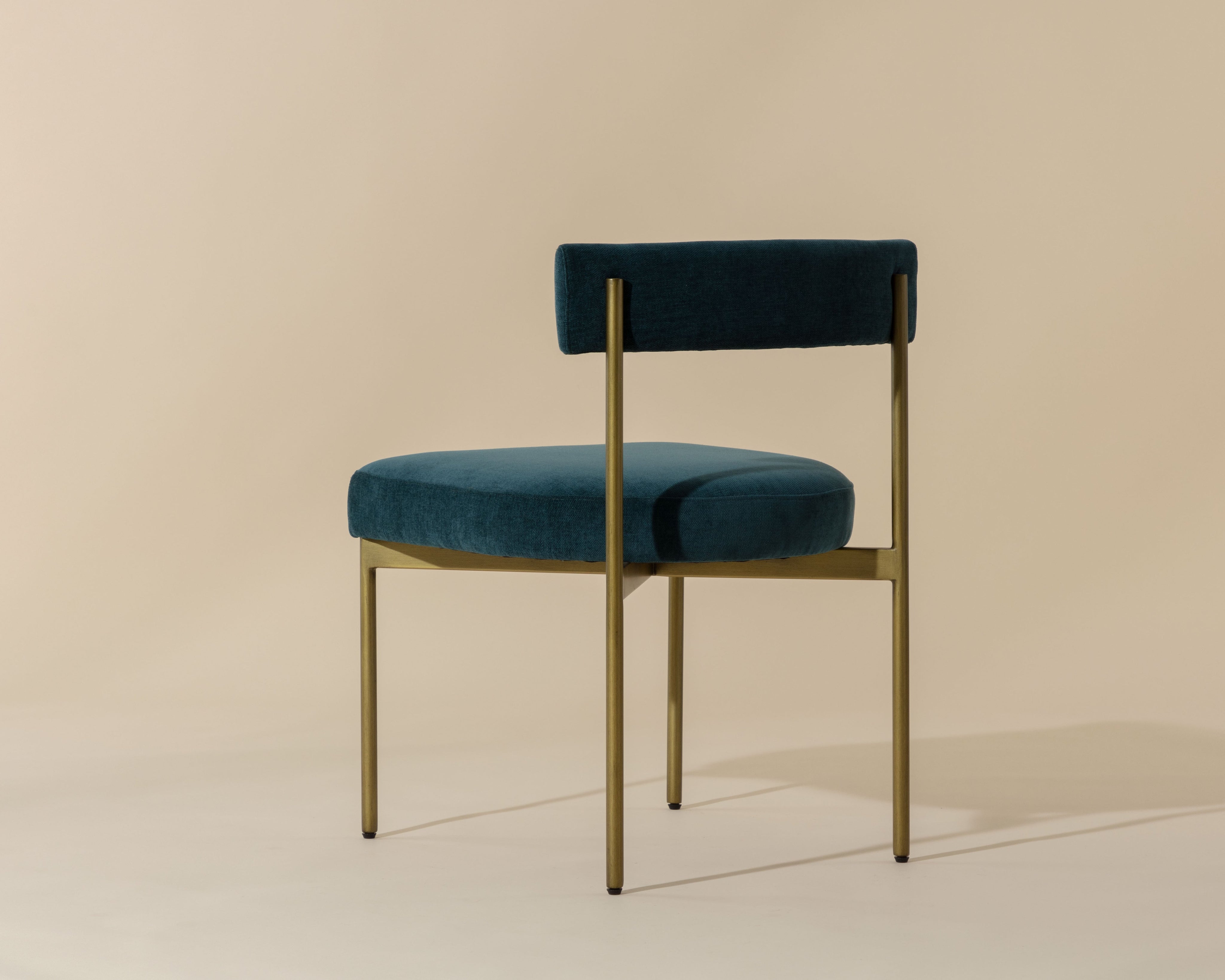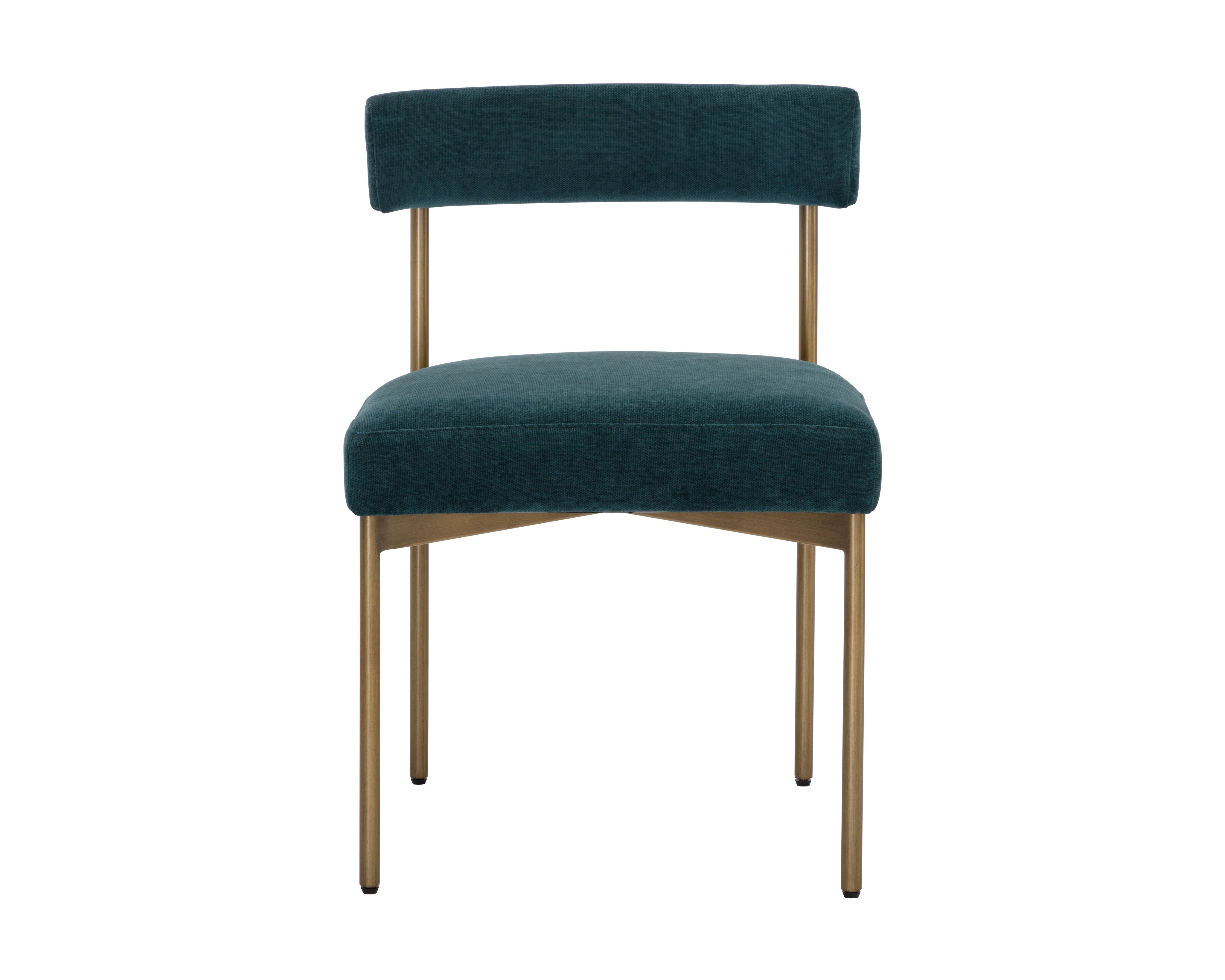 Exude modern style with this open back dining chair. Stocked in arena cement fabric with an antique brass steel frame.