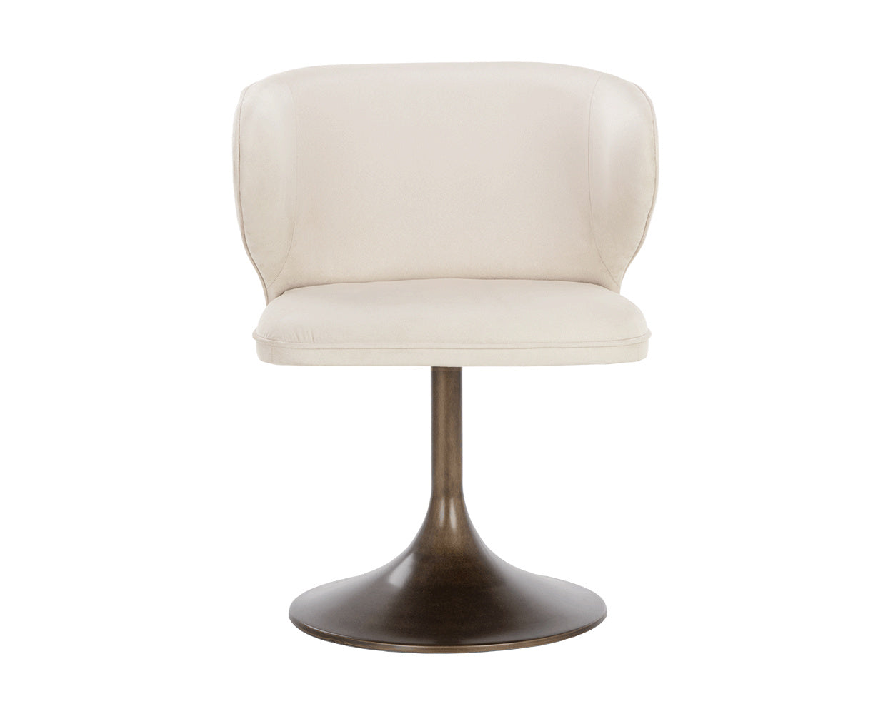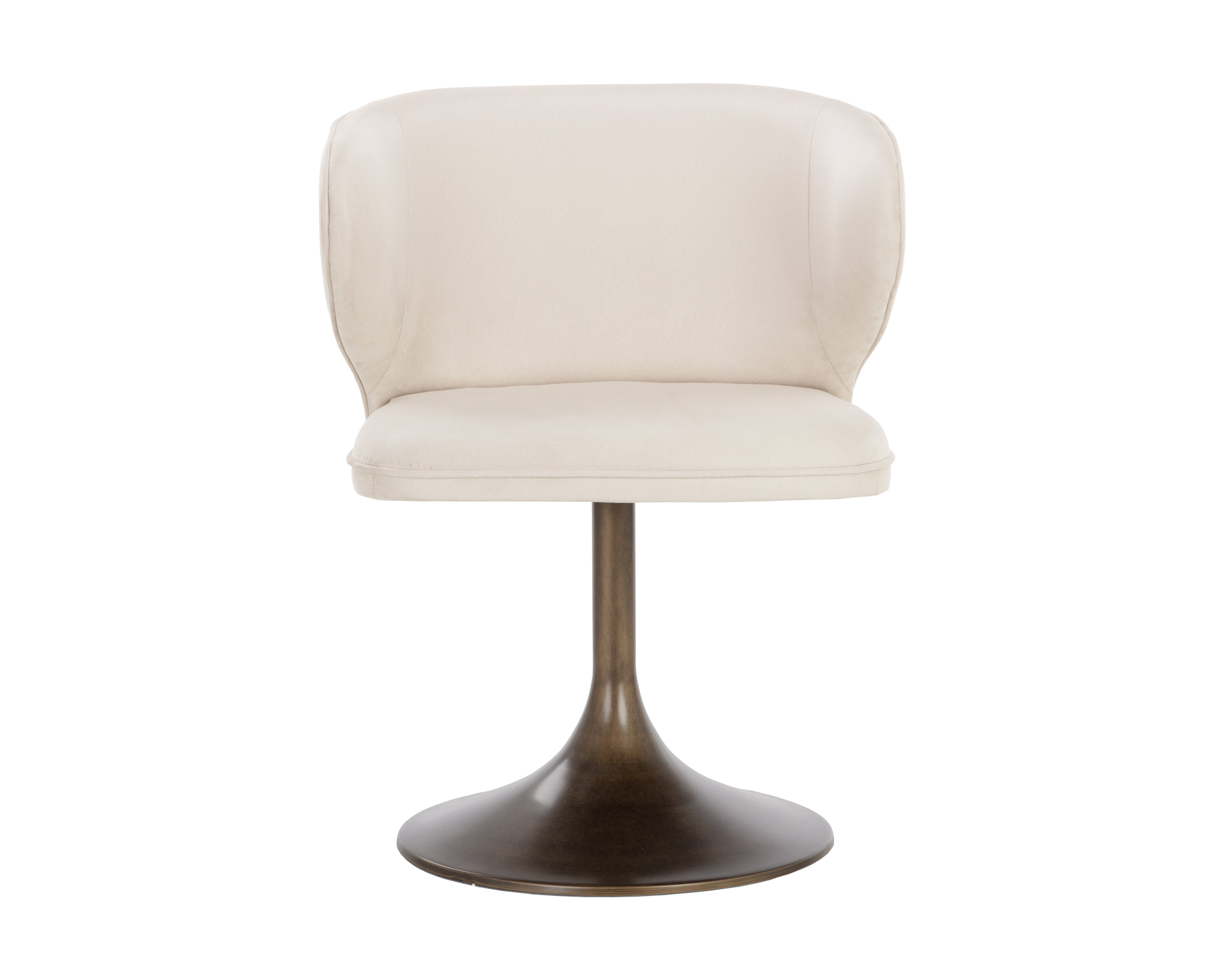 Create a captivating dining space with this eye-catching swivel dining chair that has a contemporary flair. Stocked in casablanca cloud performance fabric and completed with a round, antique brass stainless steel base. Performance fabric is moisture repellent, durable and easy to clean.
