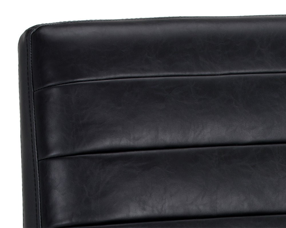 A masculine and modern dining chair. Features horizontal channel tufting on the interior seat and seatback with a sleek black powder-coated steel frame. Stocked in coal black faux leather. Handle With Care: This design has been crafted with faux leather. Faux leather is manufactured to reflect the natural characteristics of leather; as such, colour variations, markings, wrinkles, grooves, and light scratches are appreciated characteristics. No two pieces will be alike. Visit our Product Care page for more information on how to ensure the lasting beauty of this piece.