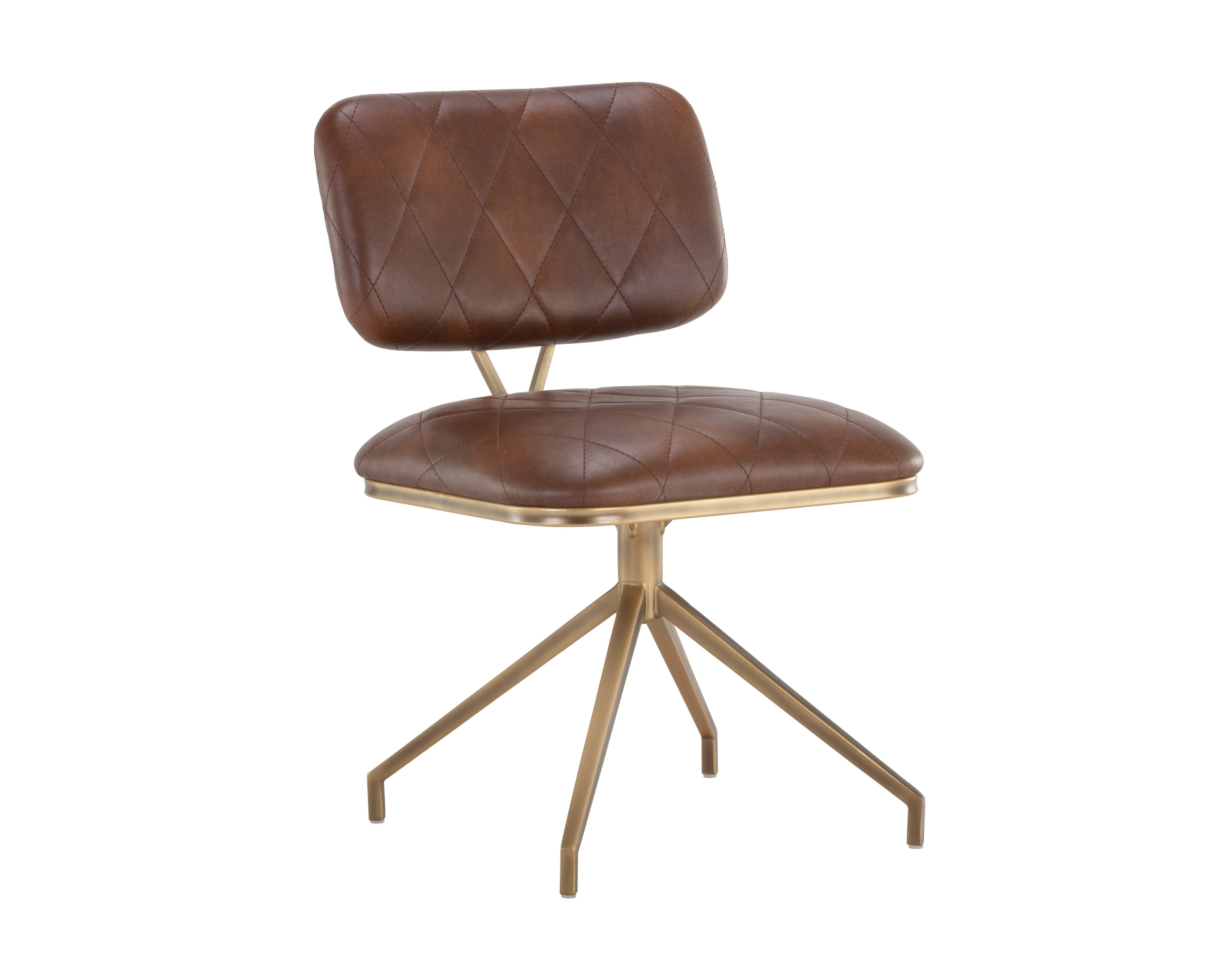 A sweet, compact swivel dining chair perfect for living, dining, lounge and small environments. Features diamond tufting on the seatback and a rustic bronze frame. Stocked in bravo black faux leather.