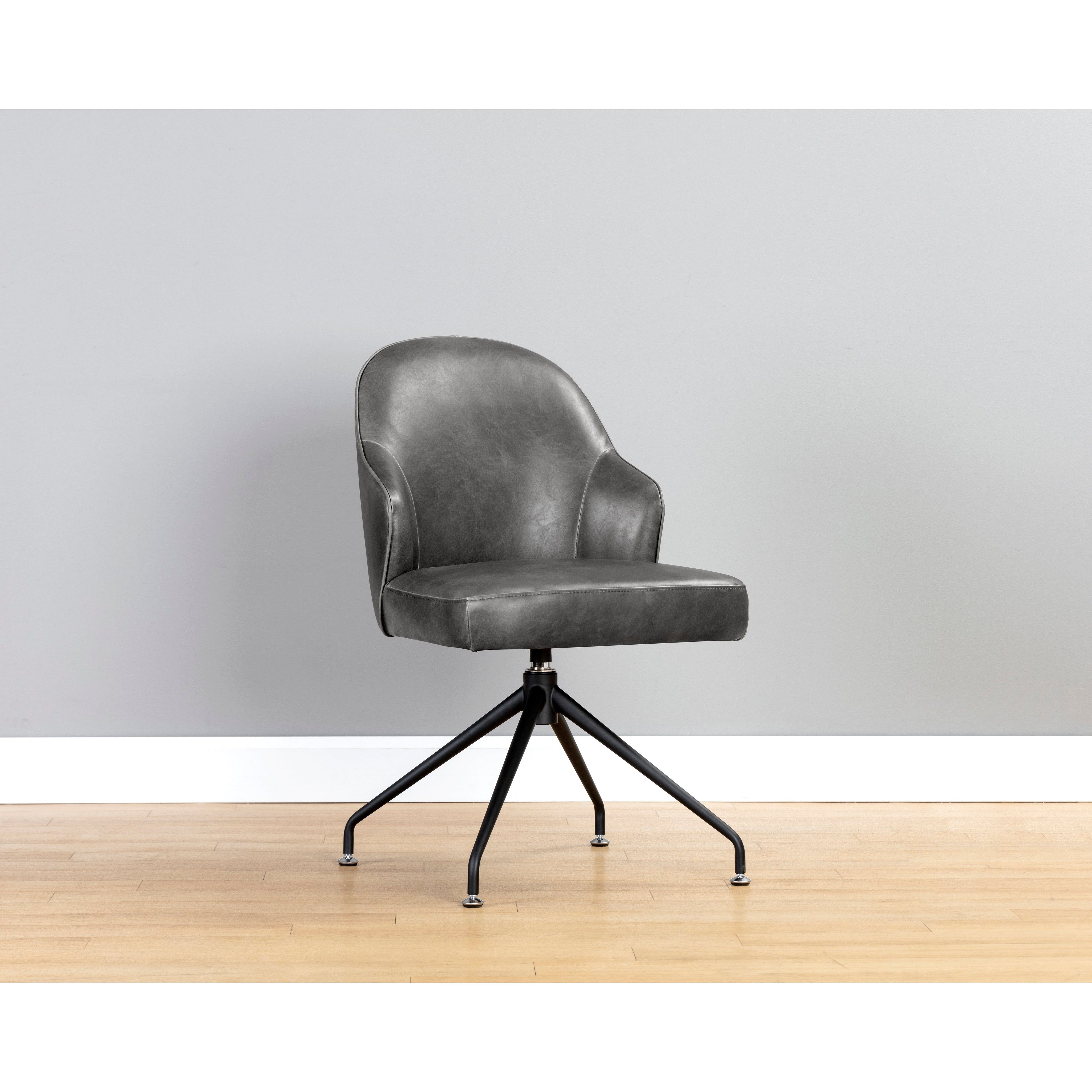 A handsome swivel dining chair designed for transitional and modern spaces. Features a curved seatback in tobacco tan and overcast grey faux leather with a black iron base. Handle With Care: This design has been crafted with faux leather. Faux leather is manufactured to reflect the natural characteristics of leather; as such, colour variations, markings wrinkles, grooves, and light scratches are appreciated characteristics. No two pieces will be alike. Visit our Product Care page for more information on how to ensure the lasting beauty of this piece.