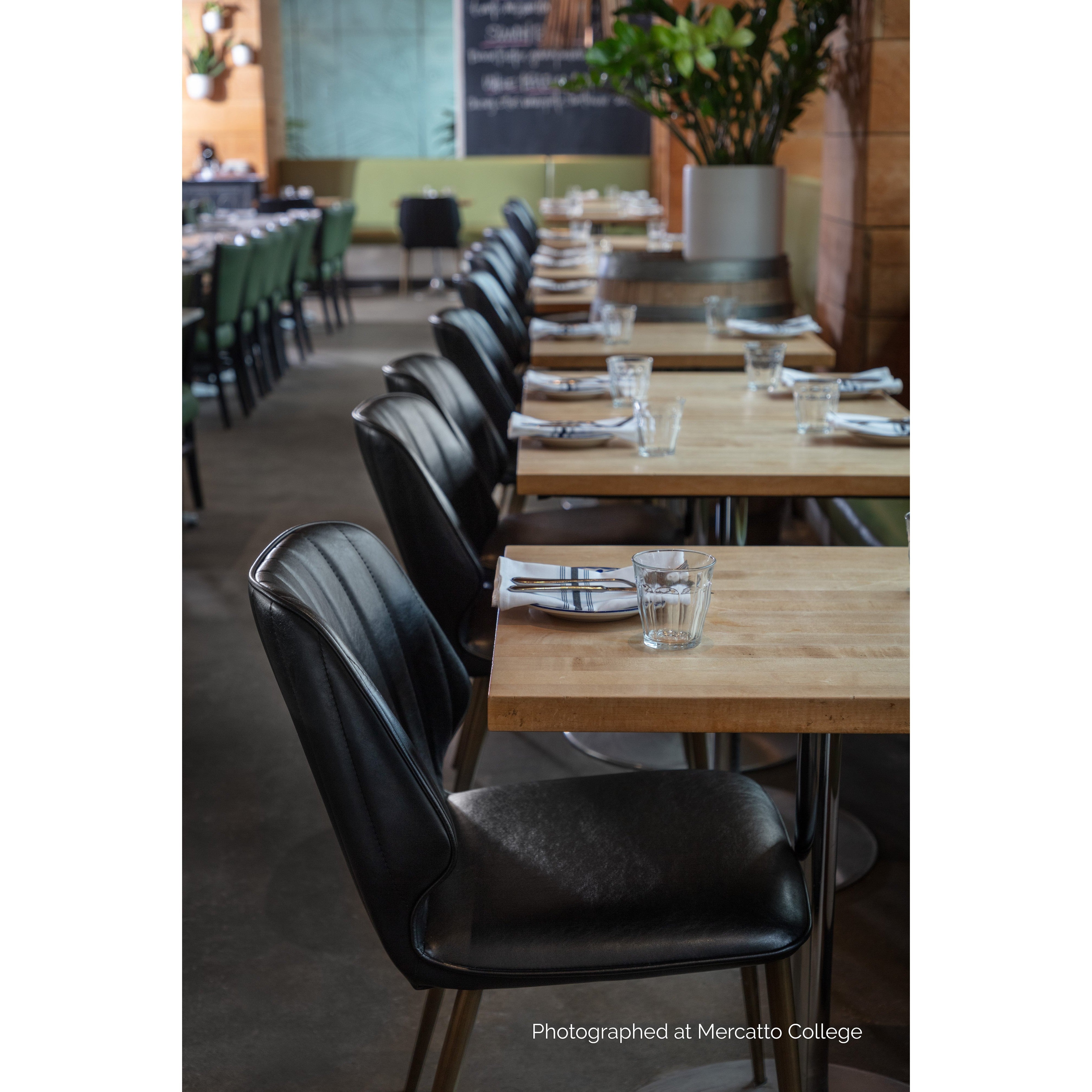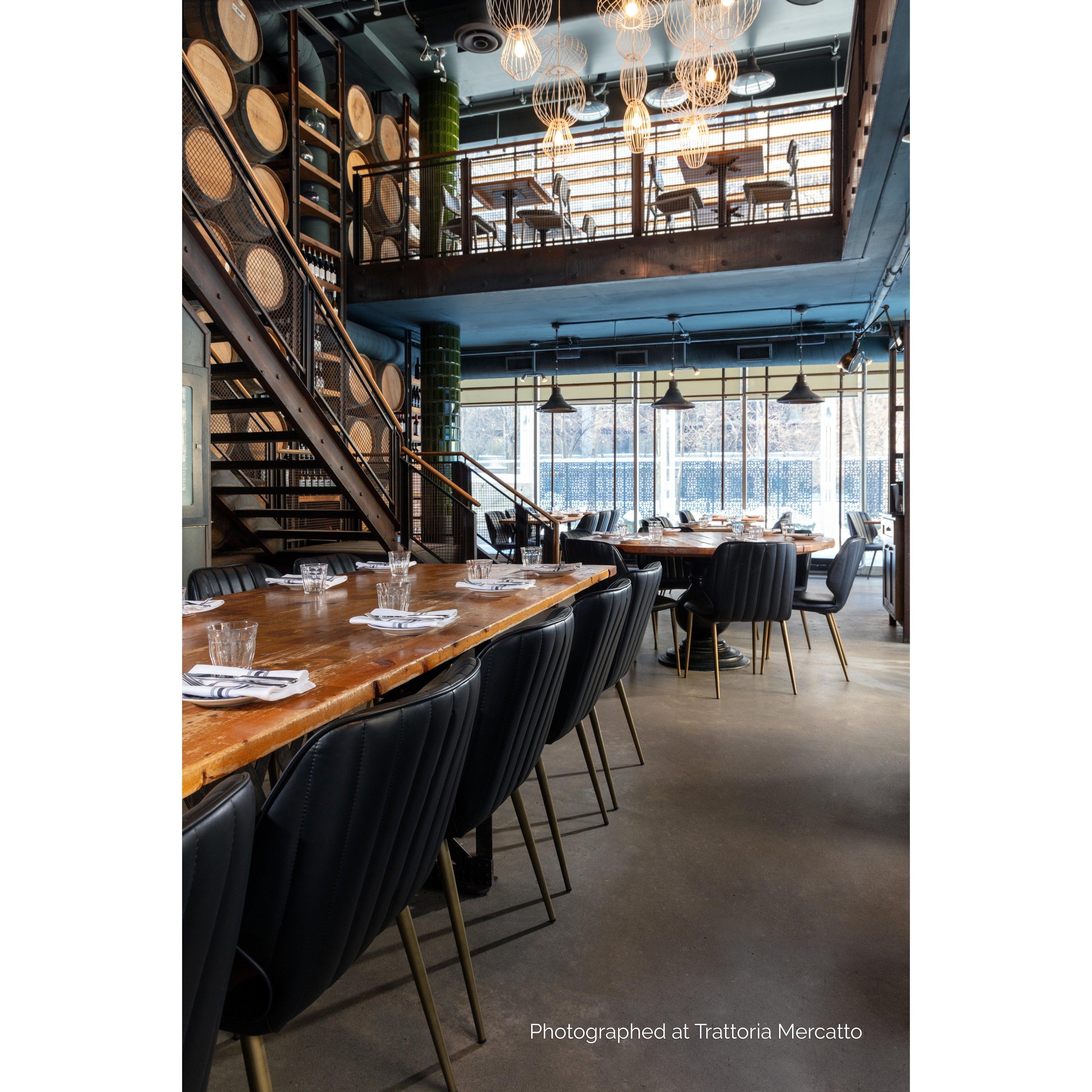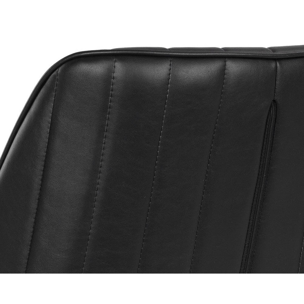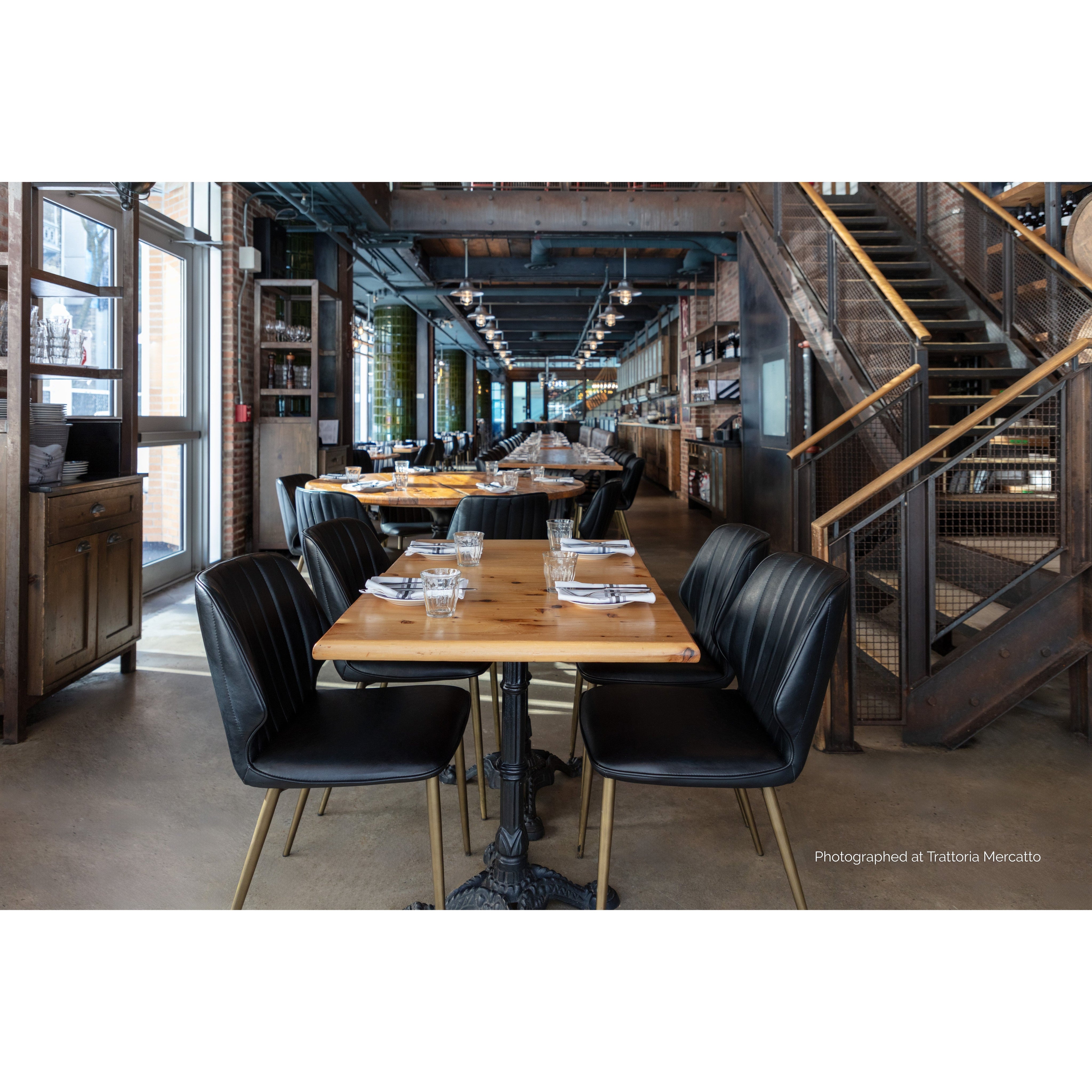 This industrial inspired dining chair is perfect for dining, lounge, office spaces and more. For a feminine touch, this design combines bravo black faux leather with channel tufting and bronze iron legs. Beautiful from all angles.
