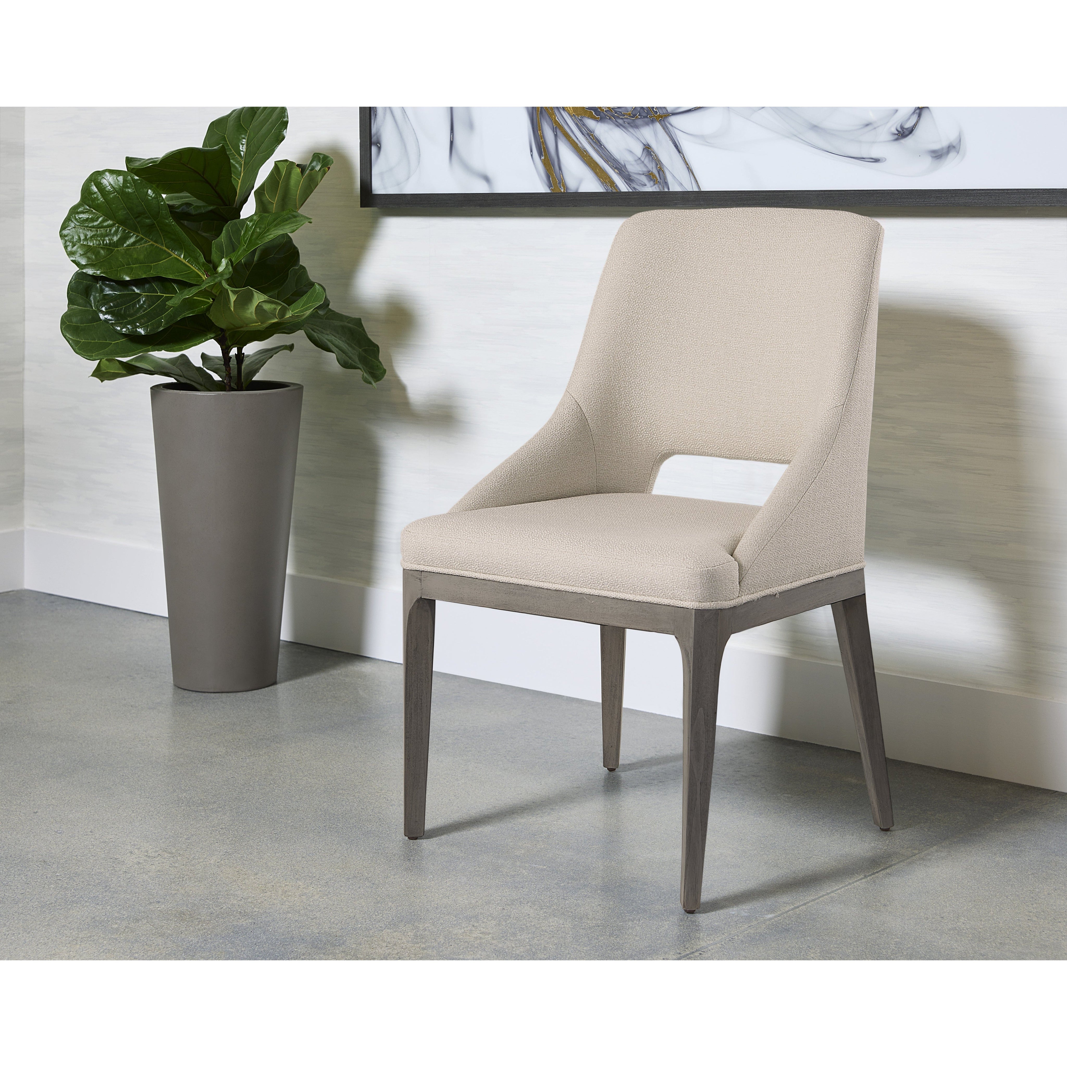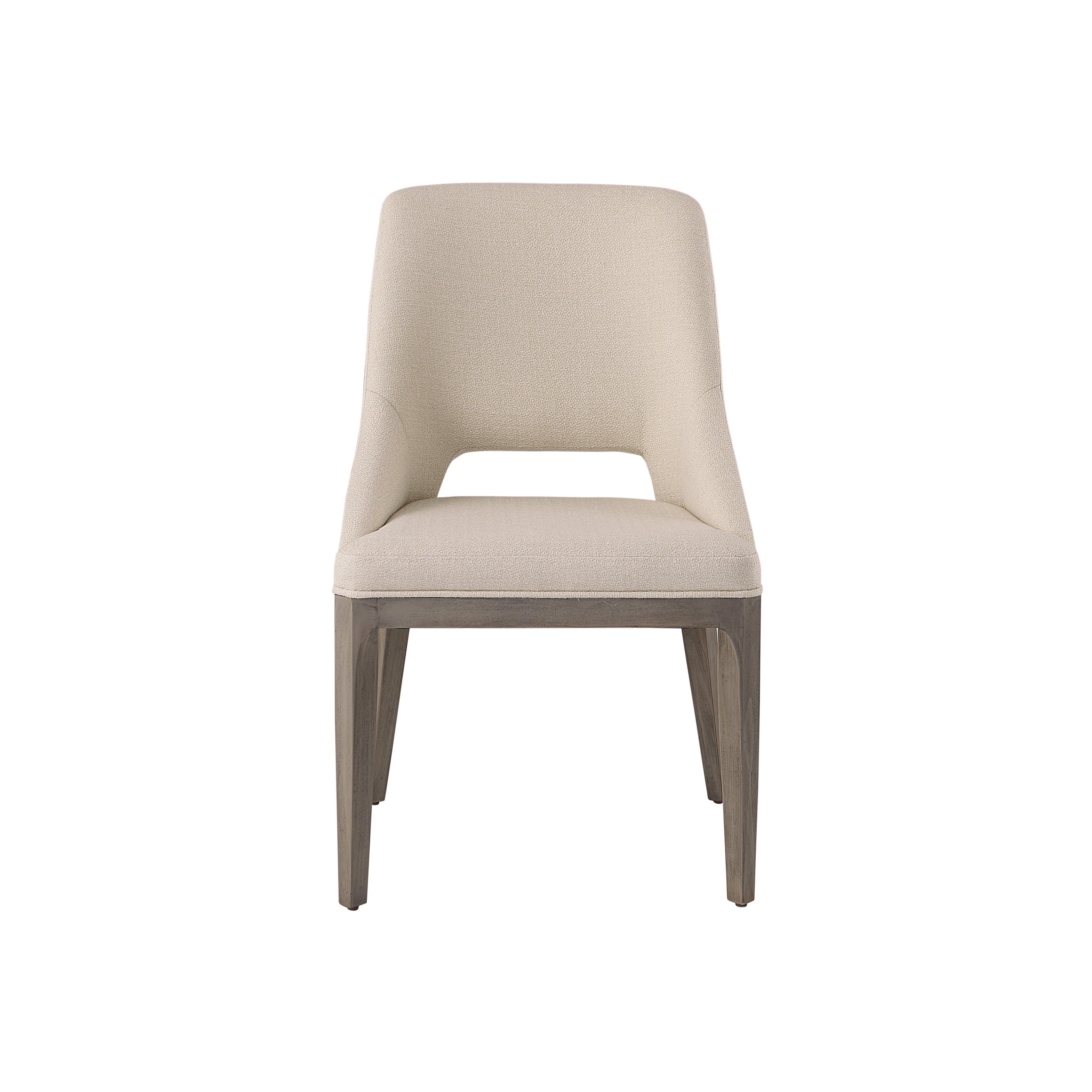 Dine in style and comfort in this fabulous dining chair that features a tasteful cutout in the seatback. Completed with mainz cream fabric upholstery and features solid poplar wood legs in a light grey oak finish. As wood is an organic, porous material, these pieces will contain natural variation of texture and may also exhibit fine indentations and cracks. Wood pieces will also display a disparity of colour and grain, and visible knots and burls that add to the character of each piece.