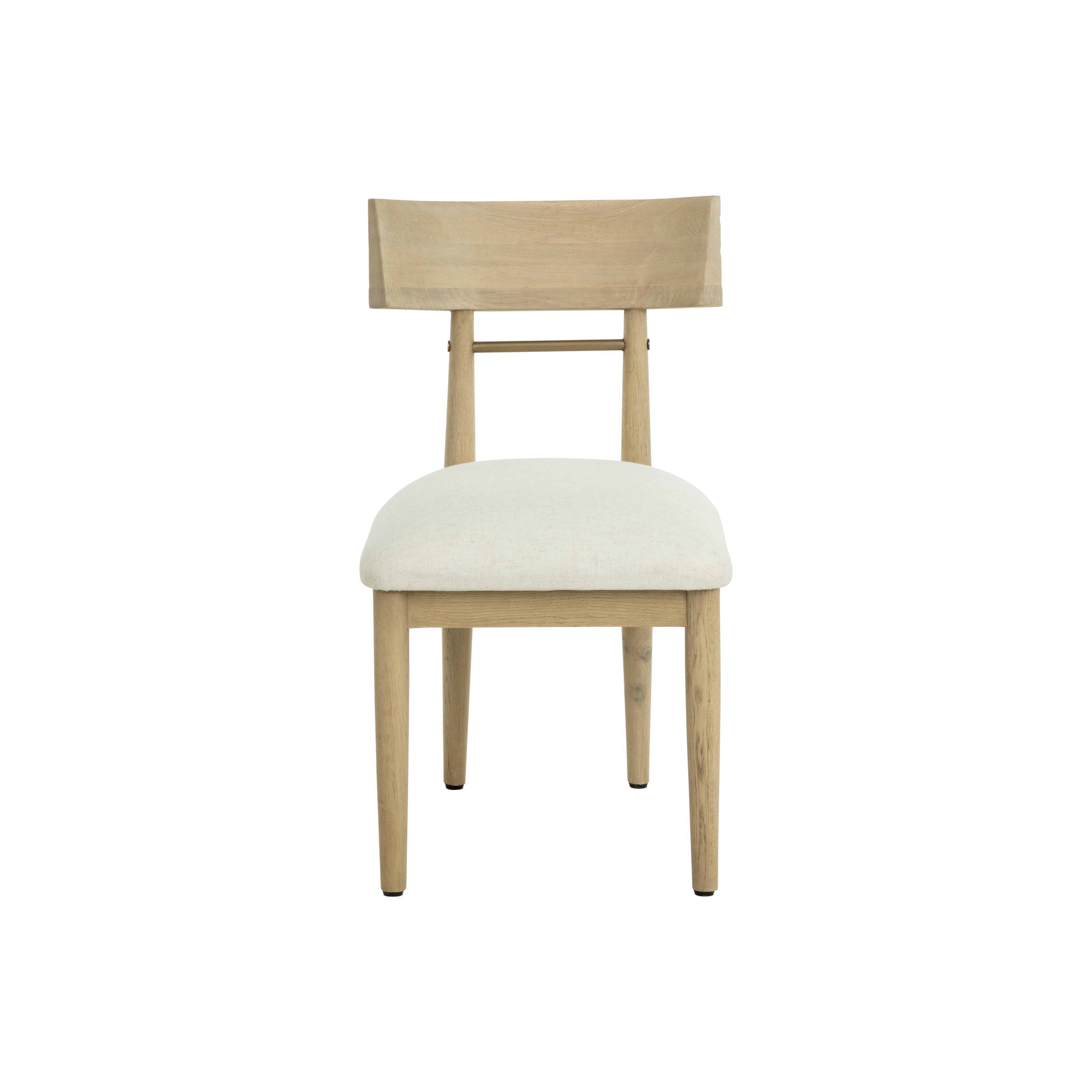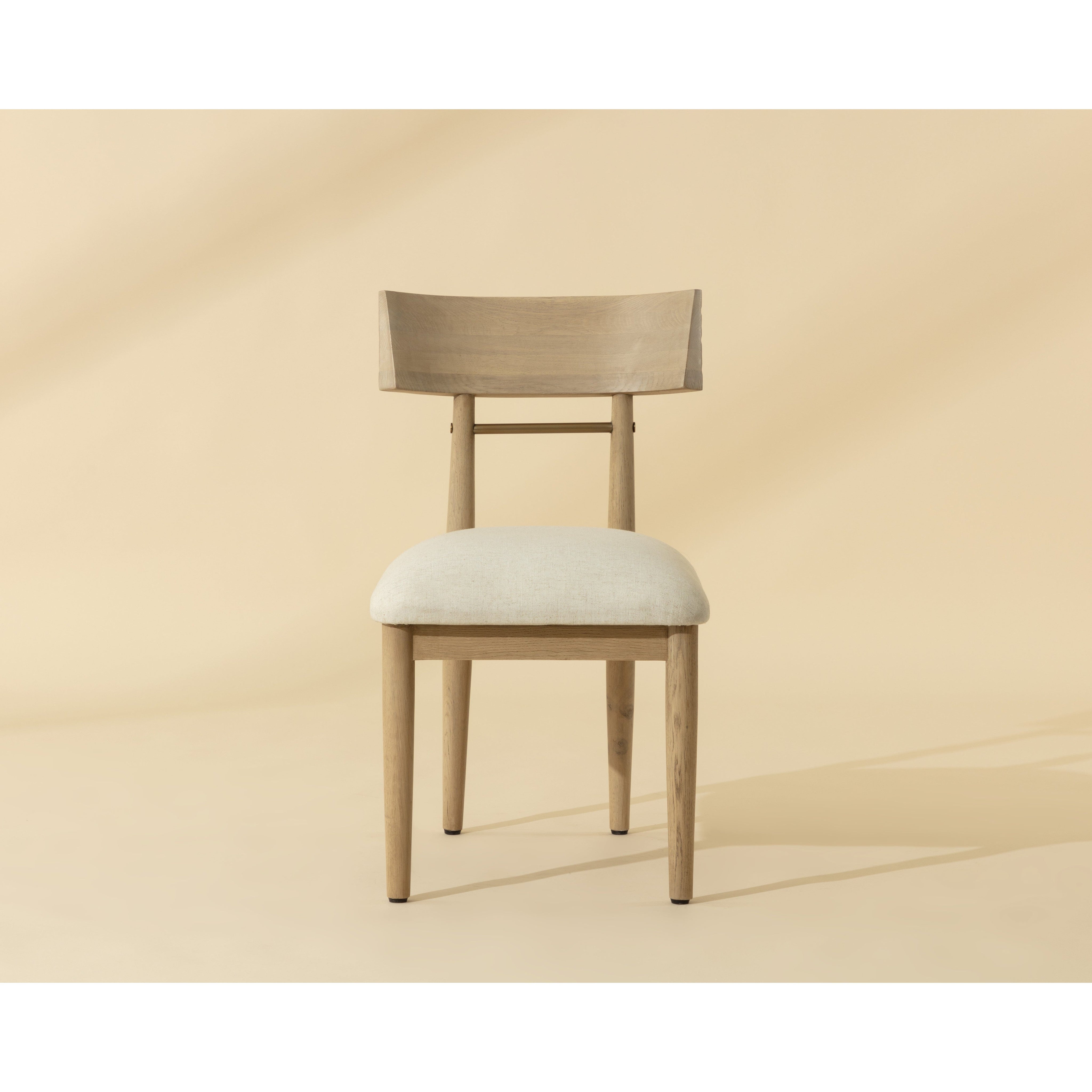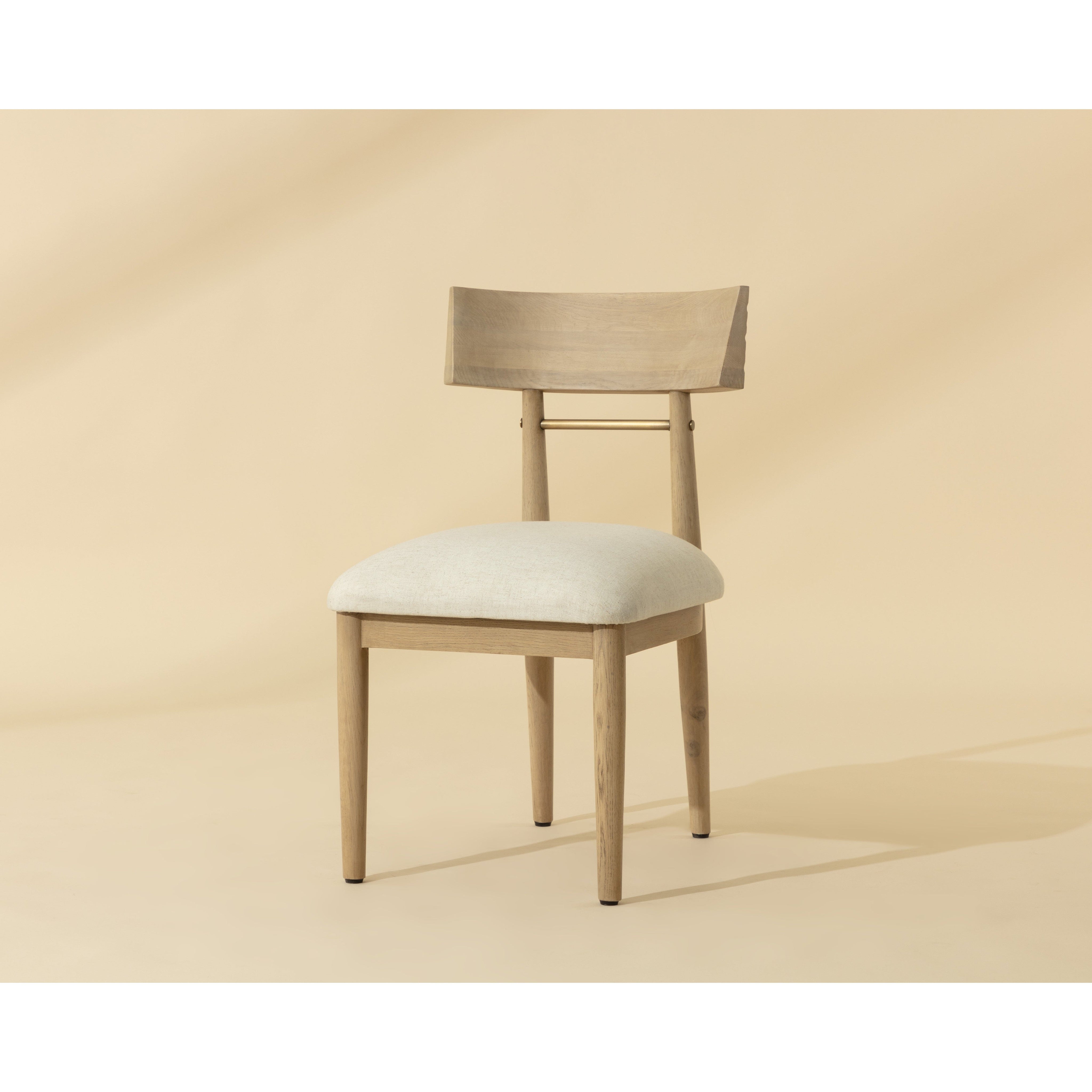 The Florian Dining Chair showcases the beauty of natural materials in a refined, sculptural form. Crafted from light oak, its curved backrest features a rippled, hand-carved texture that draws the eye and invites touch. An antique brass stretcher echoes the tones of the frame, while a seat in soft linen fabric completes the look with comfort and character.