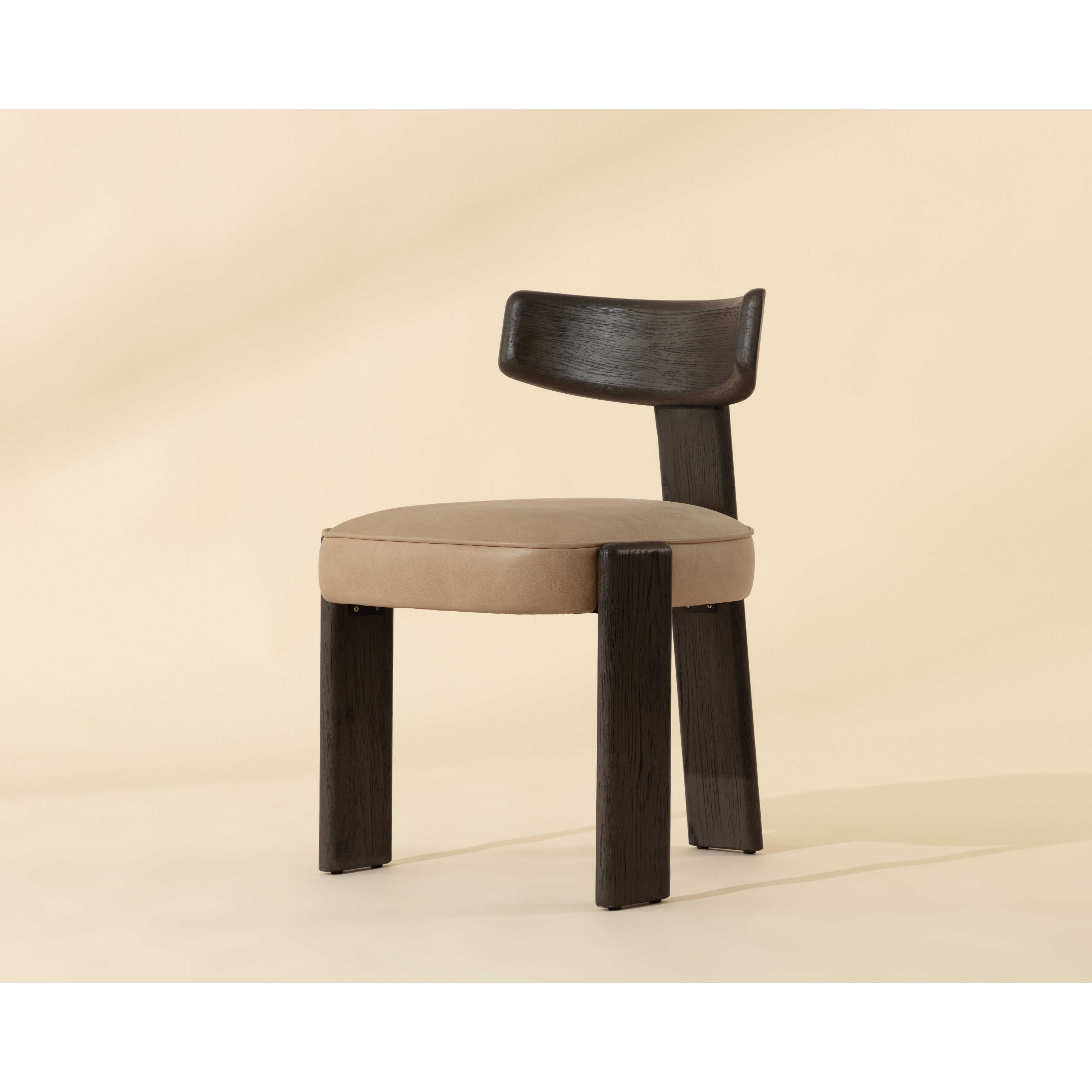 The Horton Dining Chair highlights the beauty of simplicity in contemporary design. A sculpted three-legged frame with a curved back constructed from dark brown oak wood embraces the comfort of a beautiful seat upholstered in our luxurious sahara sand top grain leather.