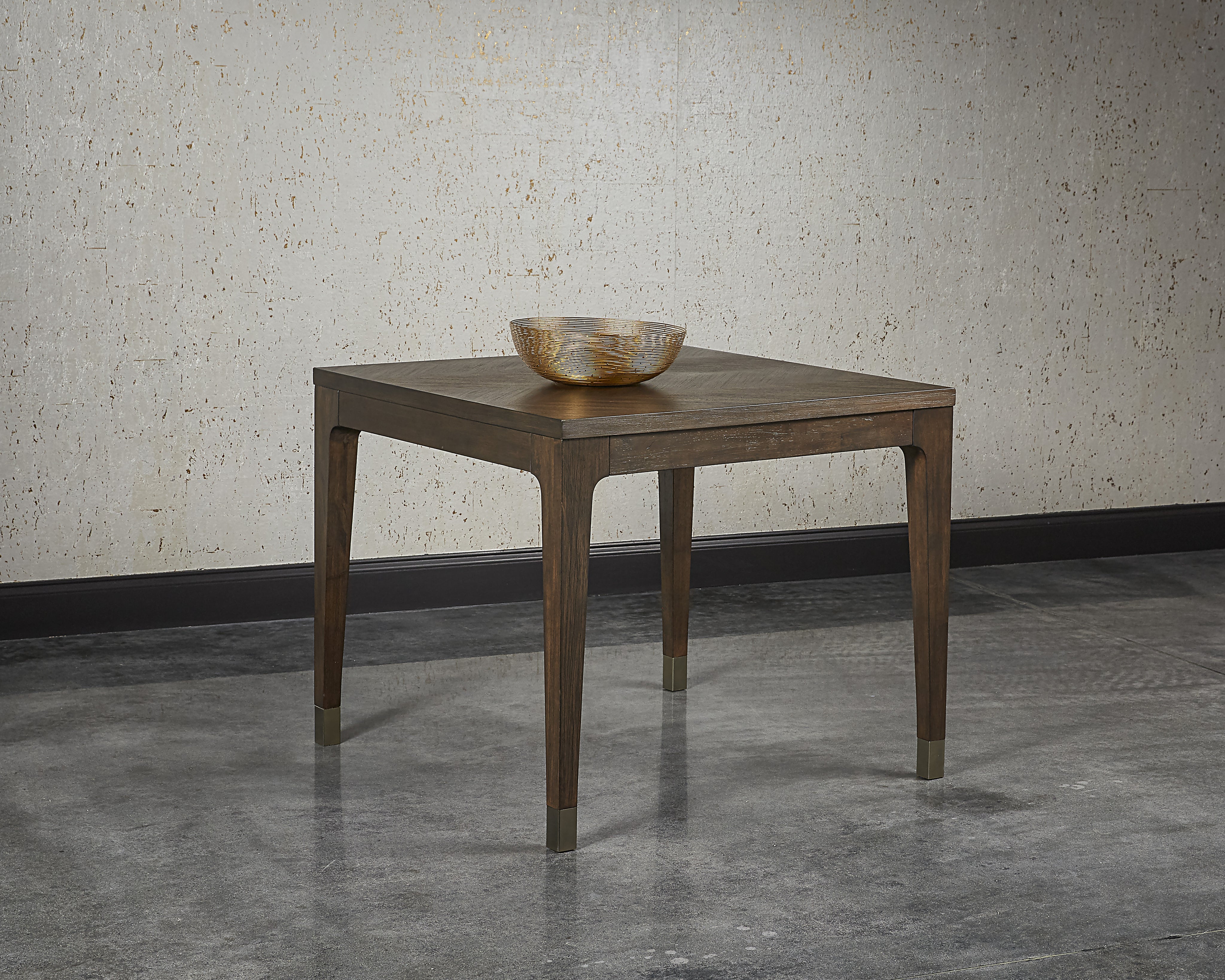 This dining table will make every dining experience a special occasion. Made of smoked acacia wood with a stylish handcrafted chevron pattern on the tabletop. Antique brass caps on the feet complete the look. Seats four. As wood is an organic, porous material, these pieces will contain natural variation of texture and may also exhibit fine indentations and cracks. Wood pieces will also display a disparity of colour and grain, and visible knots and burls that add to the character of each piece.