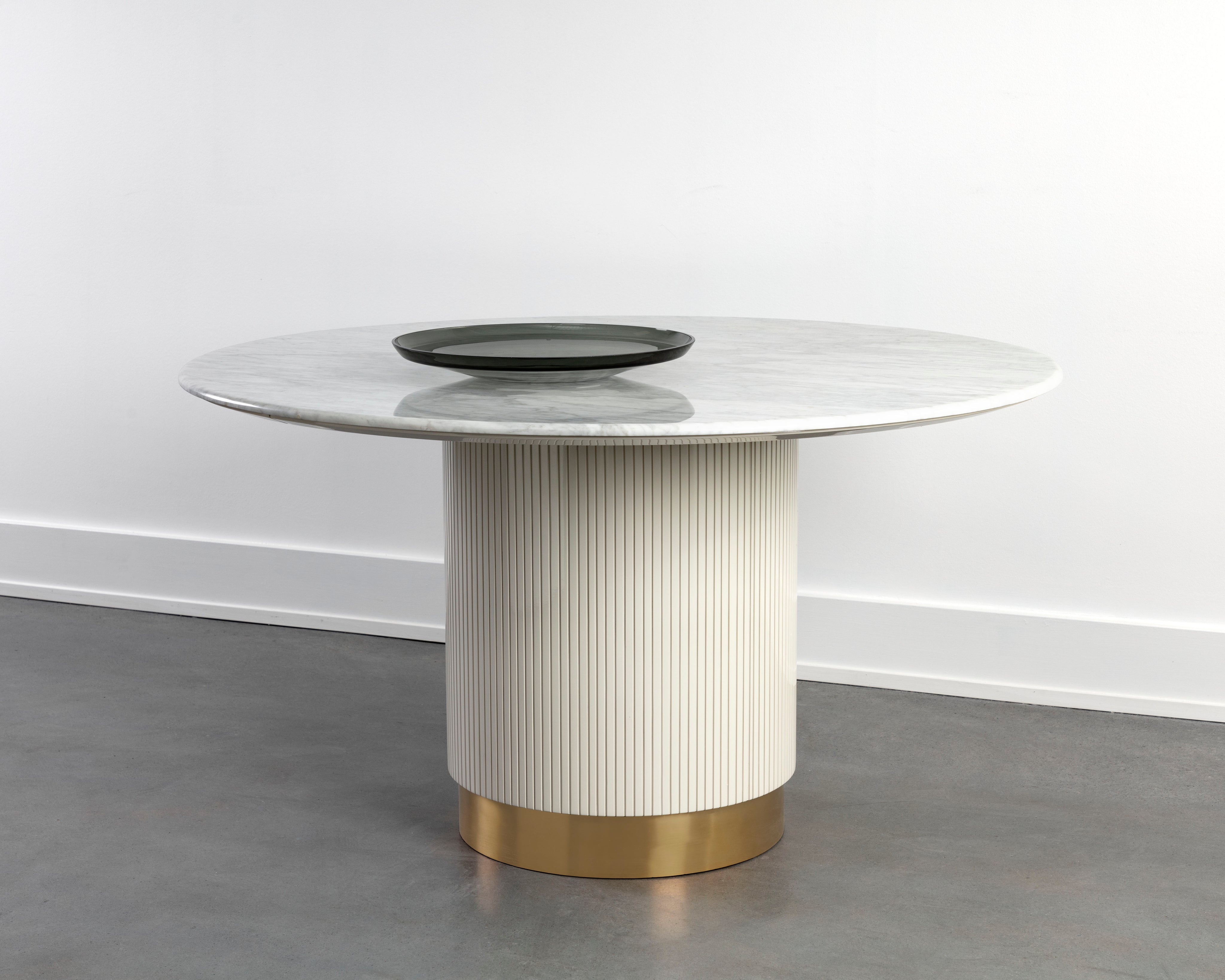 The Paloma Dining Table brings a sculptural spirit to any dining space. The smooth white marble tabletop contrasts with a textured high gloss cream base that features intricate vertical reeding. A gold stainless inlay at the bottom creates added definition. As marble is a natural material, unique veining, pitting, fissures, micro-cracks and colour variations are all characteristics that add to the uniqueness and beauty of each piece.