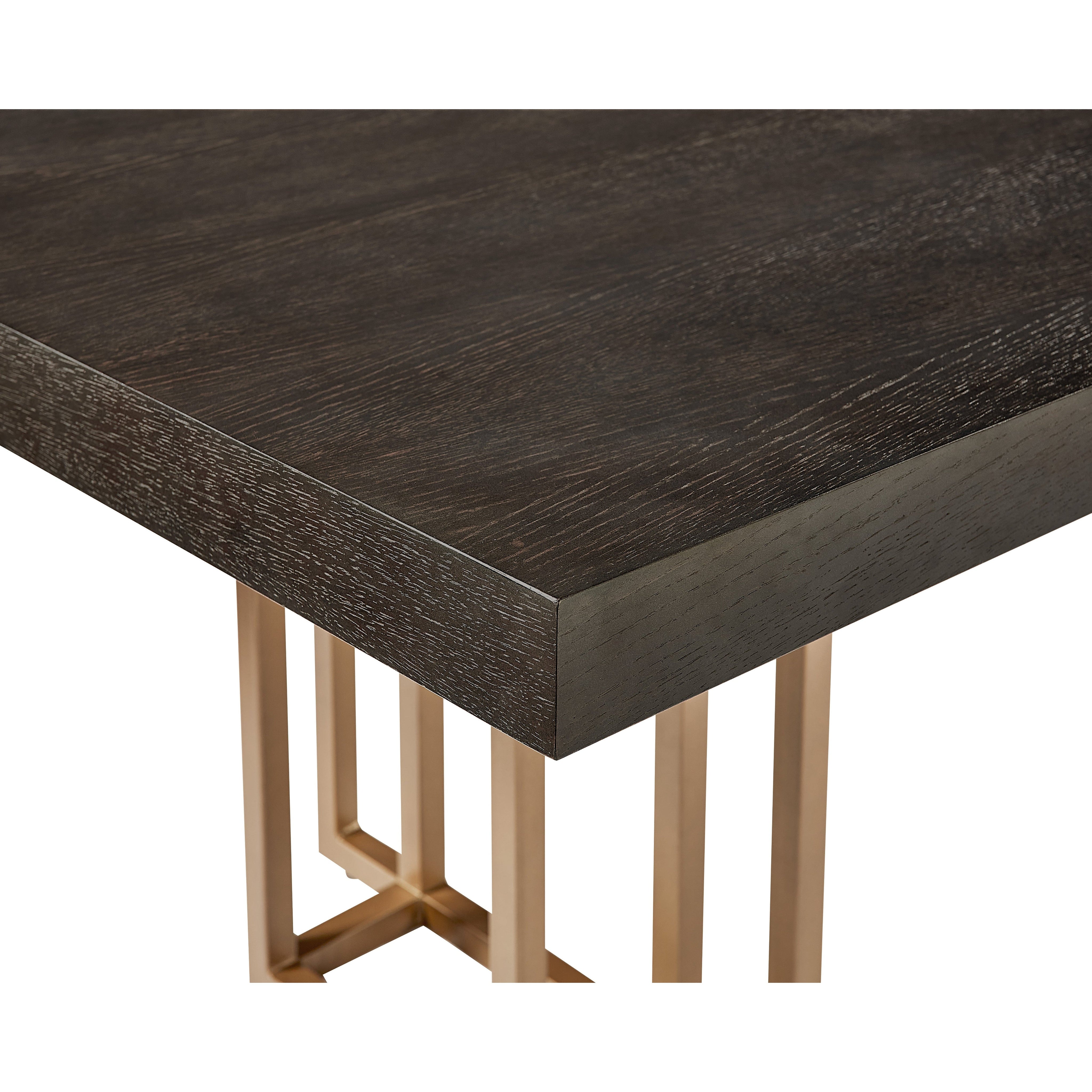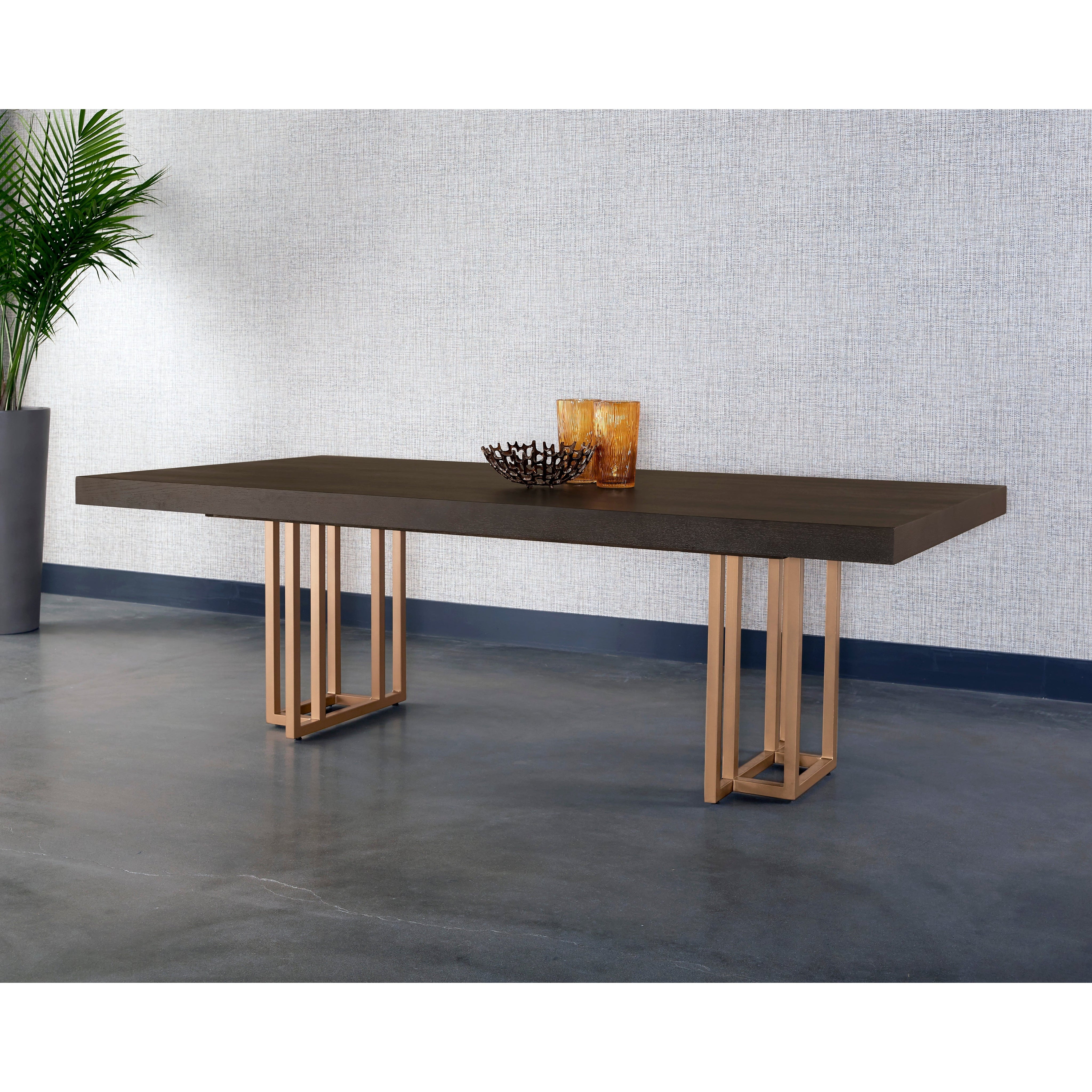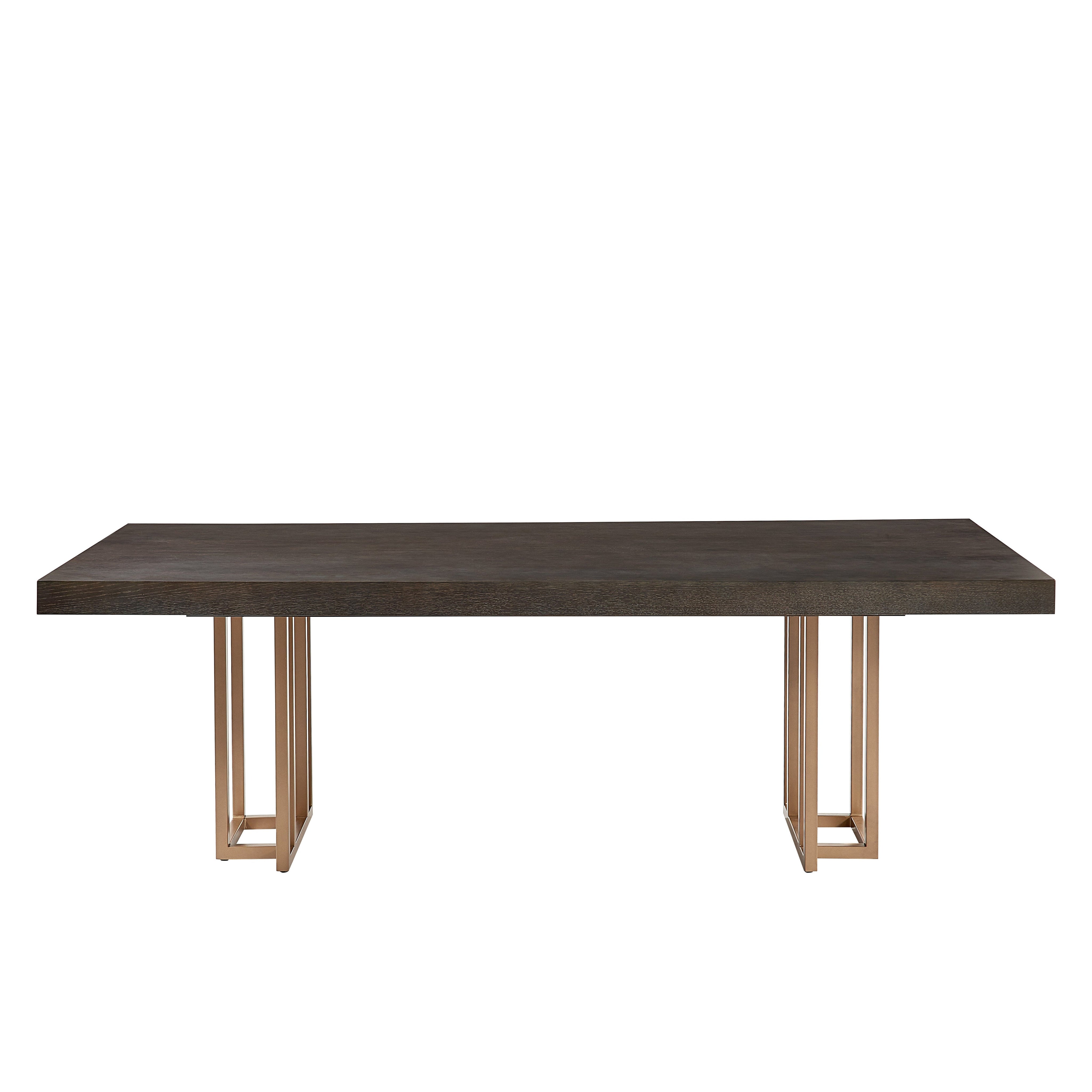 Classic style meets modern edge with this stylish dining table. Make a statement with its bold, powder-coated steel legs in a rustic bronze finish. The tabletop is completed with a wooden oak veneer. As wood is an organic, porous material, these pieces will contain natural variation of texture and may also exhibit fine indentations and cracks. Wood pieces will also display a disparity of colour and grain, and visible knots and burls that add to the character of each piece.