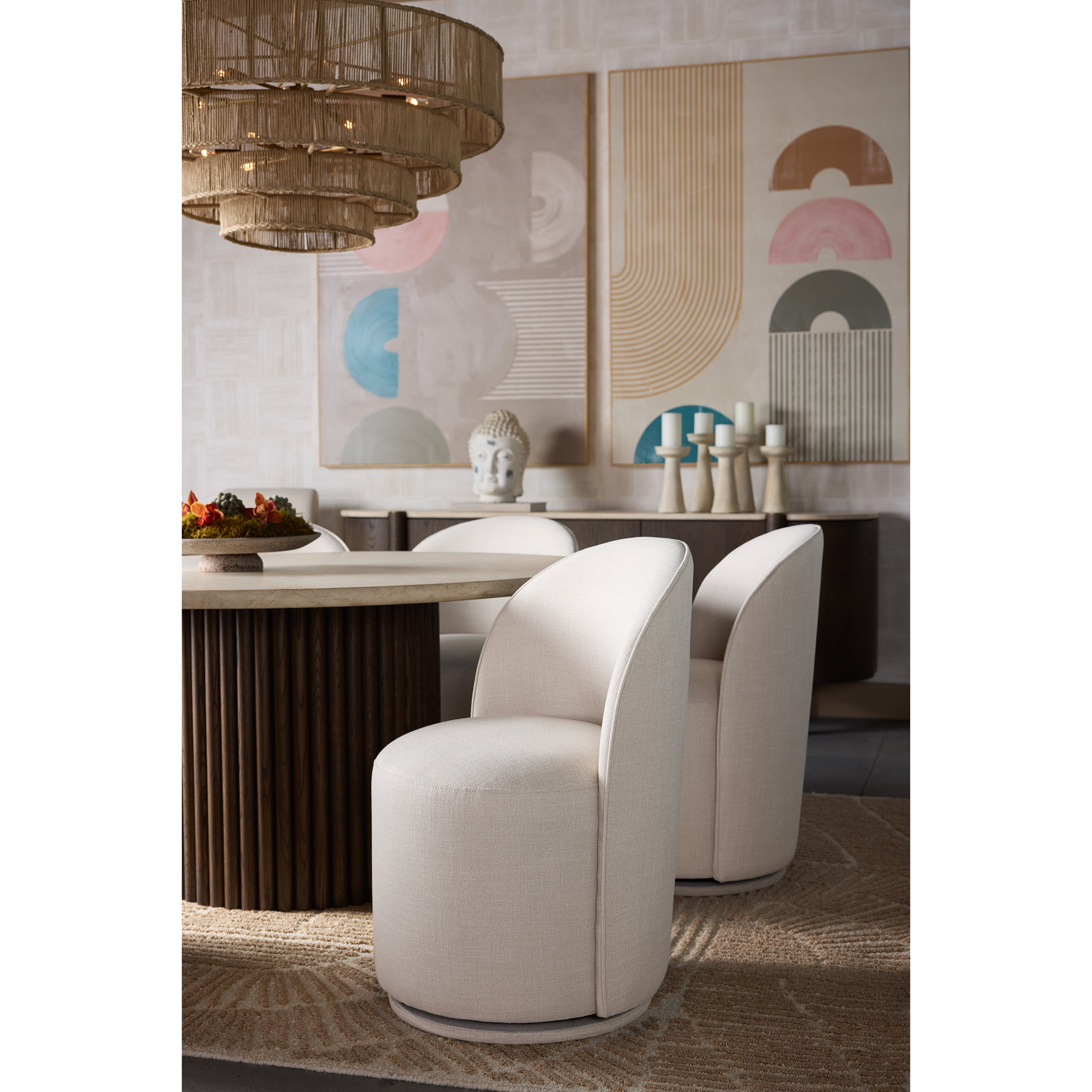The Banyan Dining Table is a standout with rounded curves and sculpted edges. Crafted to perfection with a cream marble top and a fluted solid oak wood base, this dining table is a modern masterpiece.