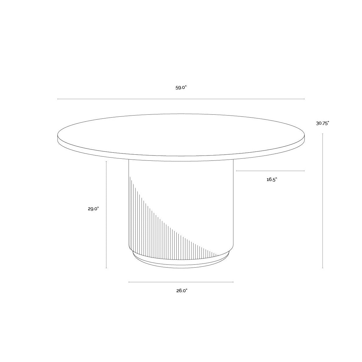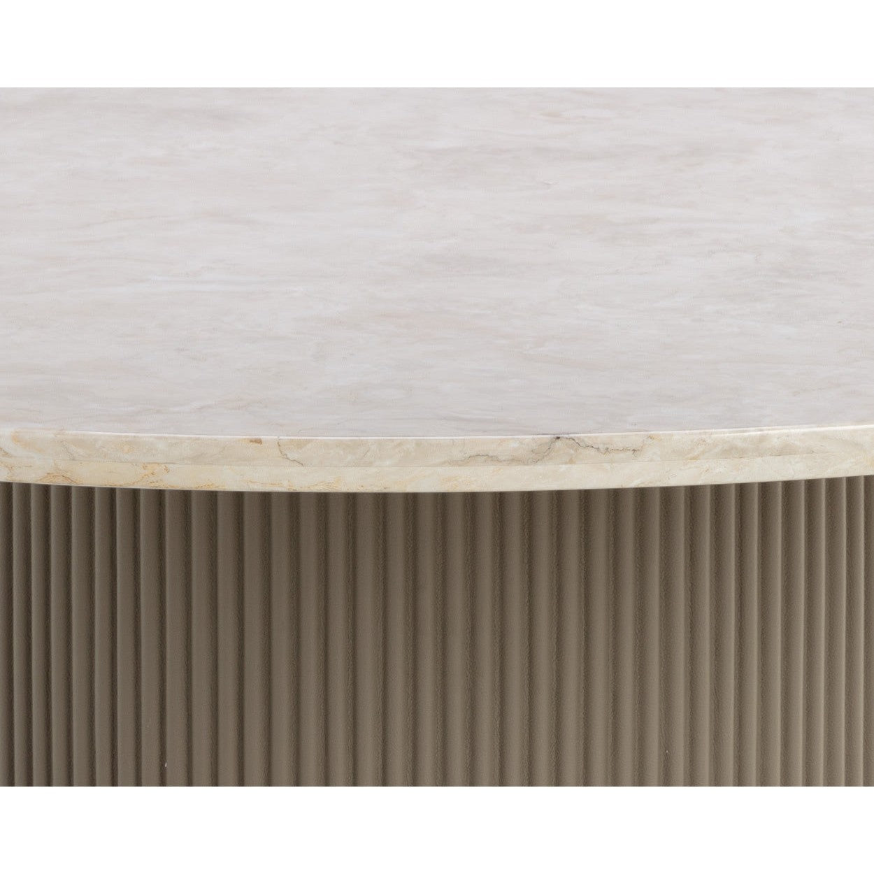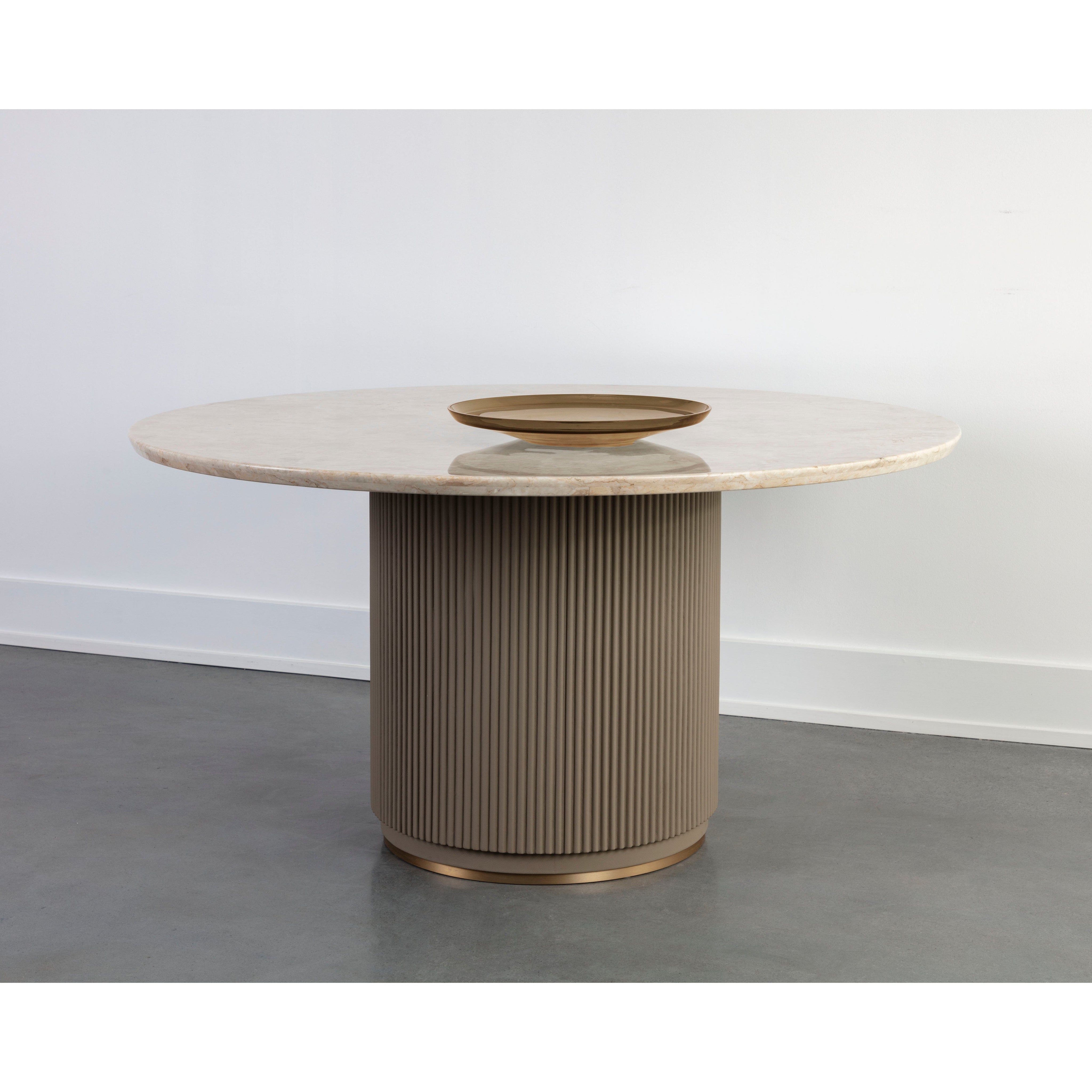 Refined mixed materials with an architectural influence define the Cataldi Dining Table. Fluted detailing in the taupe faux leather base adds intriguing texture that contrasts against the smooth polished beige marble tabletop. Gold stainless steel trim at the bottom of the base finishes the piece.