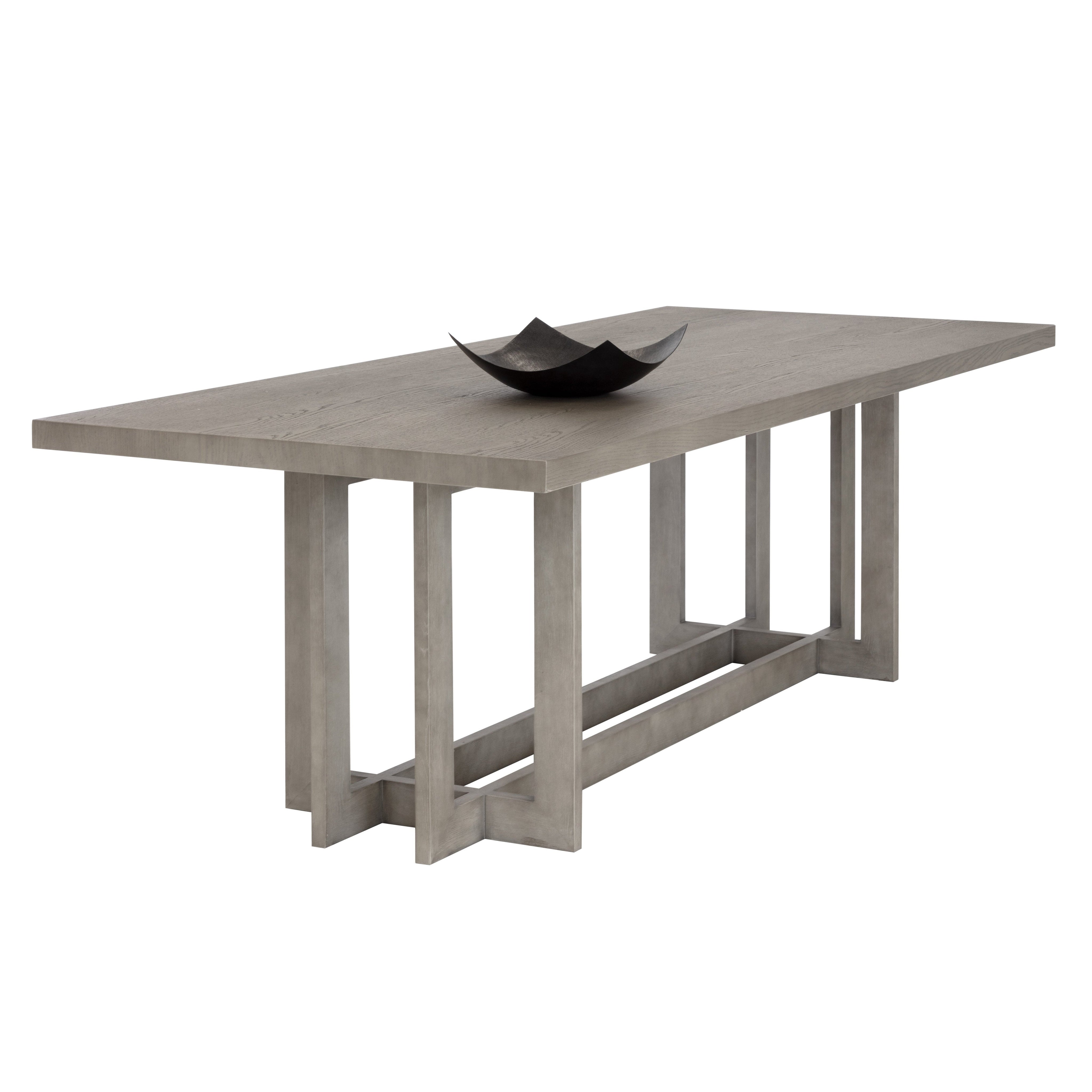 Impress your guests with this eye-catching dining table that features a beautiful linear base that is rich with detail. This wooden table in ash grey oak features a matching oak veneer and is finished with solid oak wood legs. Also available in a natural and dark brown finish. As wood is an organic, porous material, these pieces will contain natural variation of texture and may also exhibit fine indentations and cracks. Wood pieces will also display a disparity of colour and grain, and visible knots and burls that add to the character of each piece.