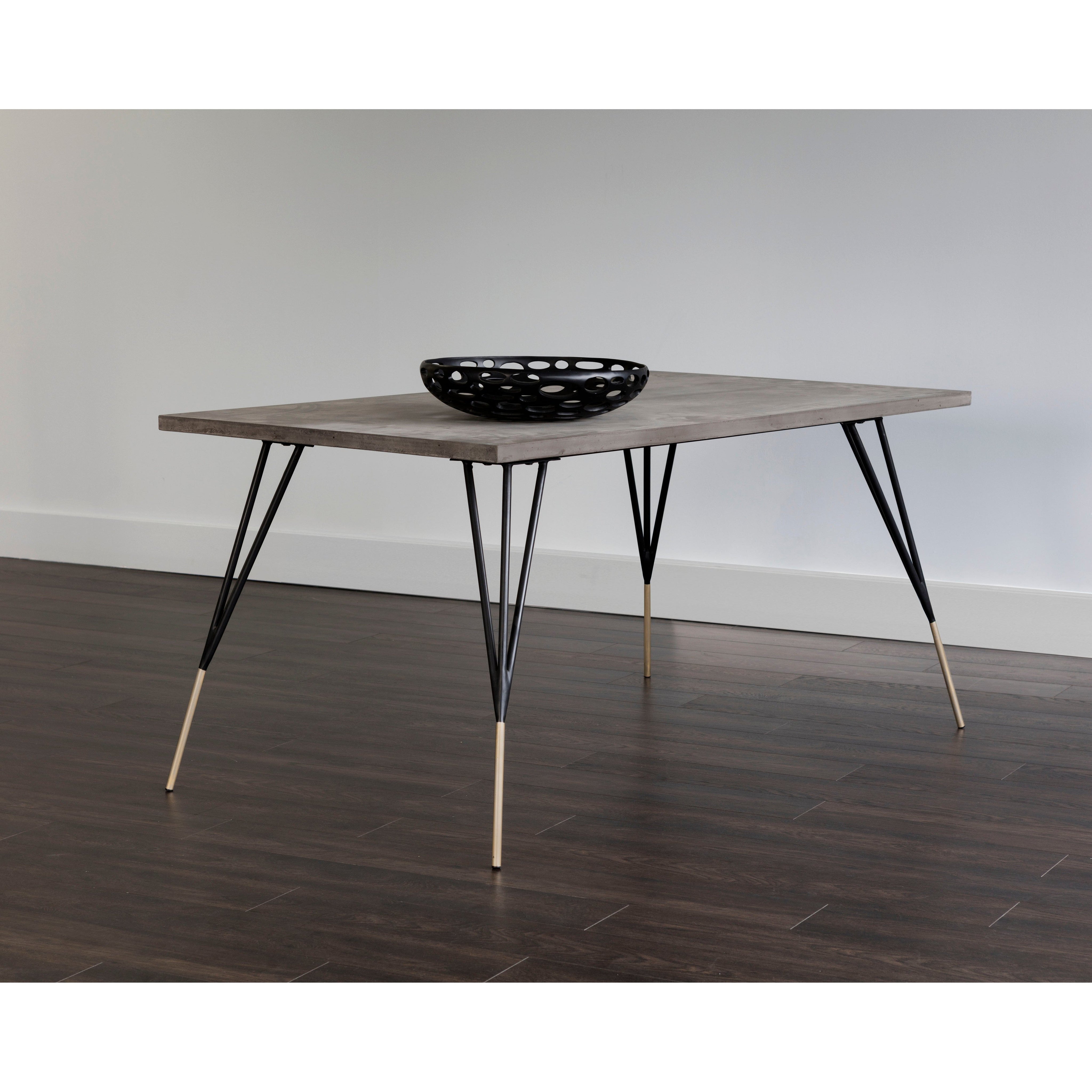 The contrasting materials of this rectangular dining table create a unique industrial modern design. A concrete top is well-supported by thin black metal legs and stylish brushed antique brass feet for an airy appearance. Perfect for smaller urban spaces, with seating up to six. Crafted from a natural concrete mix, each piece will look different. Variations in colour, texture, imperfections, surface scratches and non-structural hairline cracks are considered inherent and valued qualities of the material.