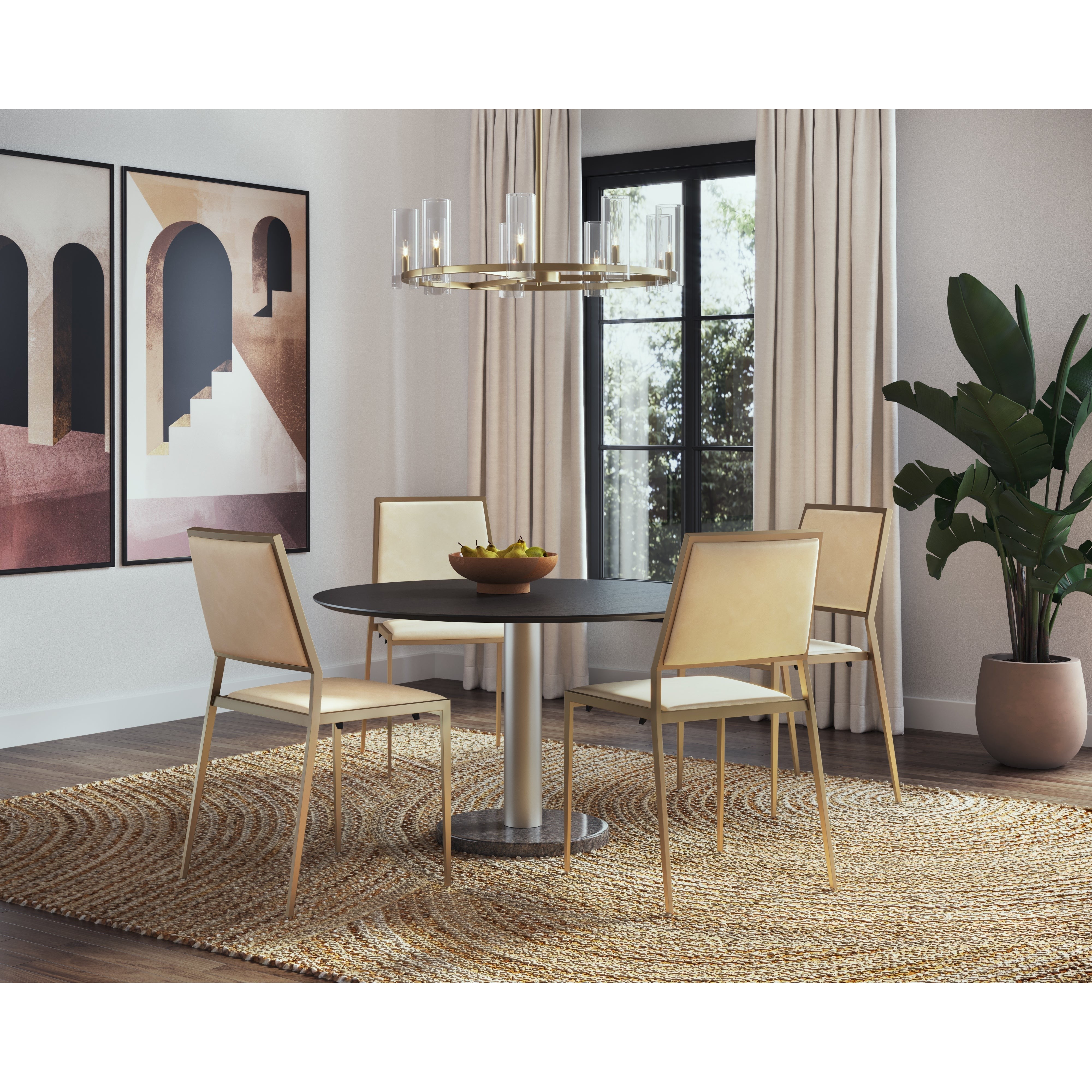 This dining table collection offers a modern look with an organic feel. Features a substantial light grey marble and brushed gold iron base with a charcoal grey finished oak wood veneer top. As marble is a natural material, unique veining, pitting, fissures, micro-cracks and colour variations are all characteristics that add to the uniqueness and beauty of each piece. As wood is an organic, porous material, these pieces will contain natural variation of texture and may also exhibit fine indentations and cracks. Wood pieces will also display a disparity of colour and grain, and visible knots and burls that add to the character of each piece.