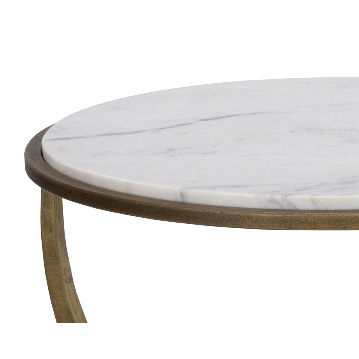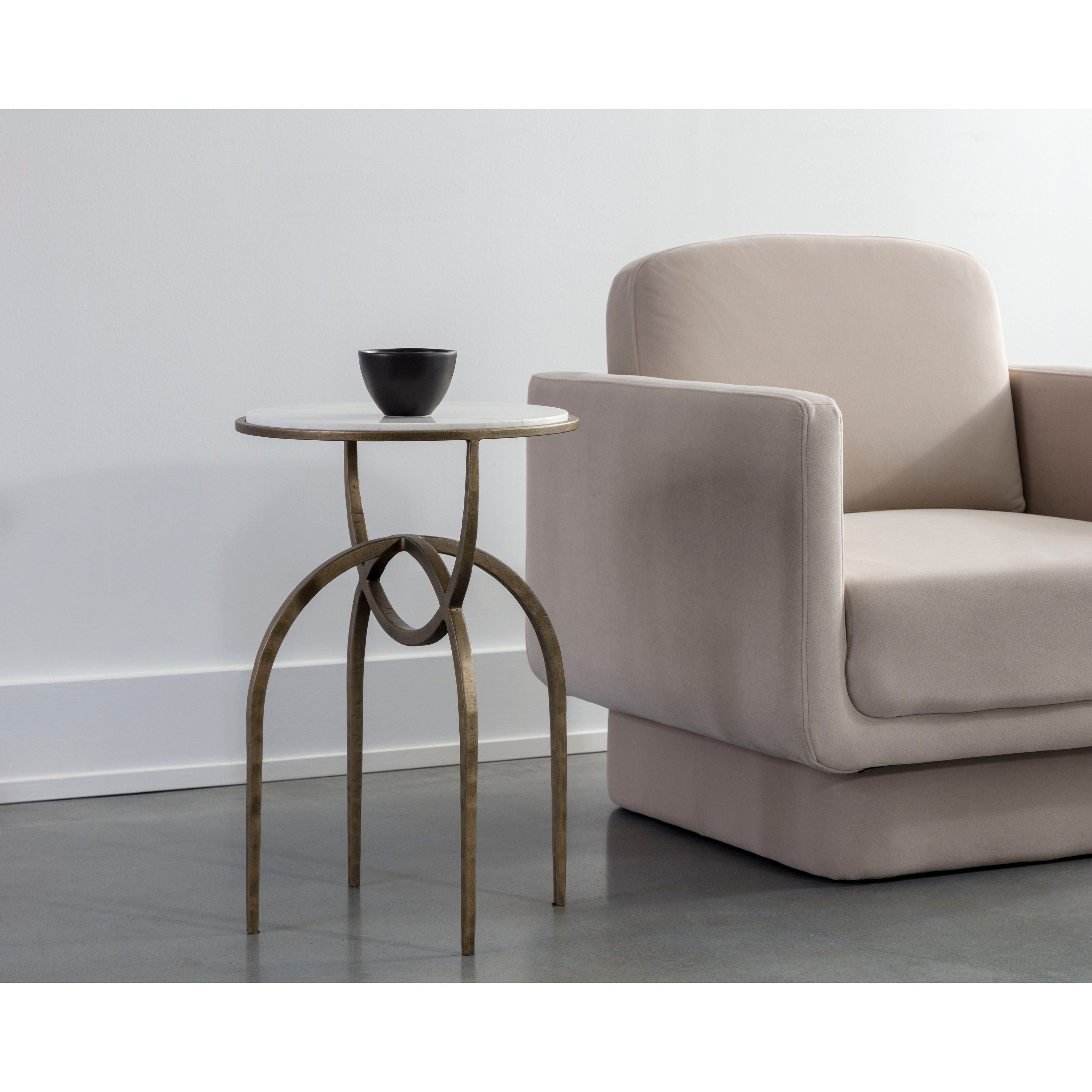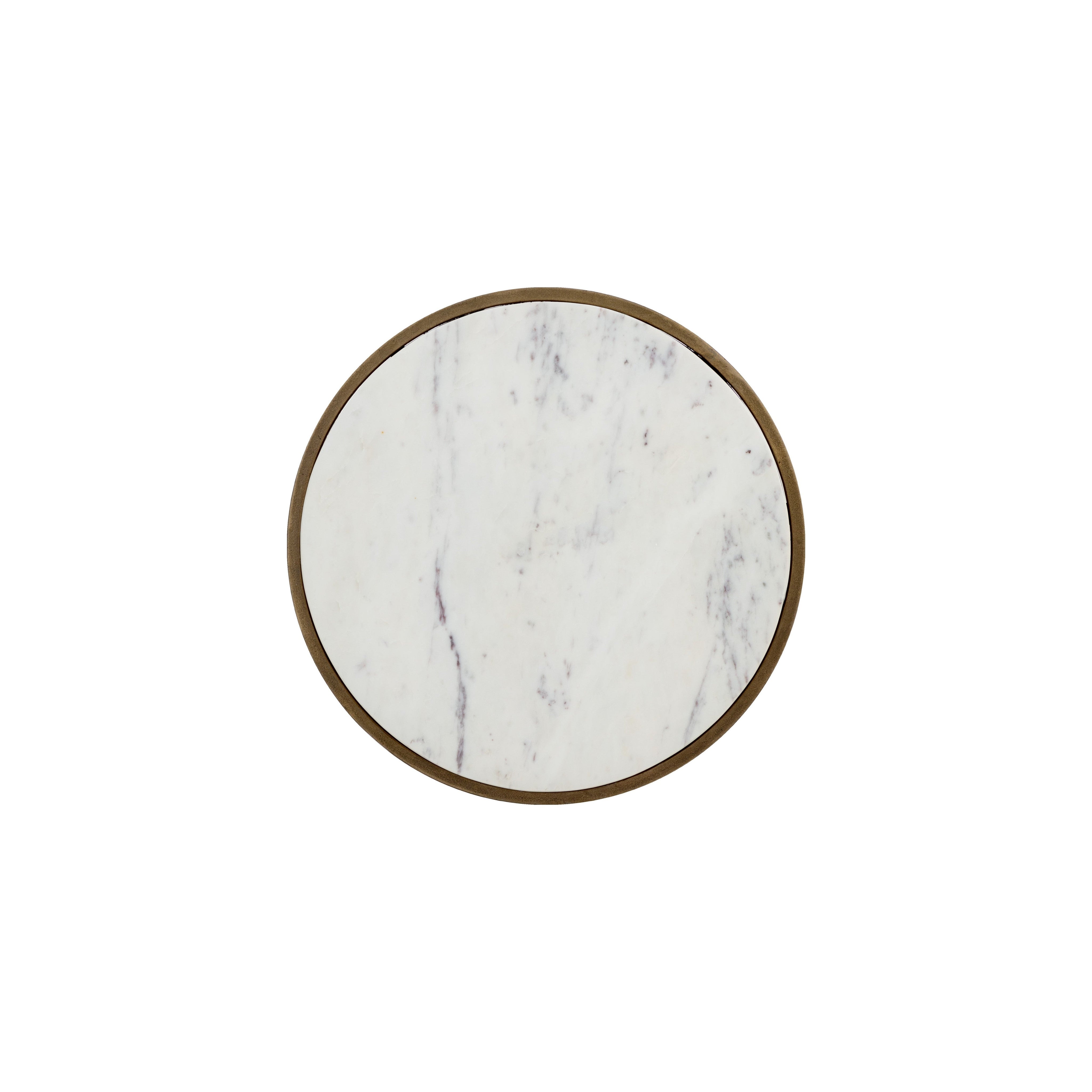Eye-catching from all angles, the Alicent End Table is sure to draw attention. Features a round white marble table top with an antique brass iron base. Expertly crafted with an artful design. As marble is a natural material, unique veining, pitting, fissures, micro-cracks and colour variations are all characteristics that add to the uniqueness and beauty of each piece. Made in India. With refined craftsmanship, this design was brought to life by skilled local artisans. Due to the nature of handcraftsmanship, unique imperfections such as fissures, markings and variations in colour and shape are welcomed and appreciated characteristics for a truly one-of-a-kind piece.
