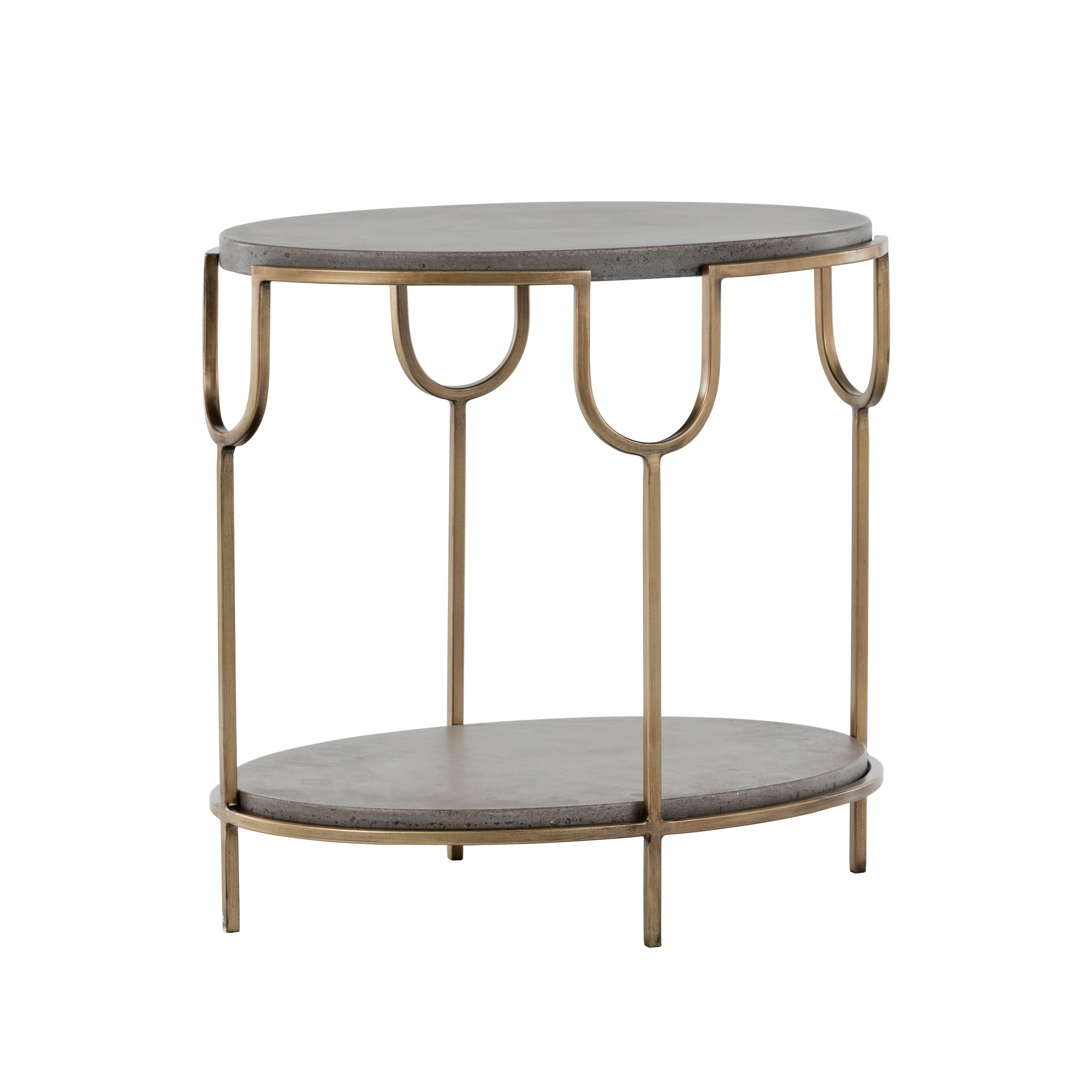 This oval shaped end table features a beautifully structured antique brass iron frame with a concrete top and shelf. A dramatic yet refined contemporary piece. Crafted from a natural concrete mix, each piece will look different. Variations in colour, texture, imperfections, surface scratches and non-structural hairline cracks are considered inherent and valued qualities of the material.