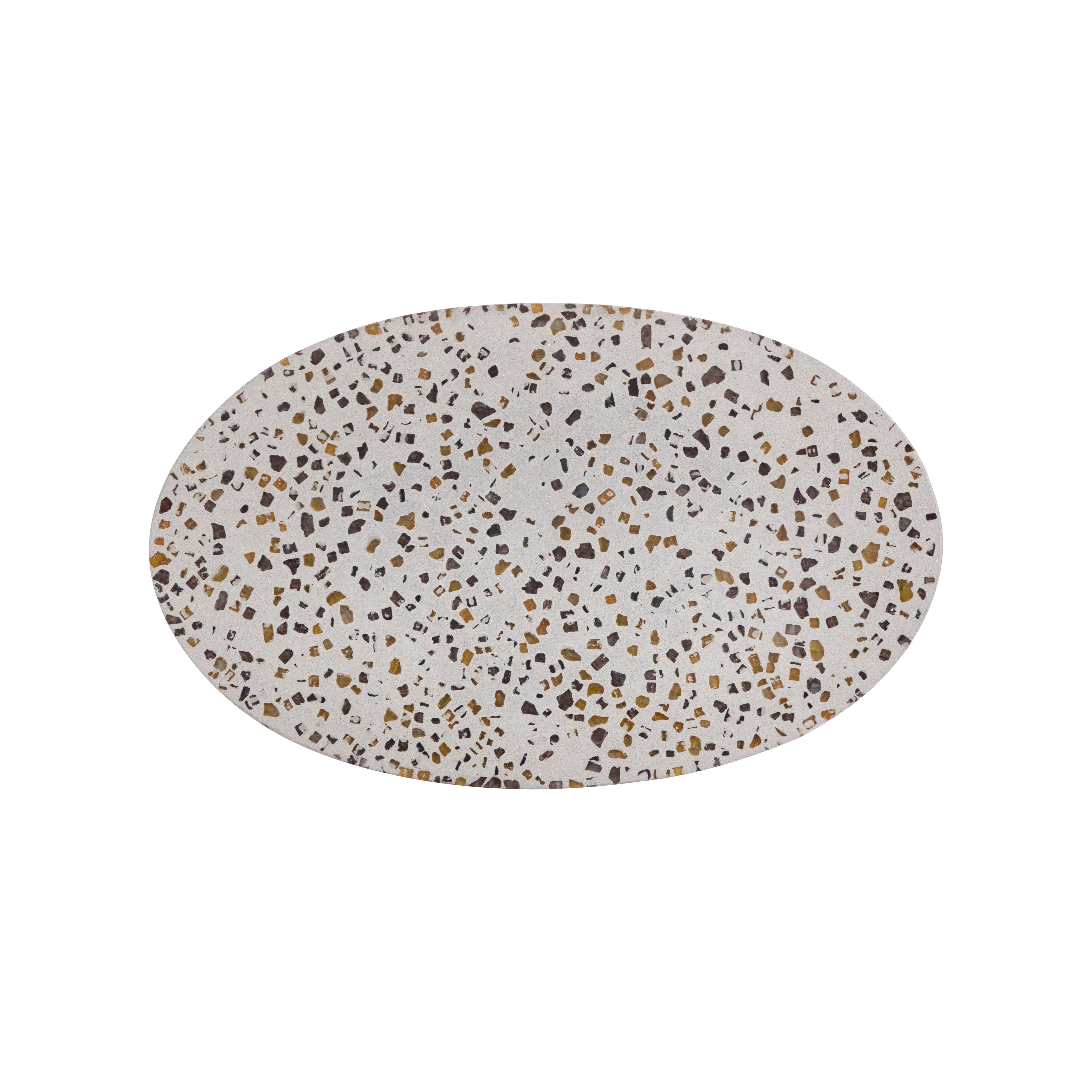 A truly unique end table. This design features a bold concrete base, a brushed brass steel rod and an oval terrazzo top. Terrazzo consists of chips of marble, quartz, granite and glass for a unique look; no two pieces are alike, and colours and/or patterns will vary. Crafted from a natural concrete mix, each piece will look different. Variations in colour, texture, imperfections, surface scratches and non-structural hairline cracks are considered inherent and valued qualities of the material.