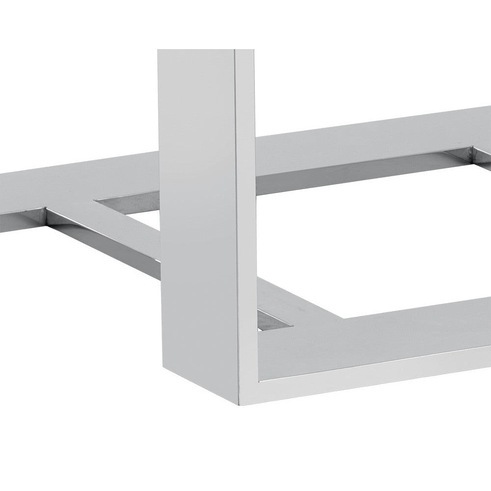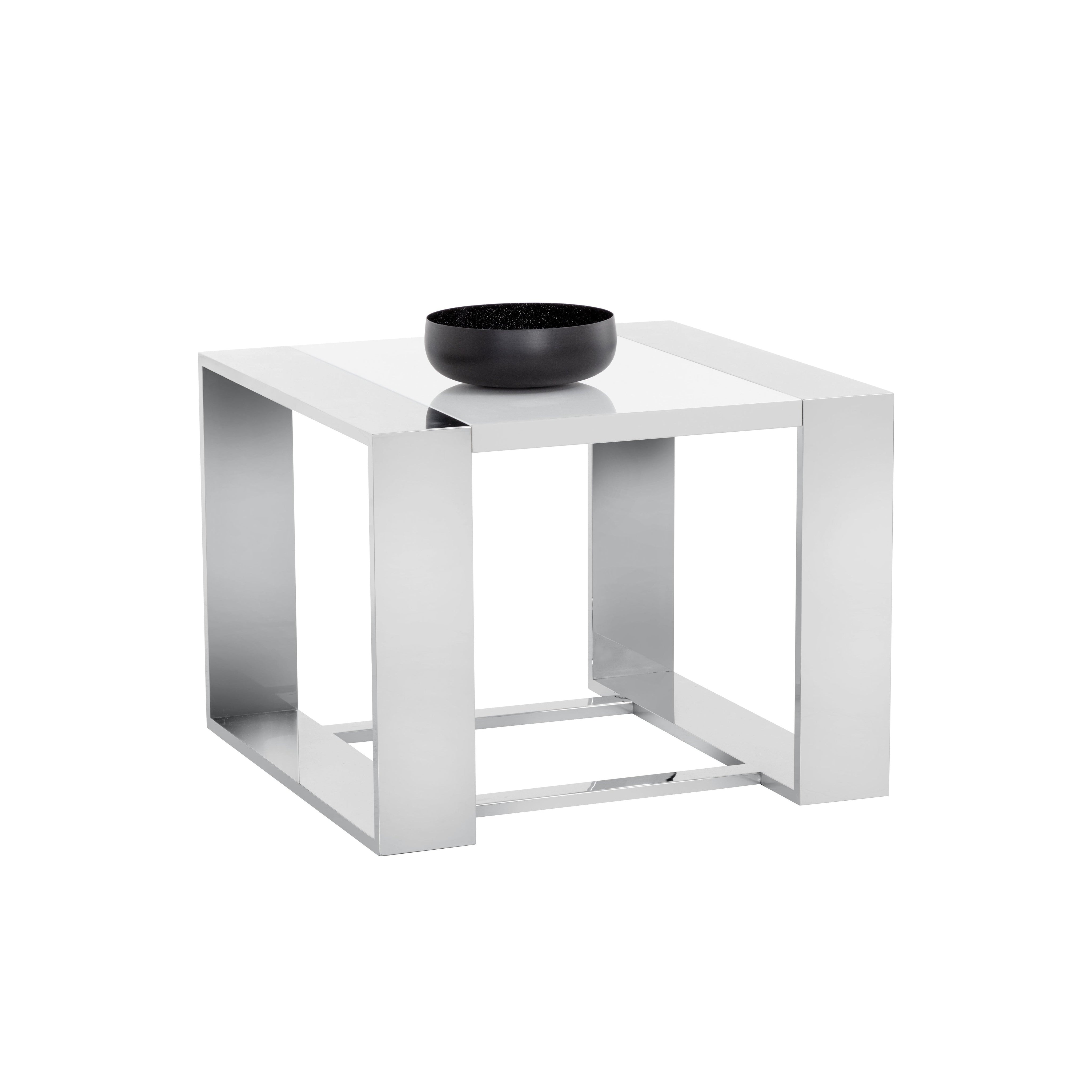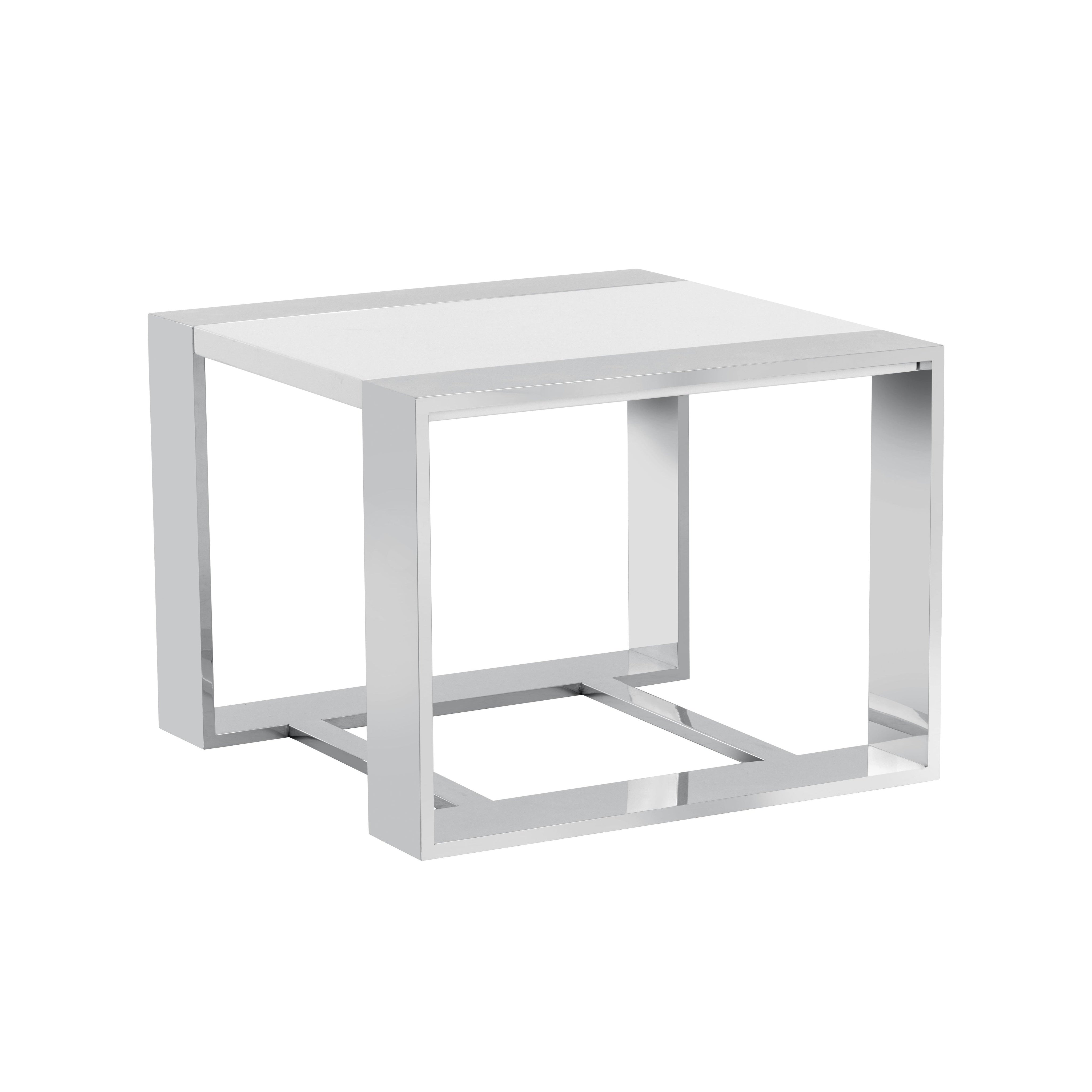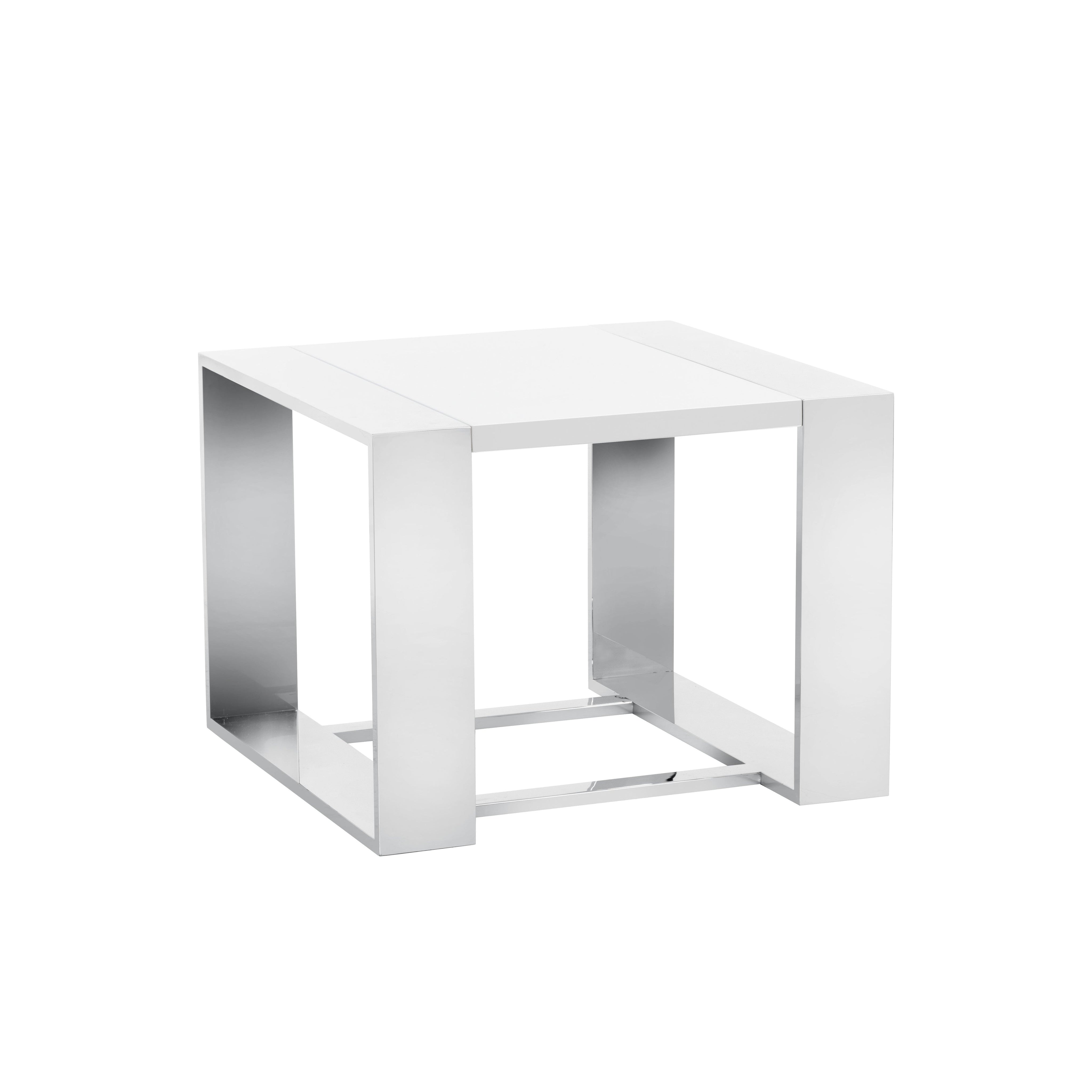 A distinctly modern end table. Features a high gloss white top with a stunning stainless steel frame. A true show piece suitable for both contract and residential environments. Coordinating coffee table in rectangle and square shapes also available.