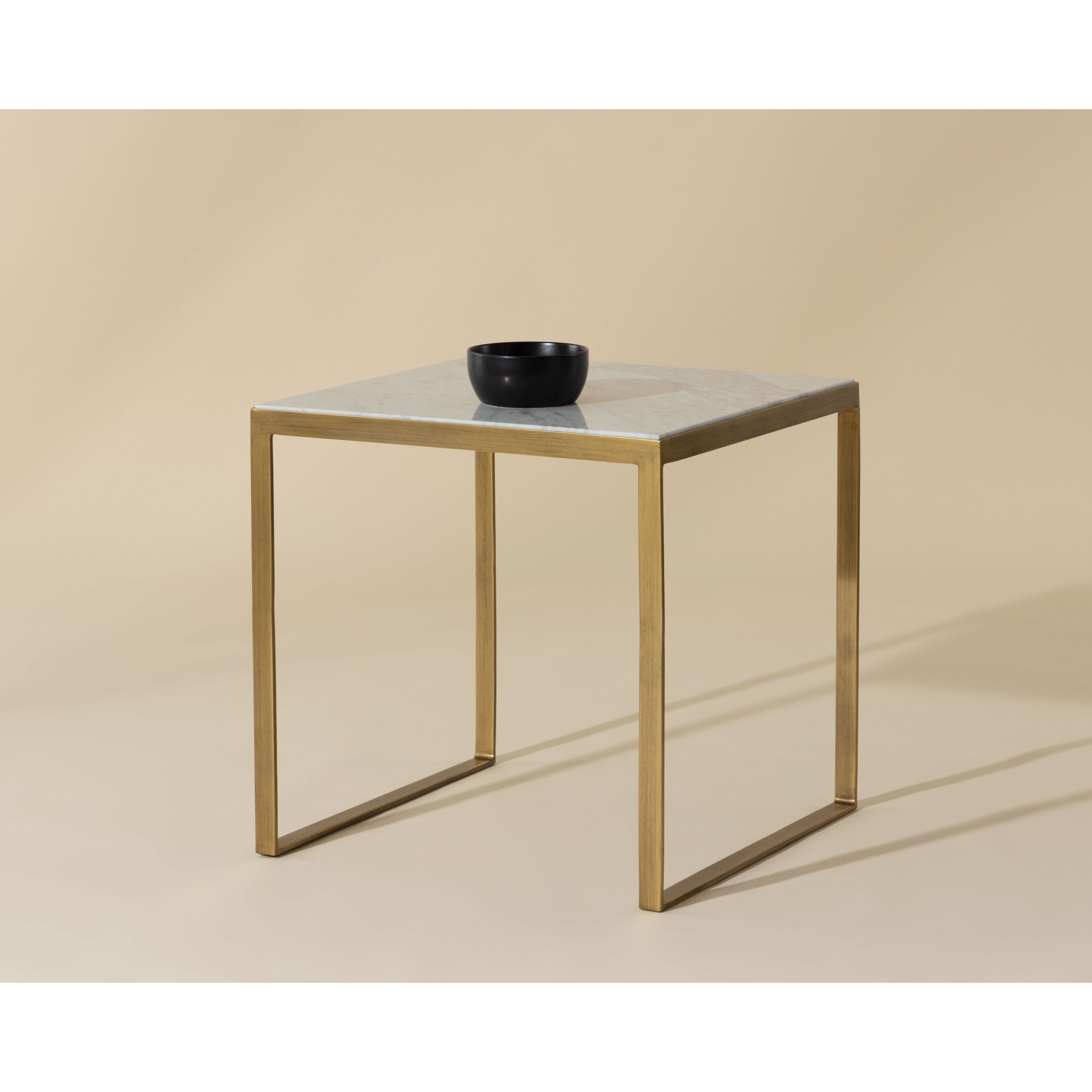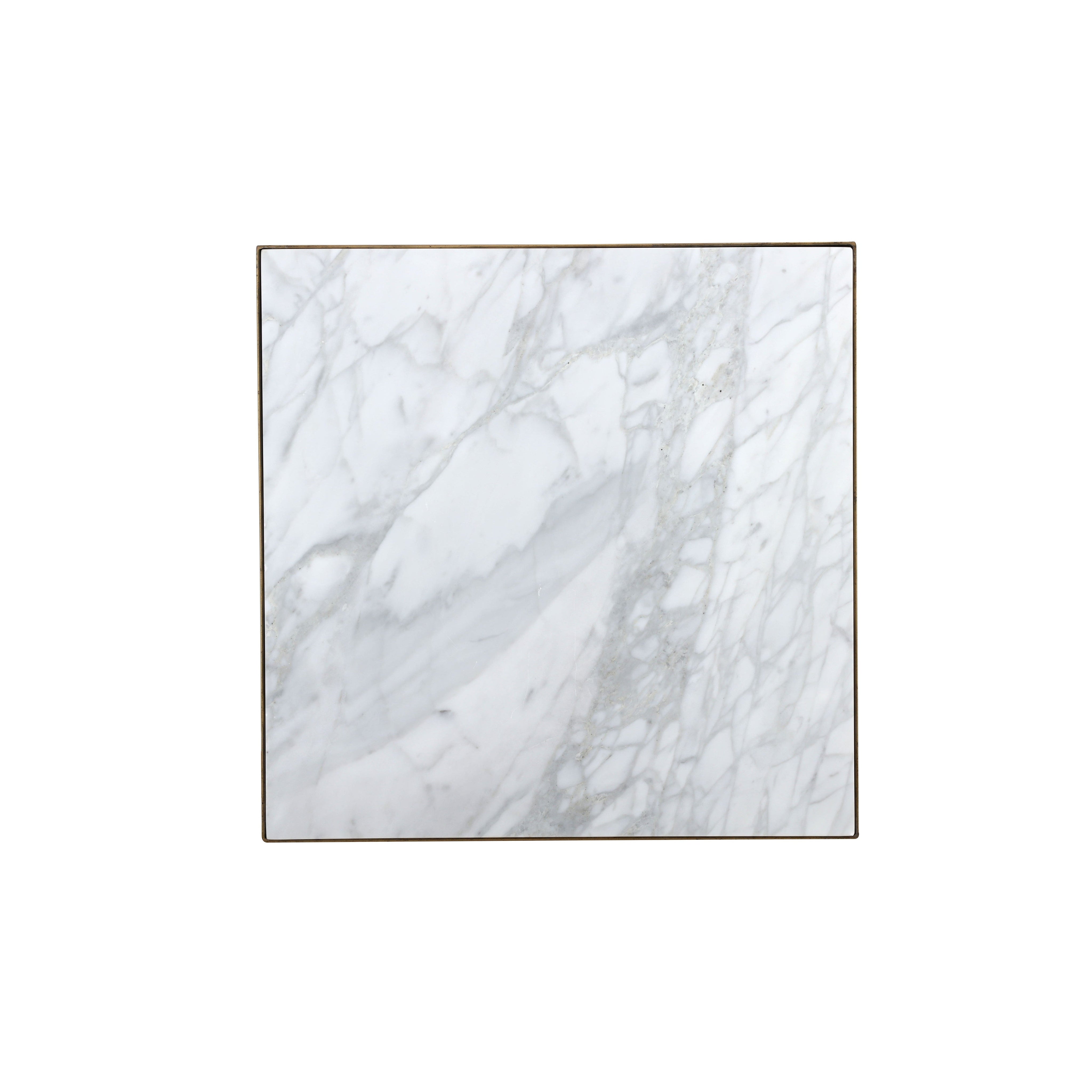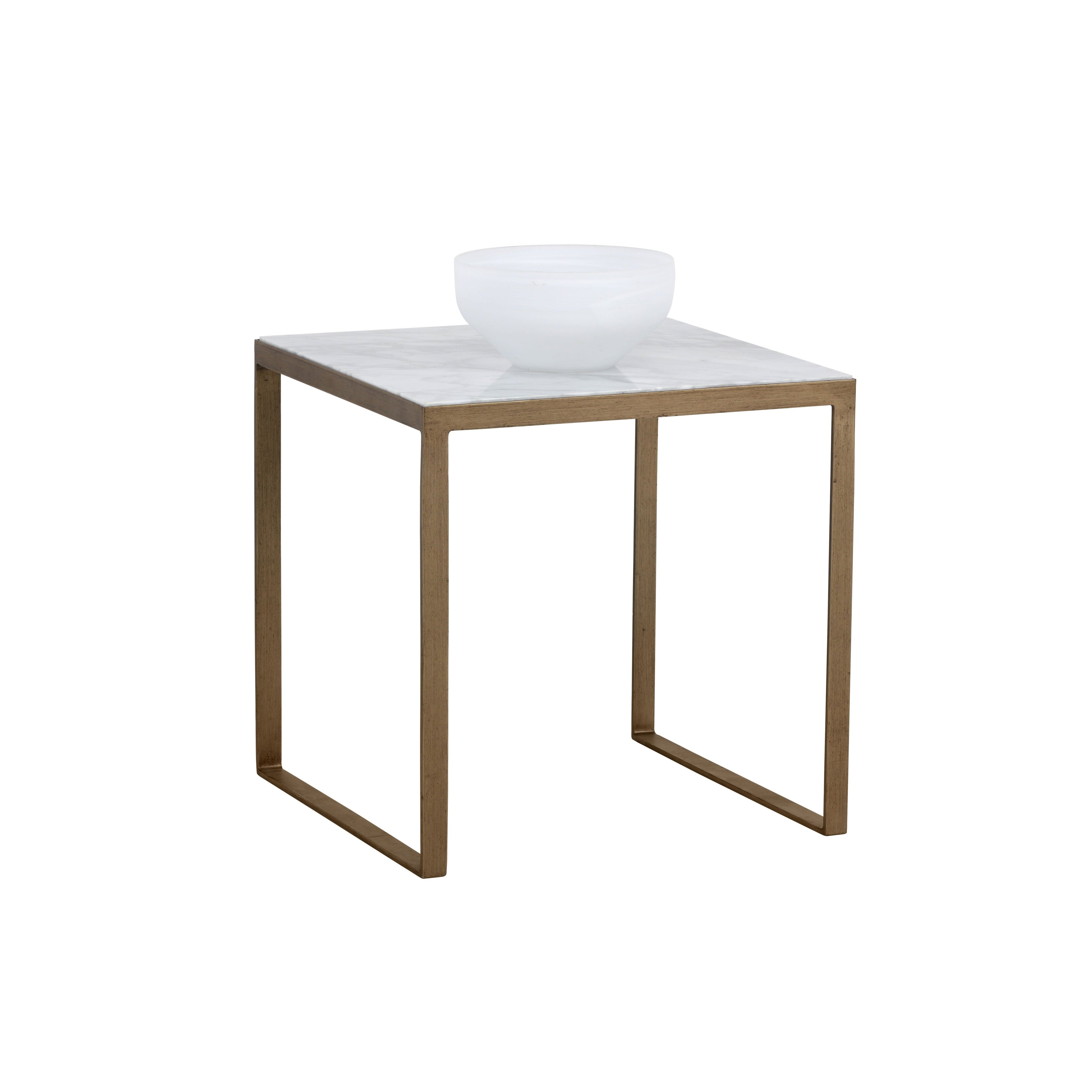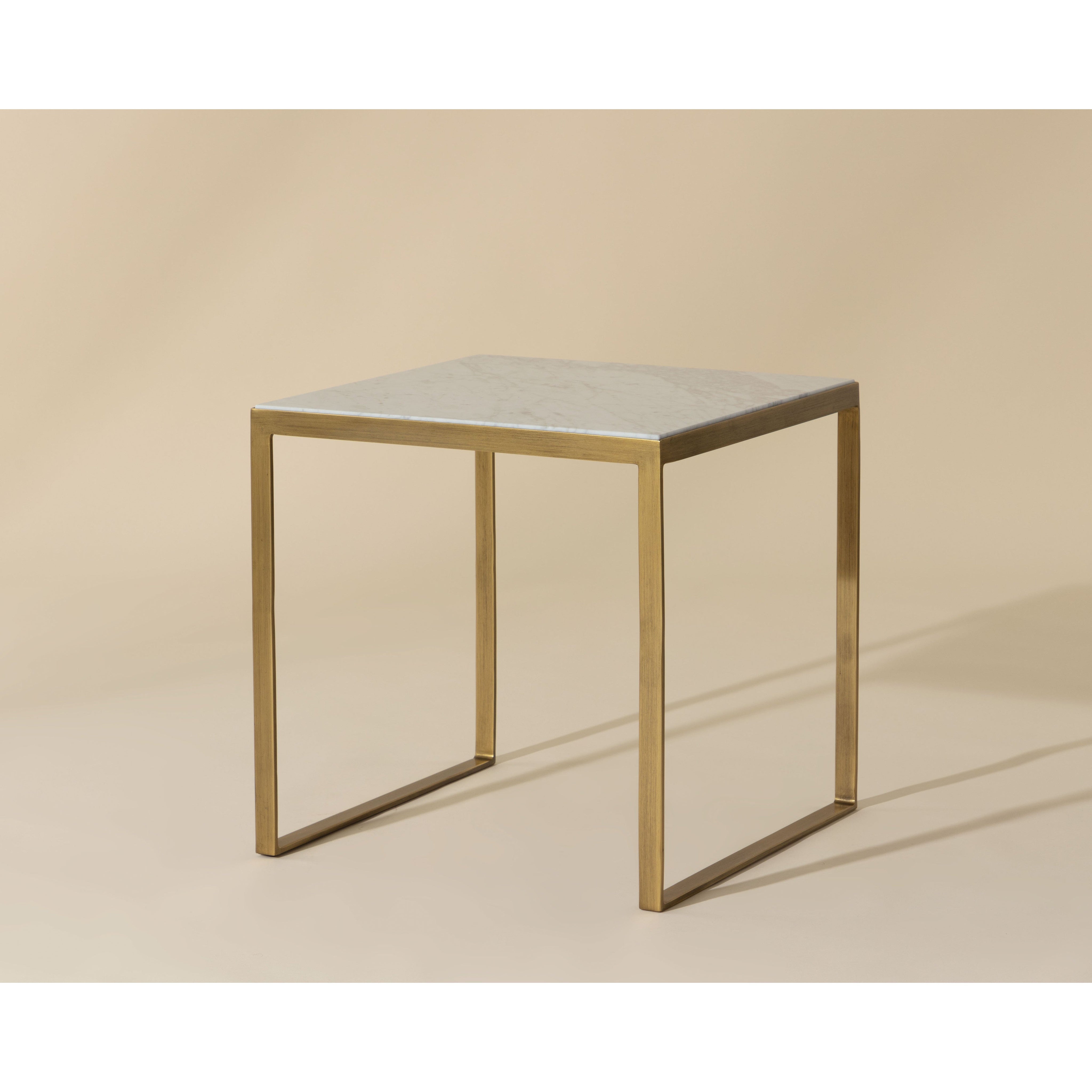 A beautiful modern marble end table. Tabletop features a 1" layer of white Italian marble supported by an antique brass iron frame. As marble is a natural material, unique veining, pitting, fissures, micro-cracks and colour variations are all characteristics that add to the uniqueness and beauty of each piece.