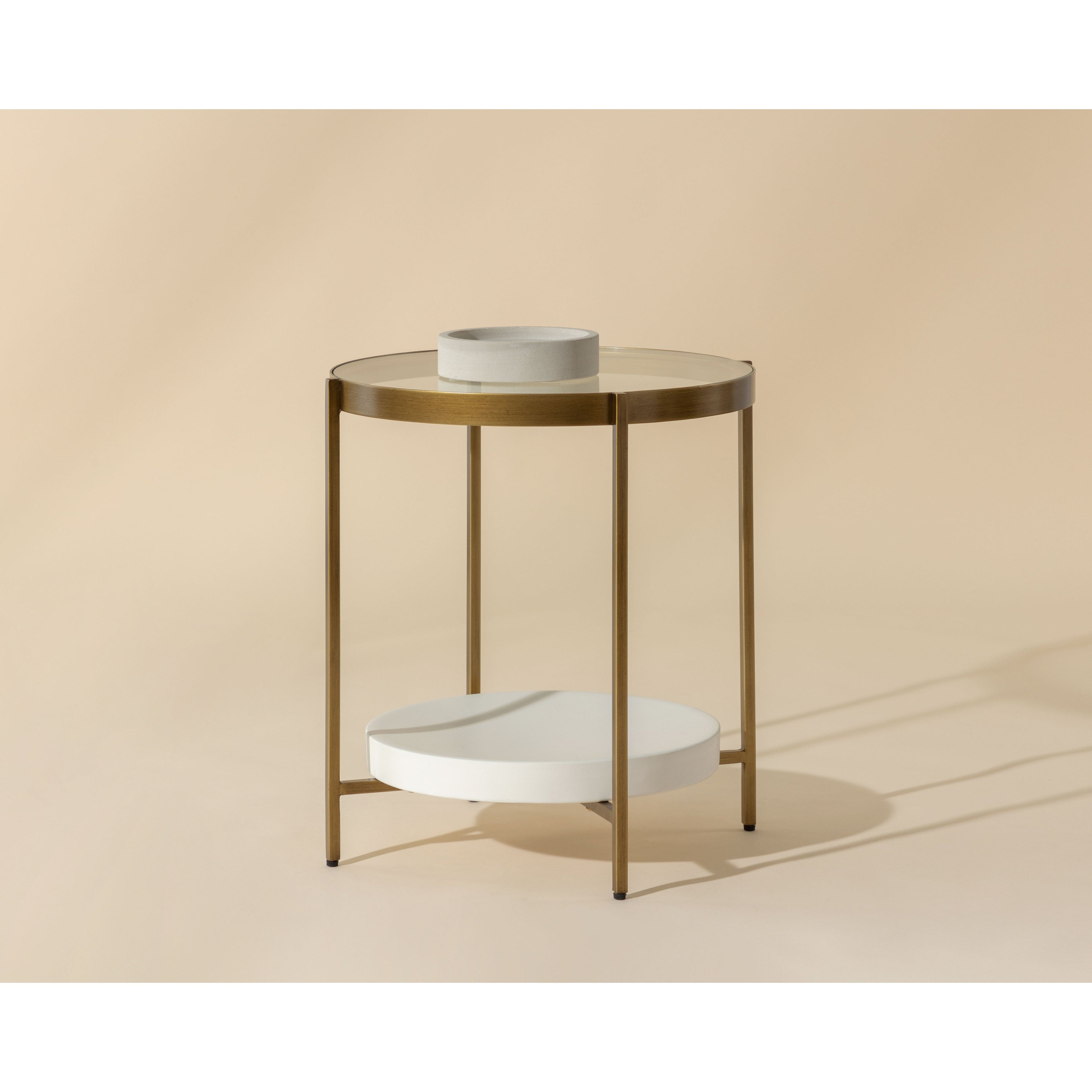 Incorporate an air of understated elegance into your designs with this end table. A beautiful round glass top and white concrete shelf are supported by a brushed antique brass finished steel frame. Crafted from a natural concrete mix, each piece will look different. Variations in colour, texture, imperfections, surface scratches and non-structural hairline cracks are considered inherent and valued qualities of the material.