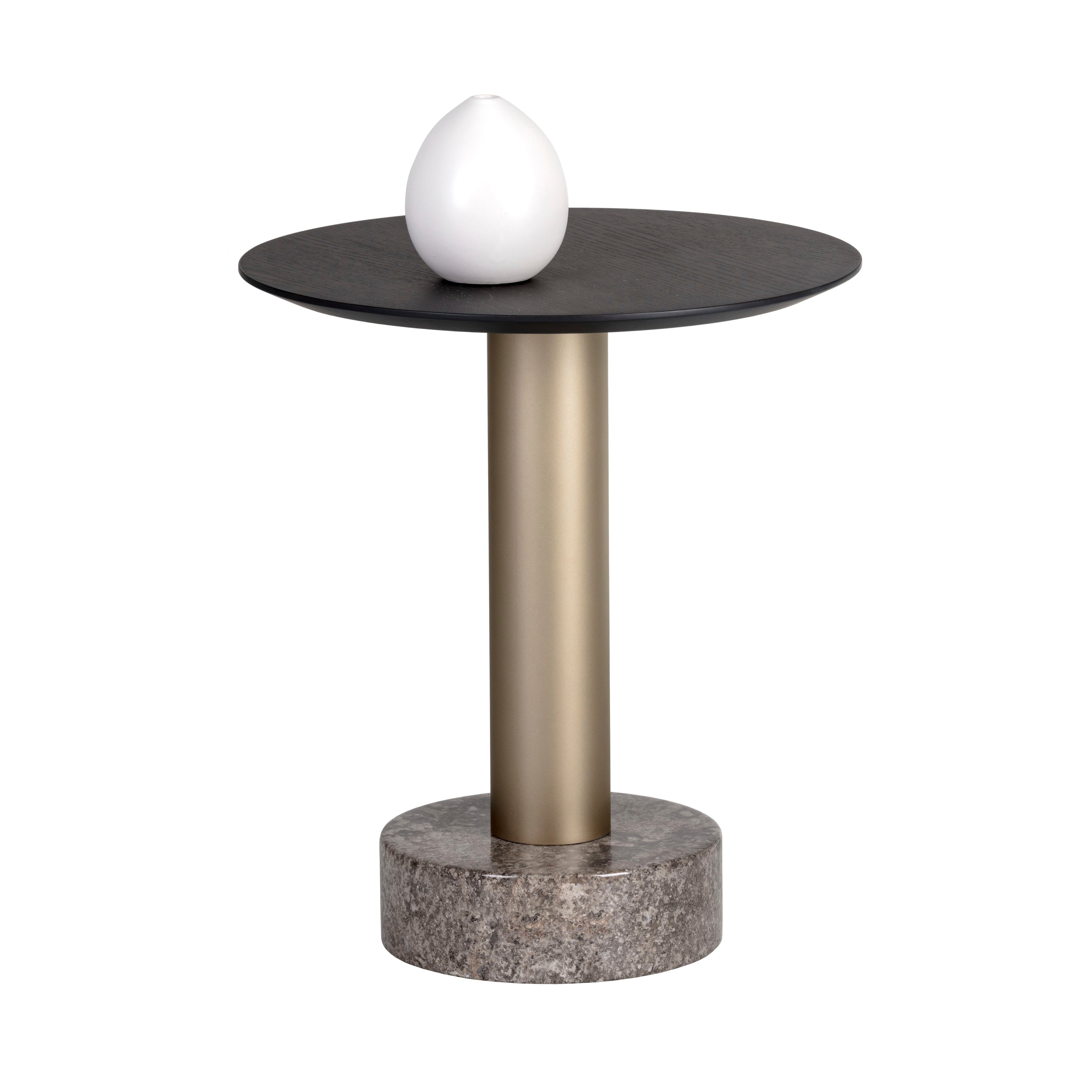 This end table offers a modern look with an organic feel. Features a substantial light grey marble and brushed gold iron base with a charcoal grey finished oak veneer top. Also available with a light grey marble and dark grey iron base with a raw umber finished oak veneer top. Pair with matching coffee table for added dimension. As marble is a natural material, unique veining, pitting, fissures, micro-cracks and colour variations are all characteristics that add to the uniqueness and beauty of each piece.