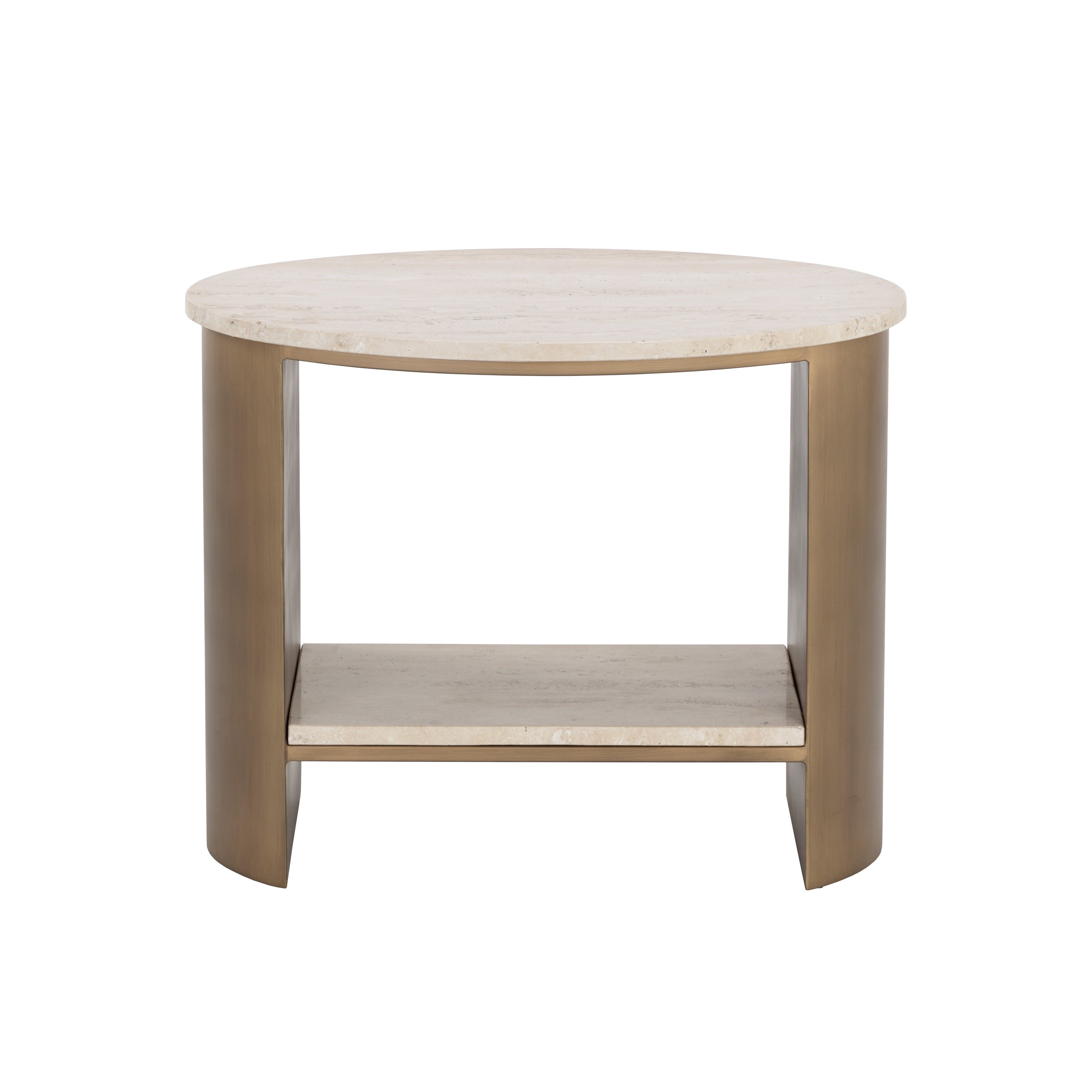 Versatile and timeless, the Roshni End Table will fit any setting. A natural travertine shelf and tabletop brings added warmth to the mid-century modern design. Completed with a powder-coated antique gold iron base.