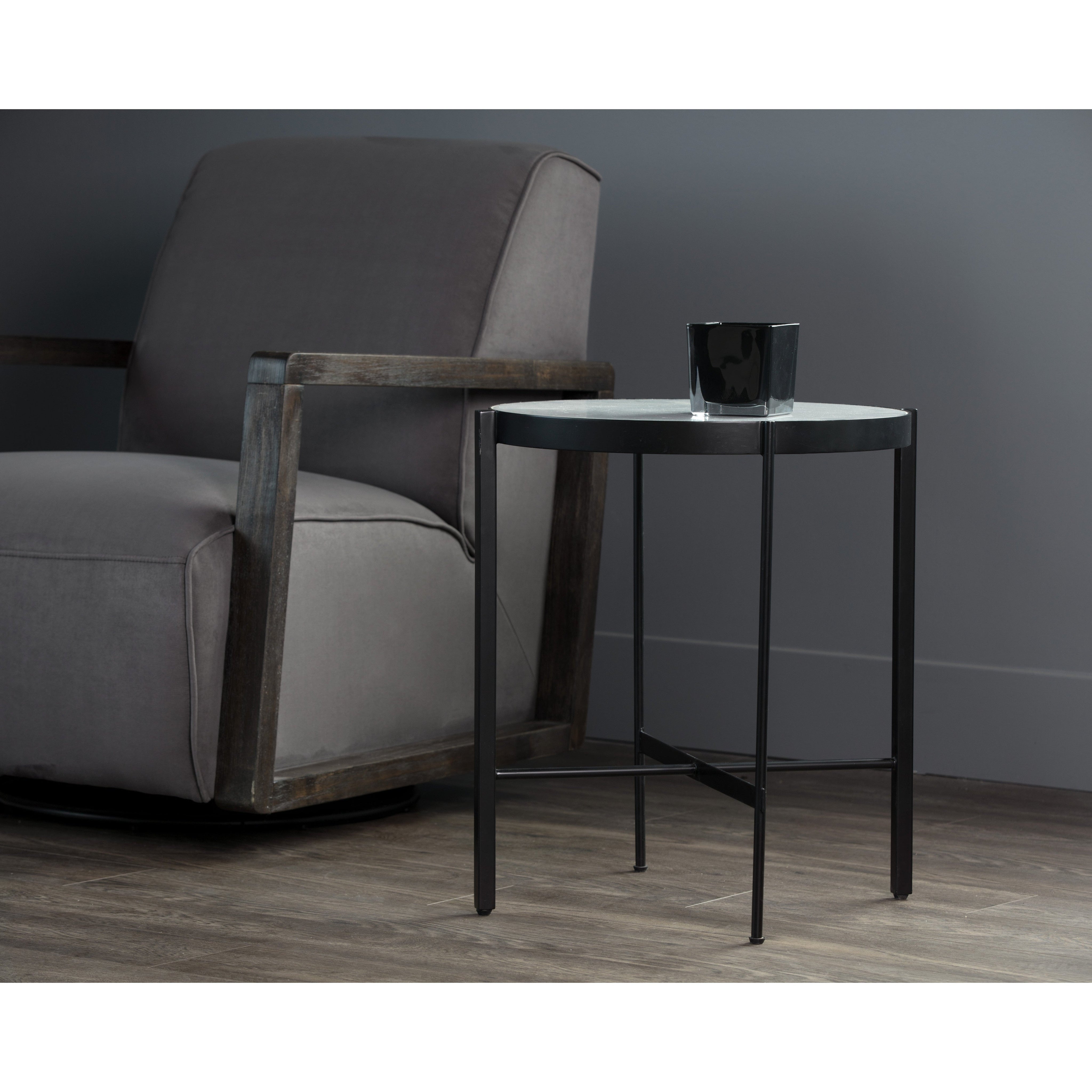 A sleek round end table that is cool and alluring. Designed with a simple and linear matte black metal frame and white cararra marble top. Can be paired with the coordinating coffee tables to create a unique table grouping. As marble is a natural material, unique veining, pitting, fissures, micro-cracks and colour variations are all characteristics that add to the uniqueness and beauty of each piece.