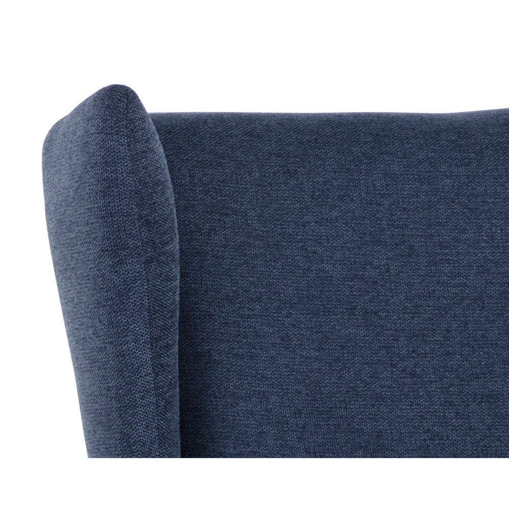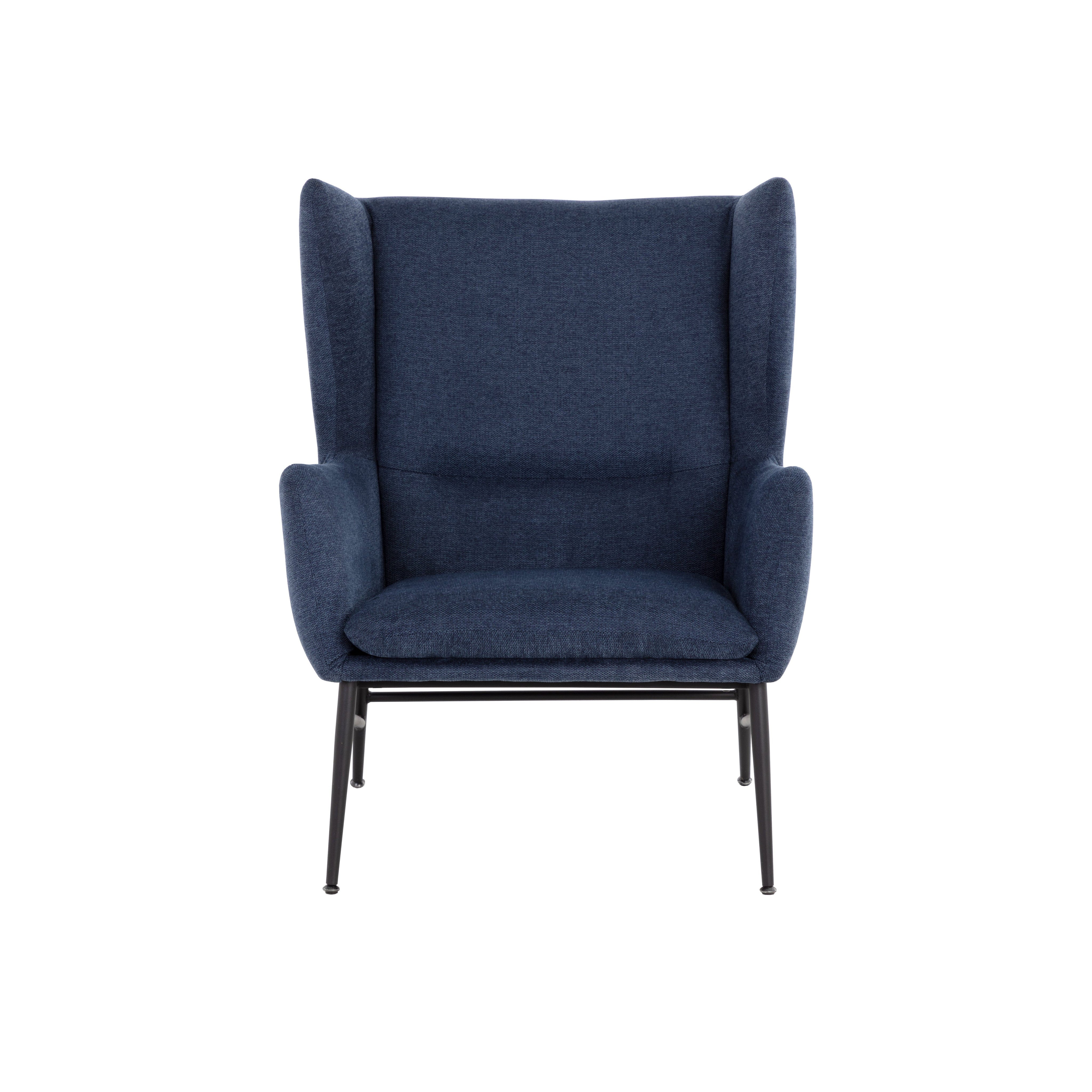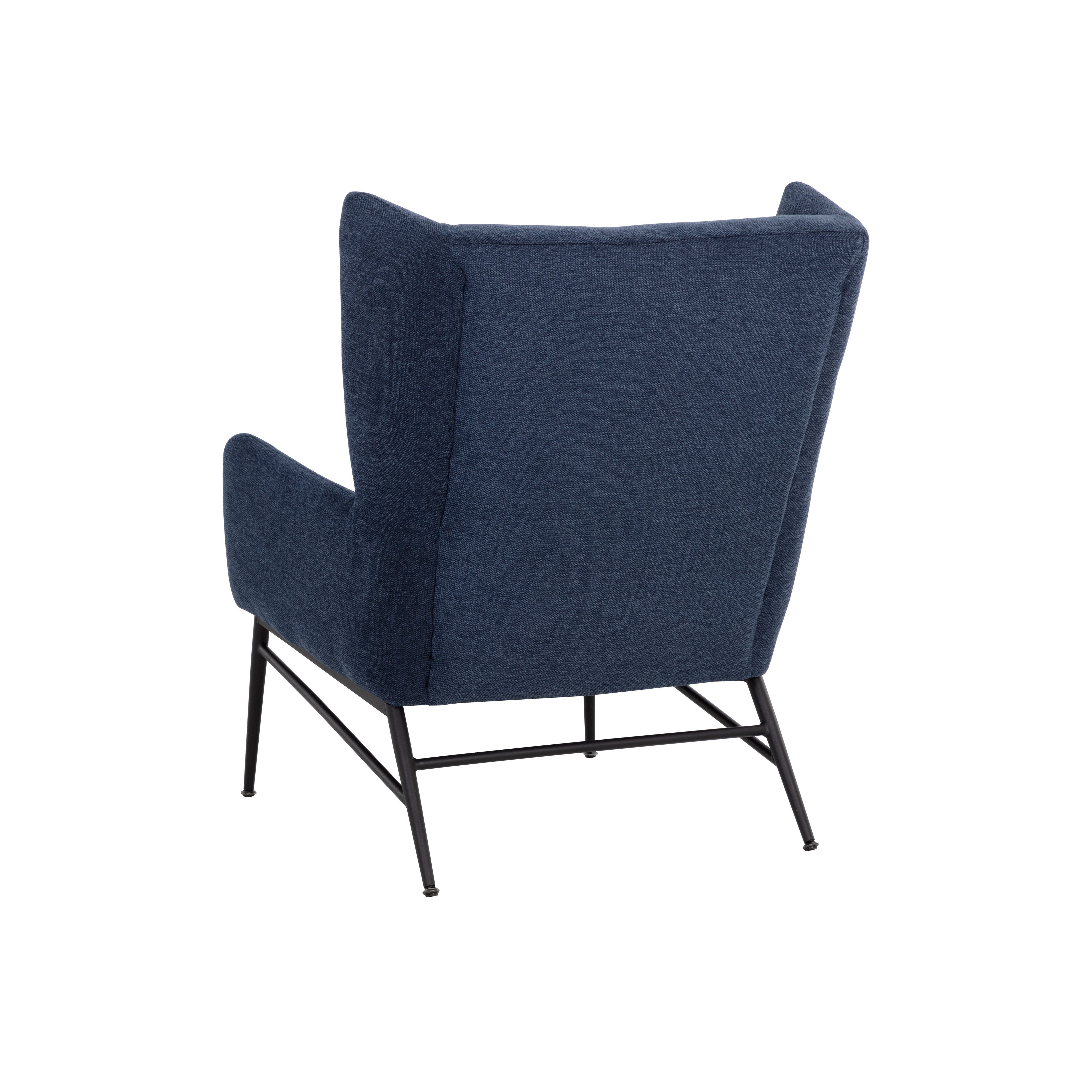 Elevate any space with this contemporary lounge chair that has a marvelous wingback design. Stocked in belfast navy fabric with subtle horizontal tufting on the interior seat. Completed with matte black powder coated steel frame and legs.