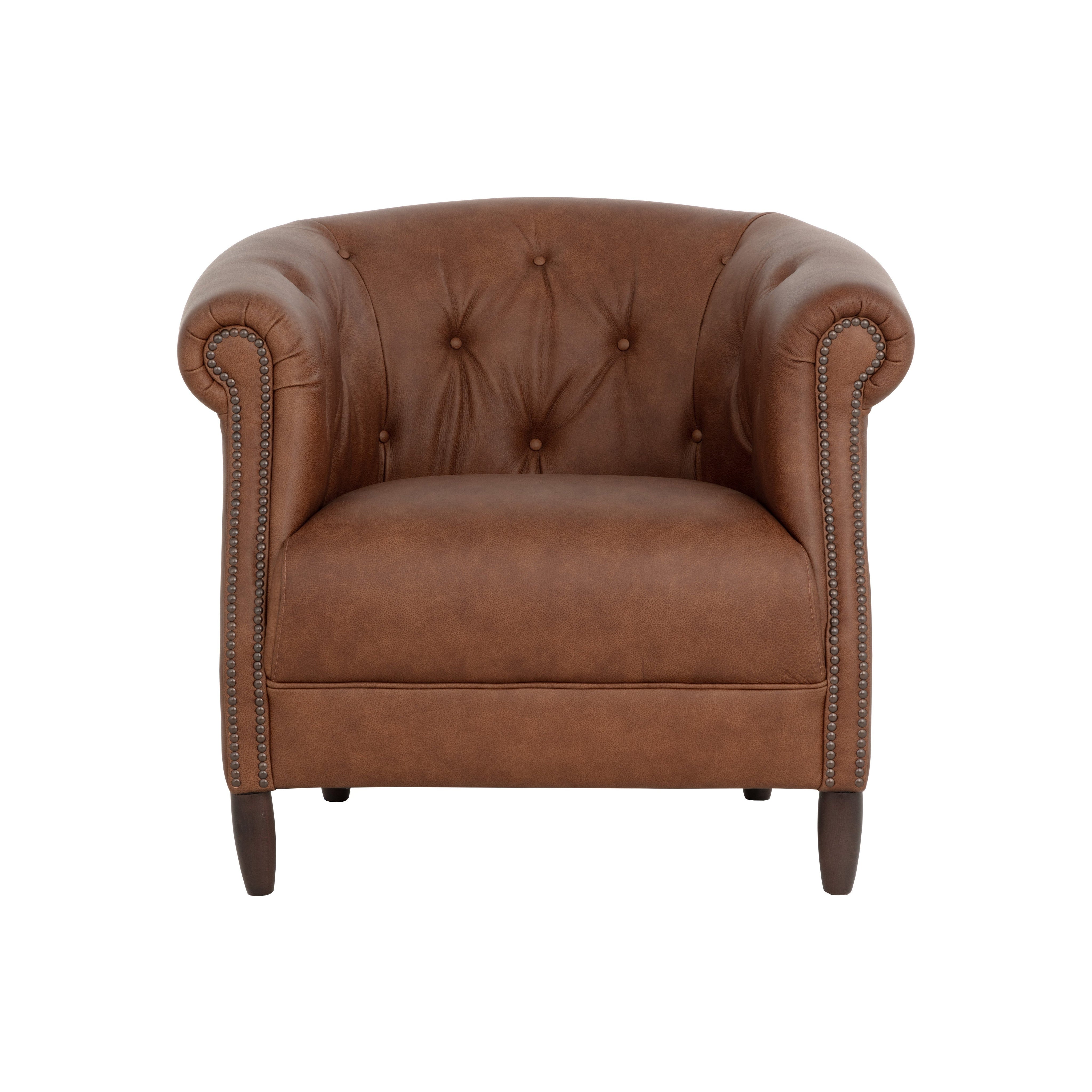 The Marjorie Lounge Chair infuses modern warmth to the old-world charm of the chesterfield style. Expertly upholstered in a rich cognac shade of Italian bovine leather, it boasts aged copper nail heads that are applied by hand. With its masterfully rolled arms, this chair has a vintage appeal that will only flourish with time.