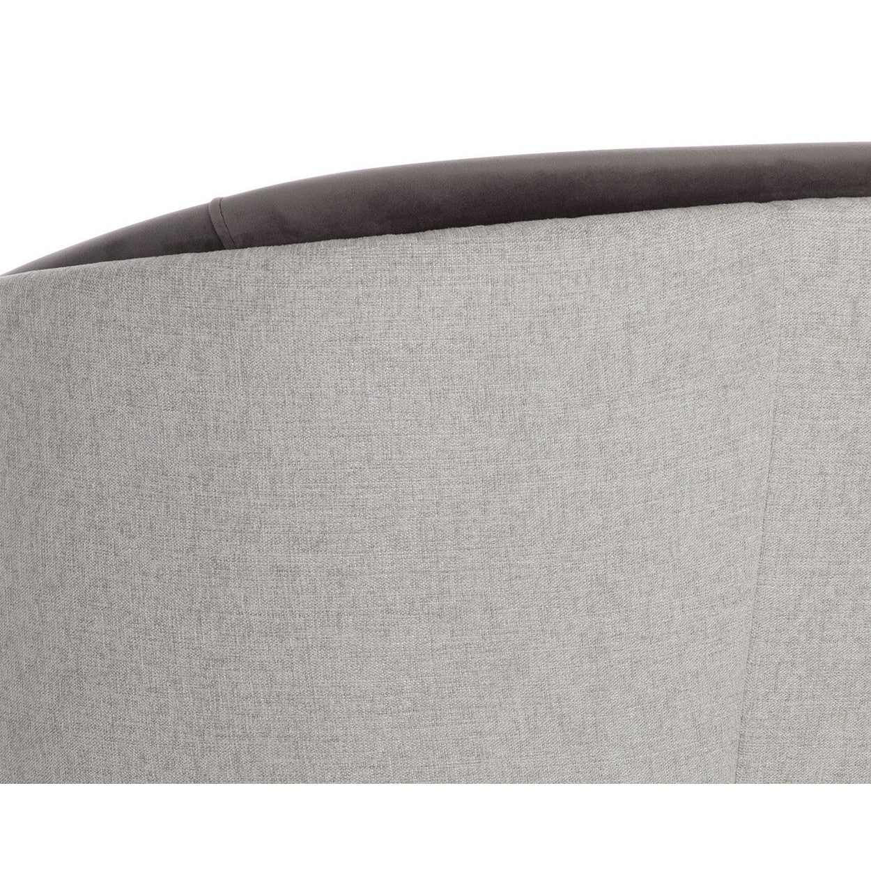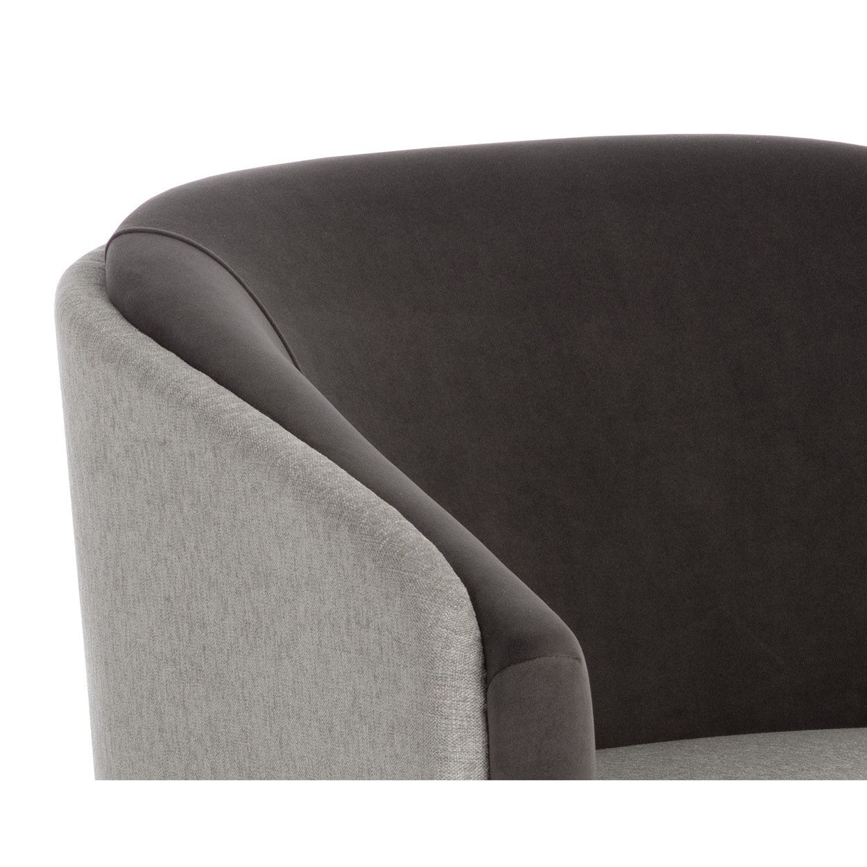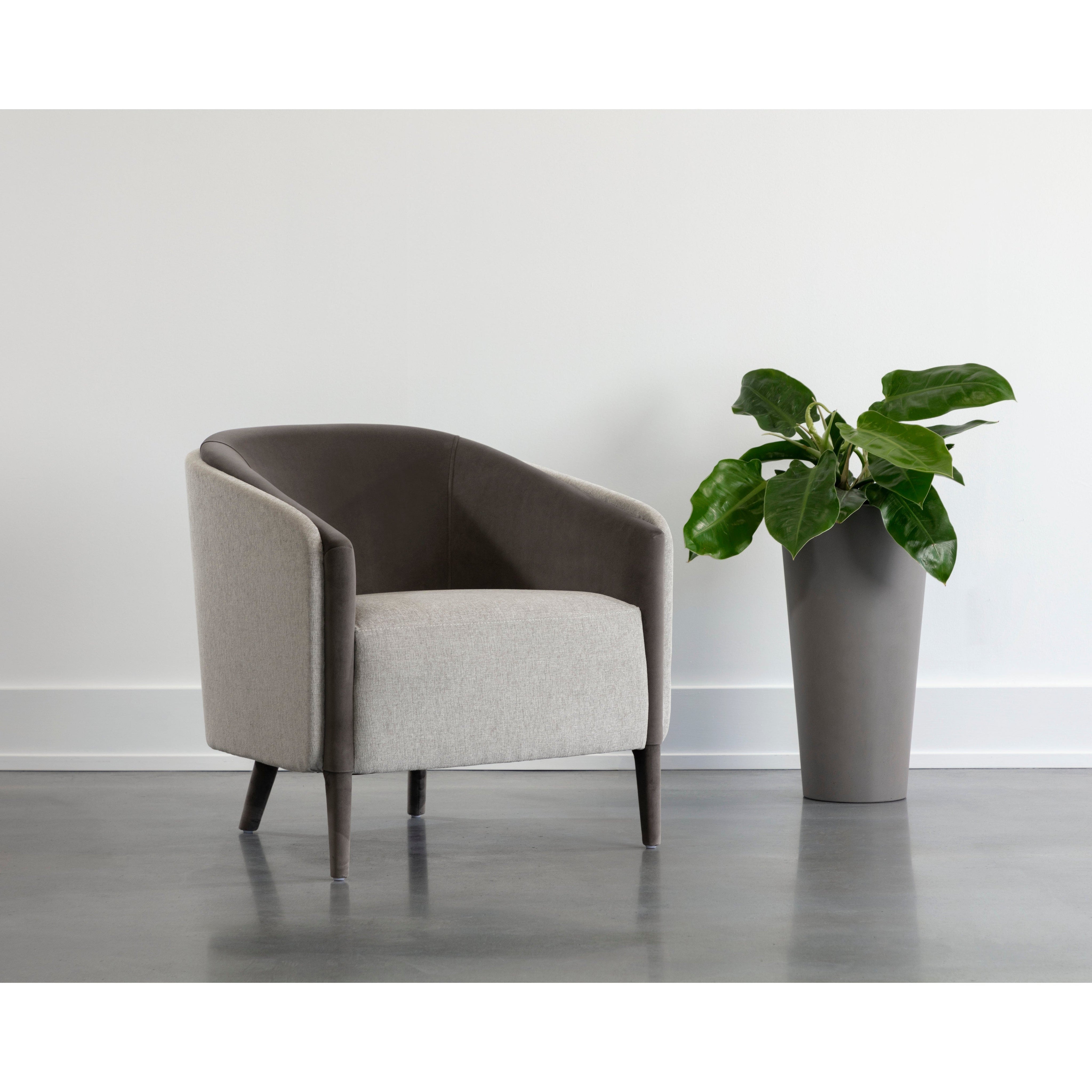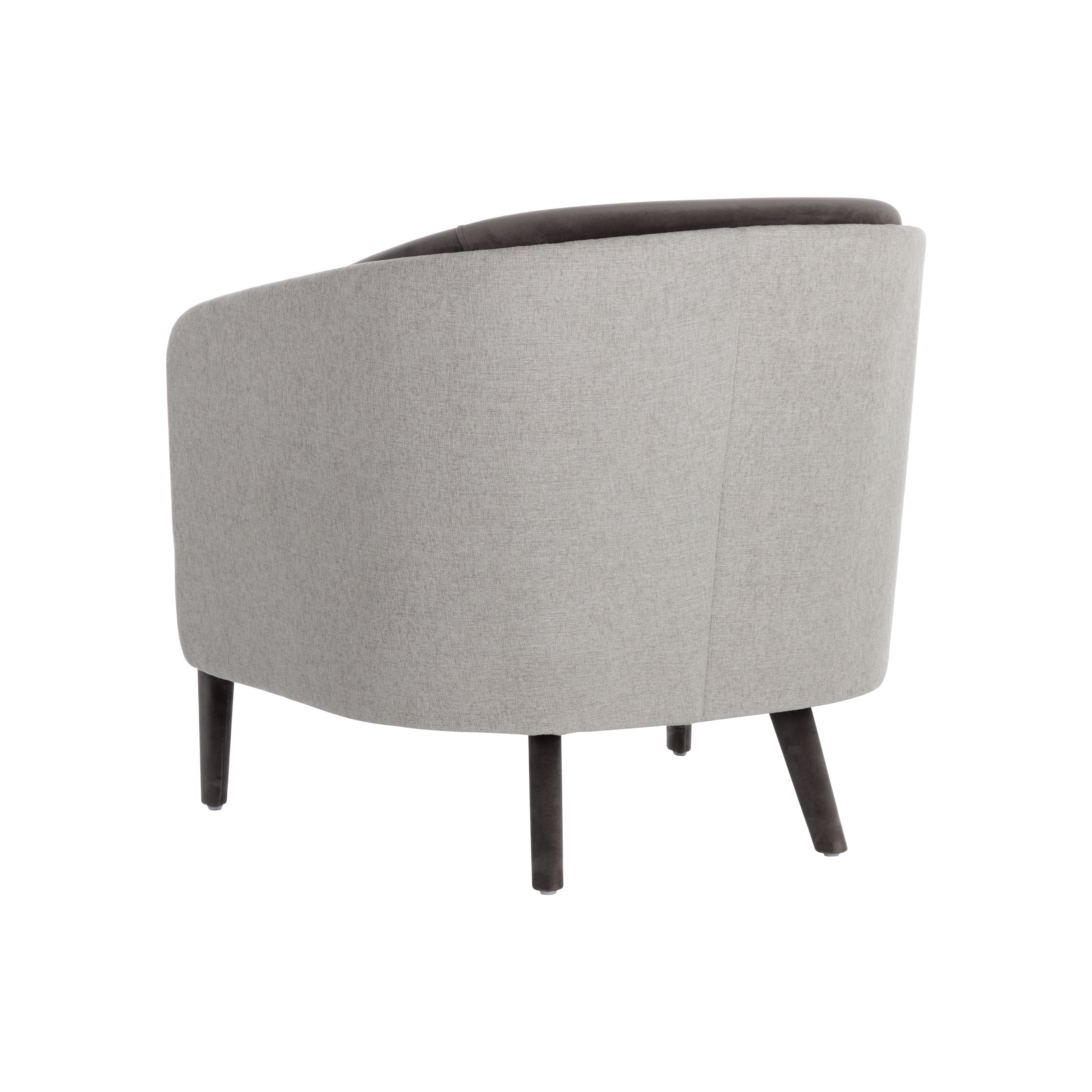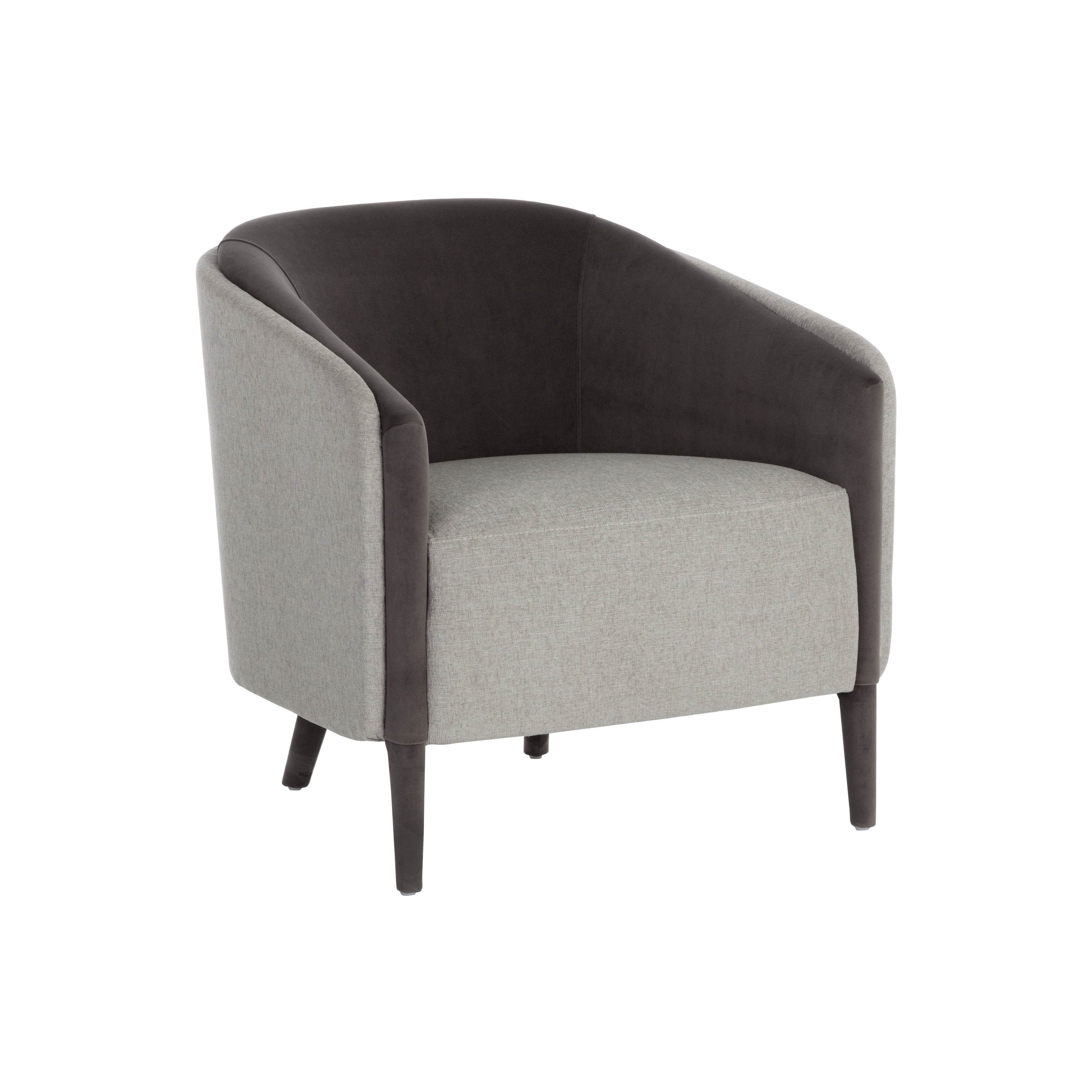 With an alluring barrel back seatback, this stunning lounge chair will add a touch of comfort to any space. Features an upholstered exterior and seat in ernst silverstone fabric, and completed with coordinating meg ash fabric on the interior seat and legs. Also available in a san remo winter cloud fabric and antonio charcoal fabric combination.