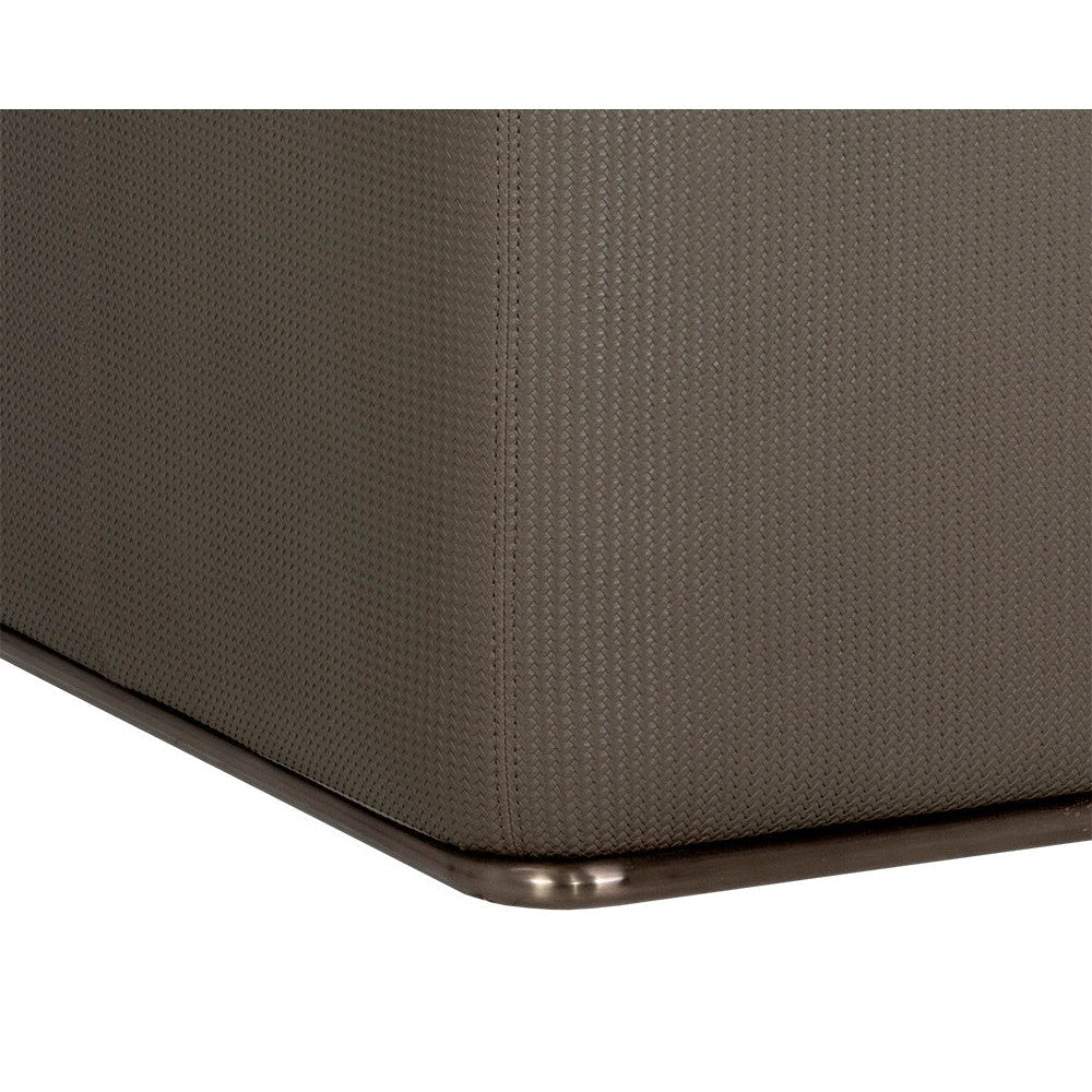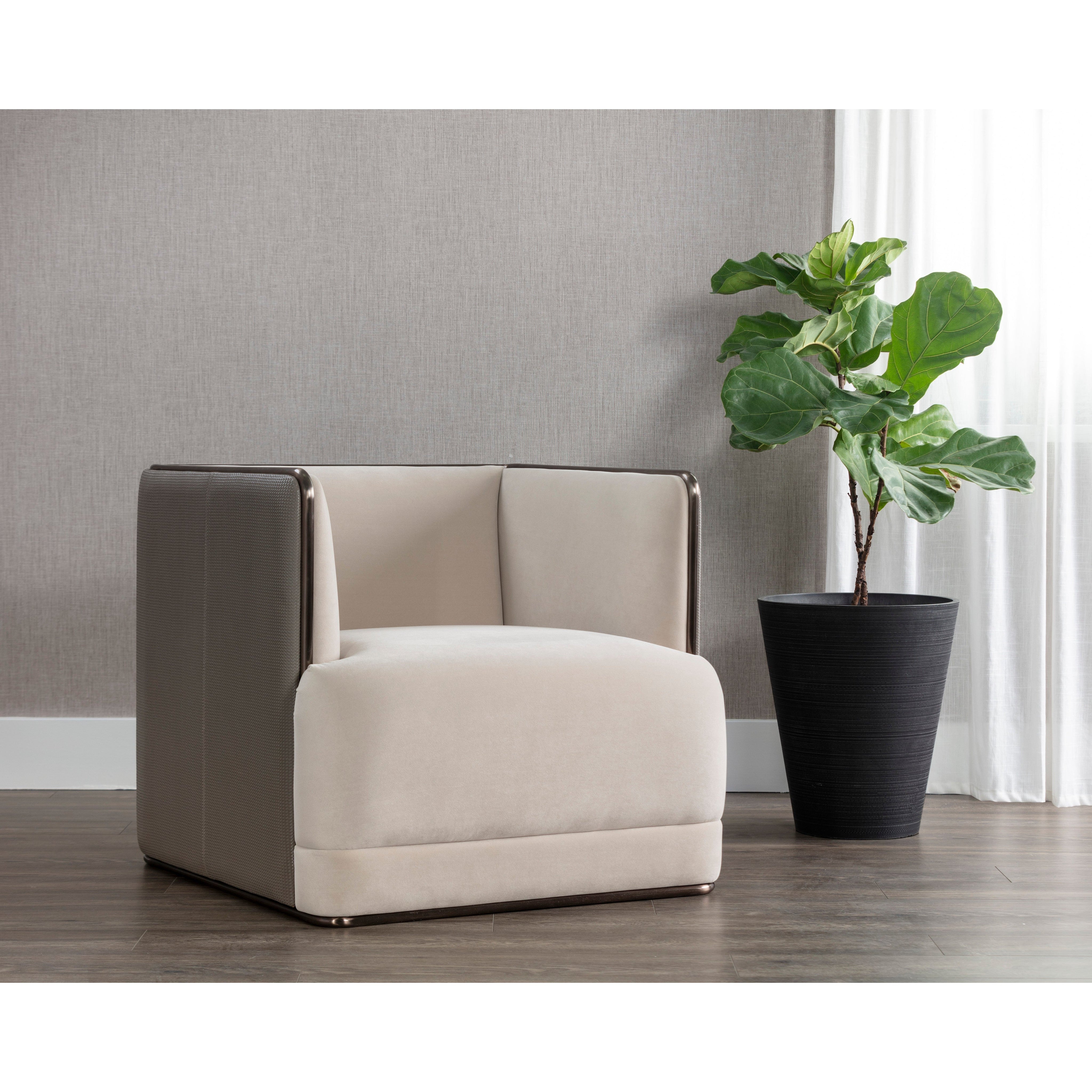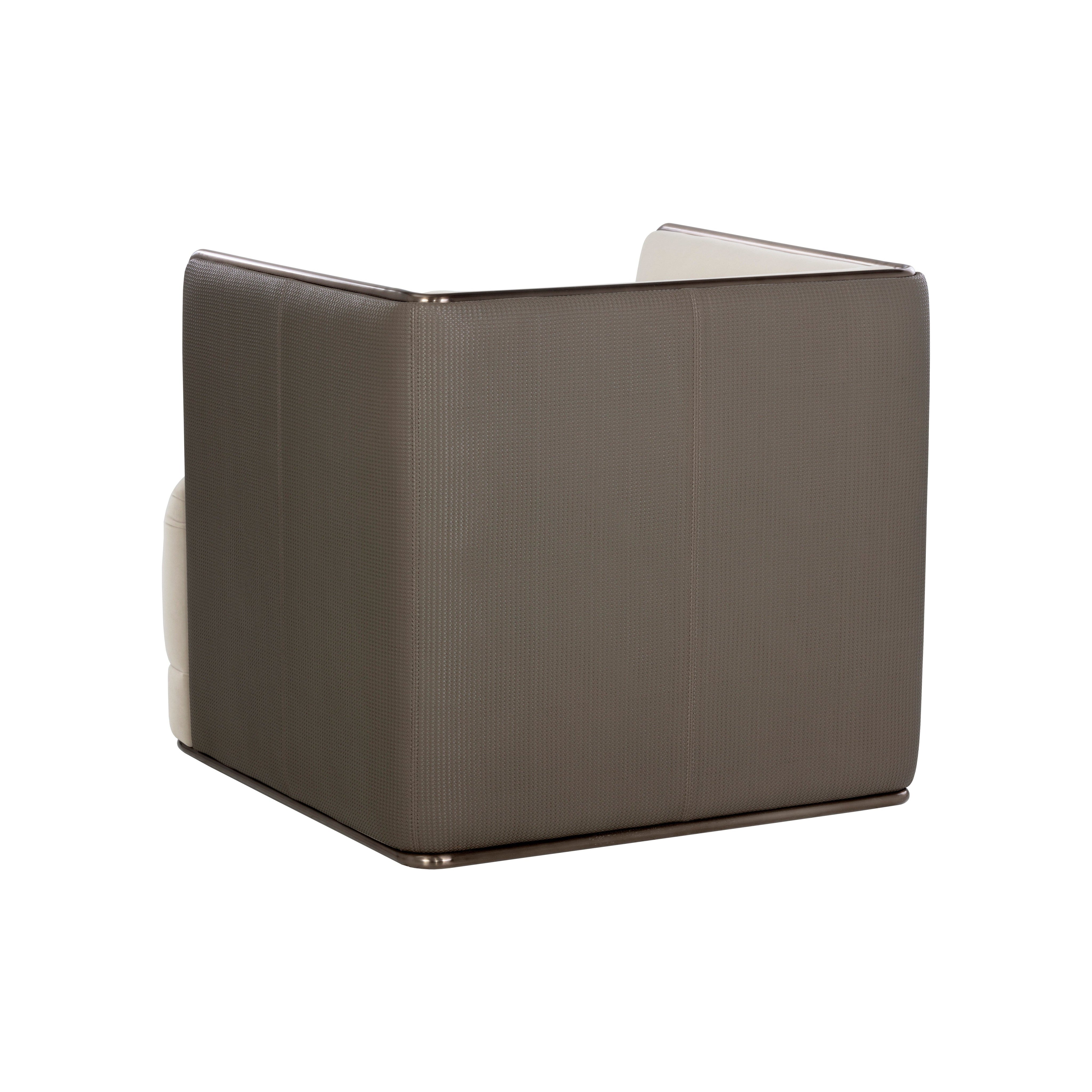 A bold form defines this modern and structured armchair that is guaranteed to turn heads. Features an interior upholstered in meg taupe fabric and an exterior in textured porcini taupe faux leather. Completed with an antique bronze stainless steel frame. Coordinating sofa also available. Handle With Care: This design has been crafted with faux leather. Faux leather is manufactured to reflect the natural characteristics of leather; as such, colour variations, markings wrinkles, grooves, and light scratches are appreciated characteristics. No two pieces will be alike. Visit our Product Care page for more information on how to ensure the lasting beauty of this piece.