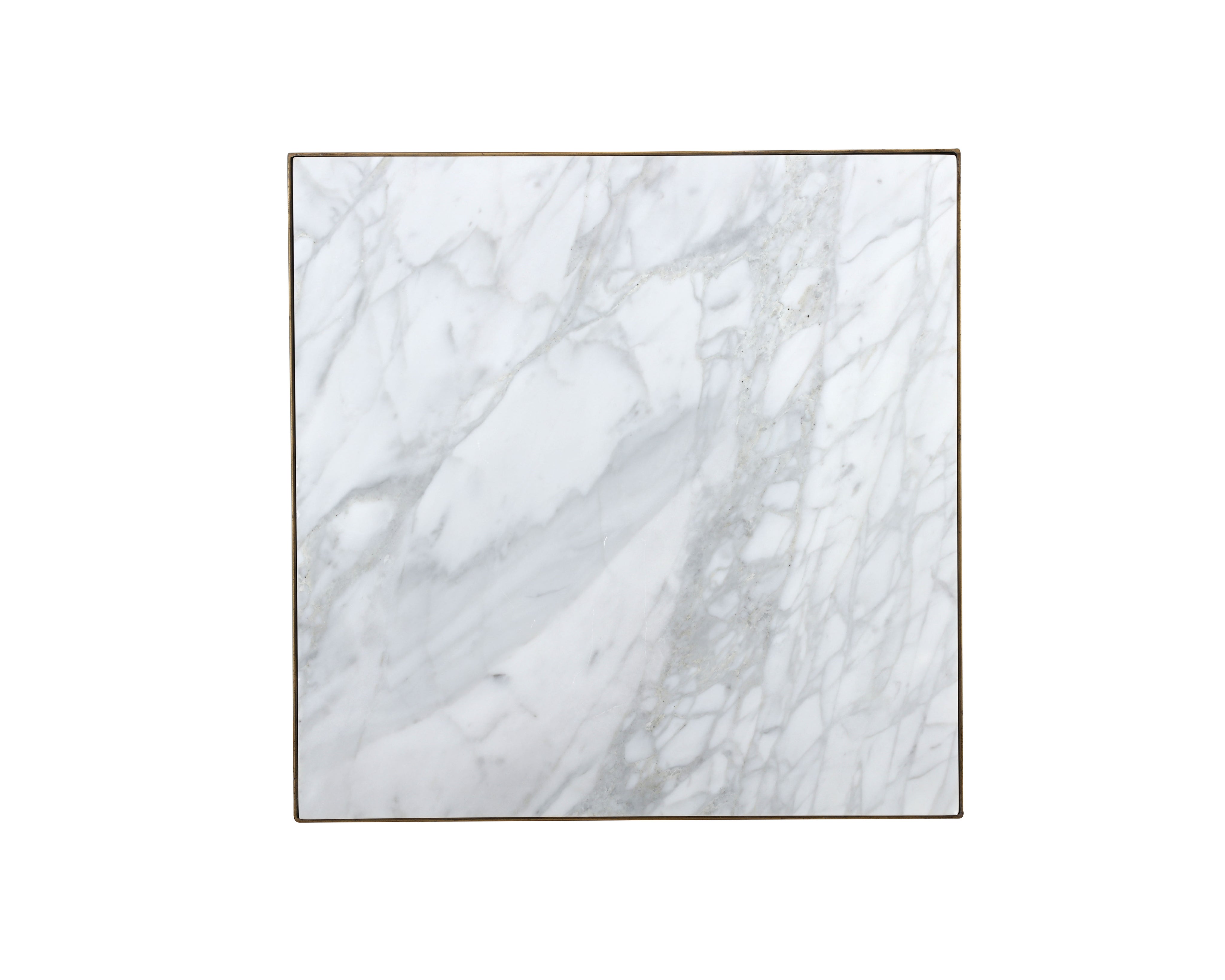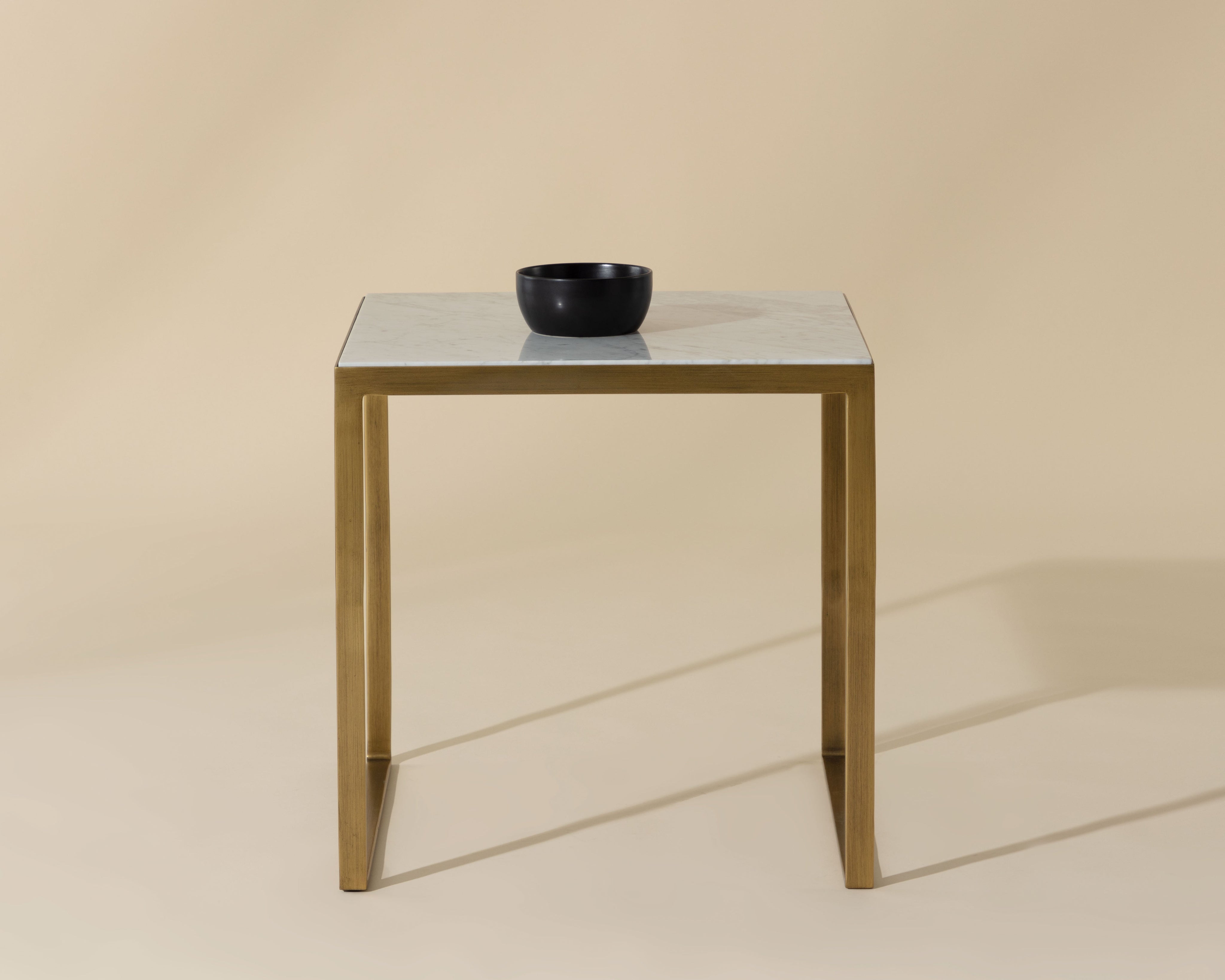 A beautiful modern marble end table. Tabletop features a 1" layer of white Italian marble supported by an antique brass iron frame. As marble is a natural material, unique veining, pitting, fissures, micro-cracks and colour variations are all characteristics that add to the uniqueness and beauty of each piece.