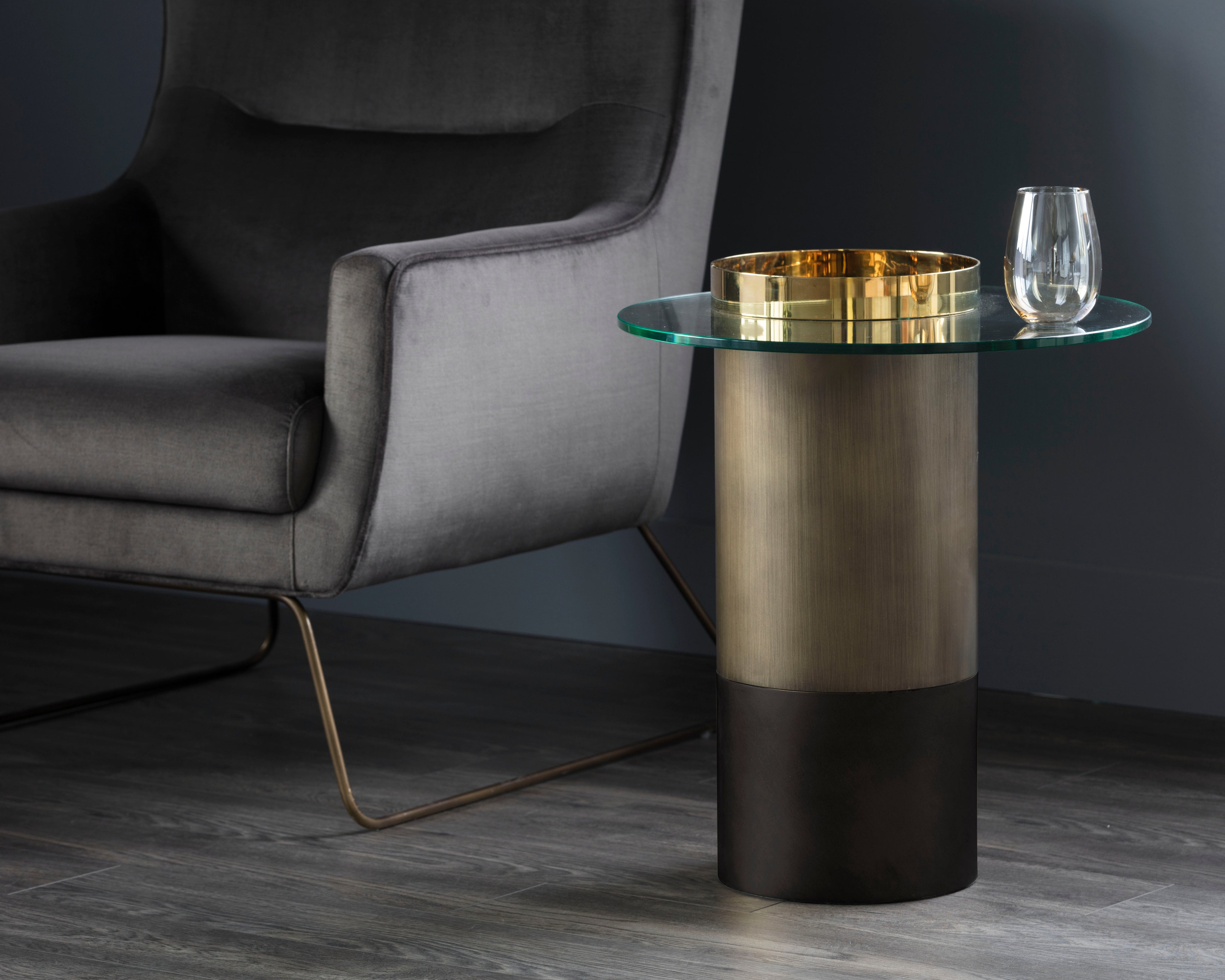 This stunning end table features a cylindrical stainless steel base in brown and gold finishes for a captivating contemporary look. Finished with a tempered clear glass and gold steel tray top.