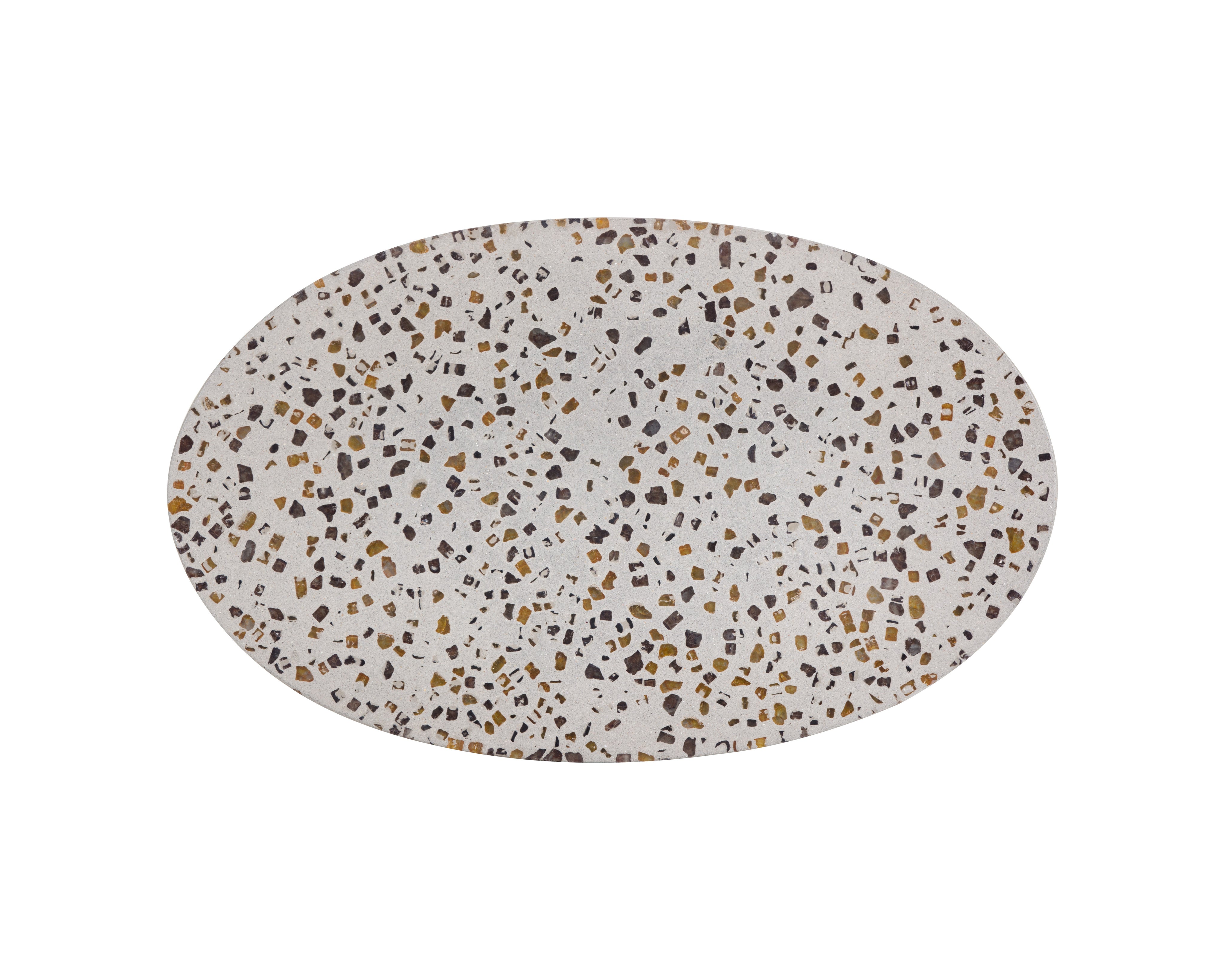 A truly unique end table. This design features a bold concrete base, a brushed brass steel rod and an oval terrazzo top. Terrazzo consists of chips of marble, quartz, granite and glass for a unique look; no two pieces are alike, and colours and/or patterns will vary. Crafted from a natural concrete mix, each piece will look different. Variations in colour, texture, imperfections, surface scratches and non-structural hairline cracks are considered inherent and valued qualities of the material.