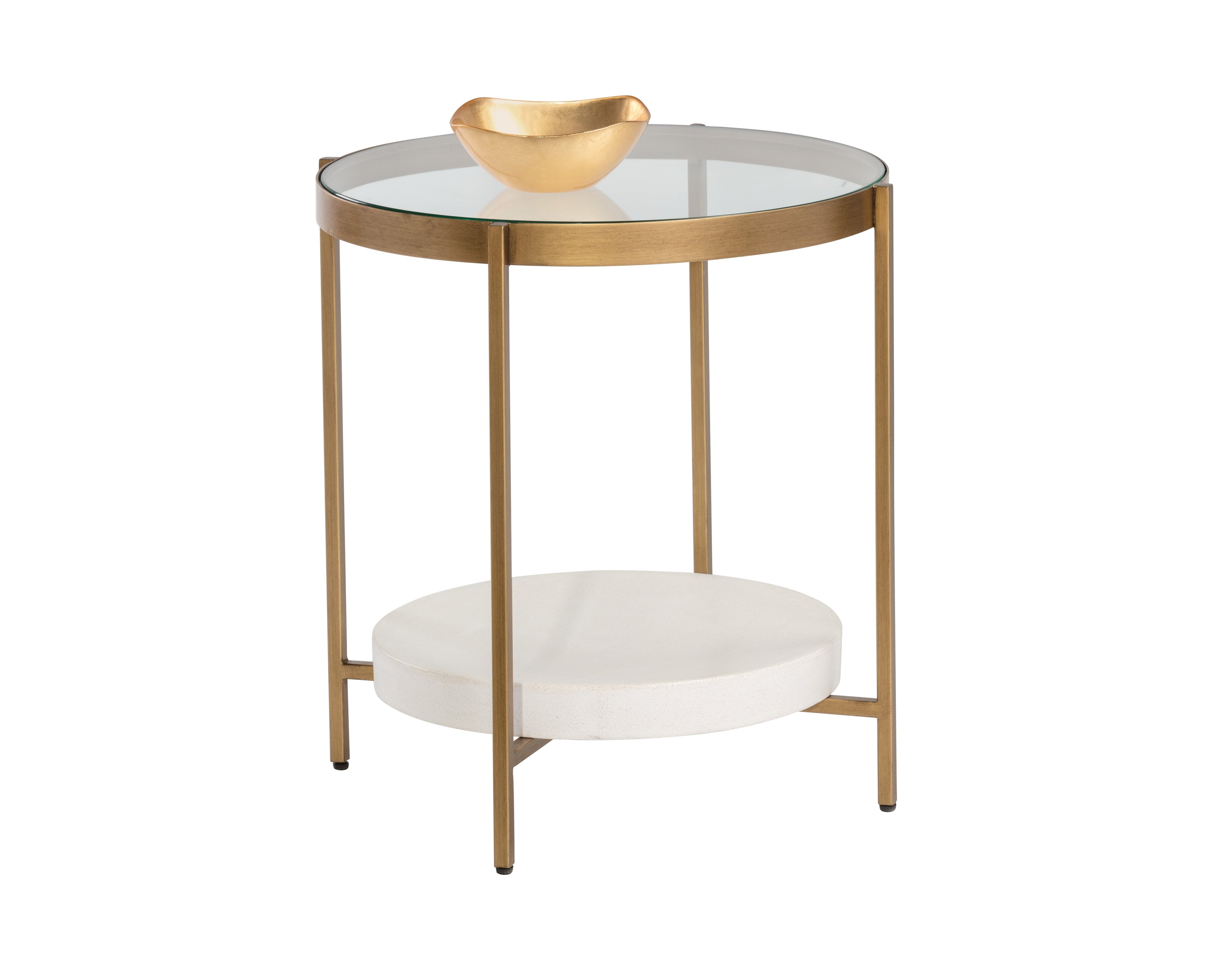 Incorporate an air of understated elegance into your designs with this end table. A beautiful round glass top and white concrete shelf are supported by a brushed antique brass finished steel frame. Crafted from a natural concrete mix, each piece will look different. Variations in colour, texture, imperfections, surface scratches and non-structural hairline cracks are considered inherent and valued qualities of the material.