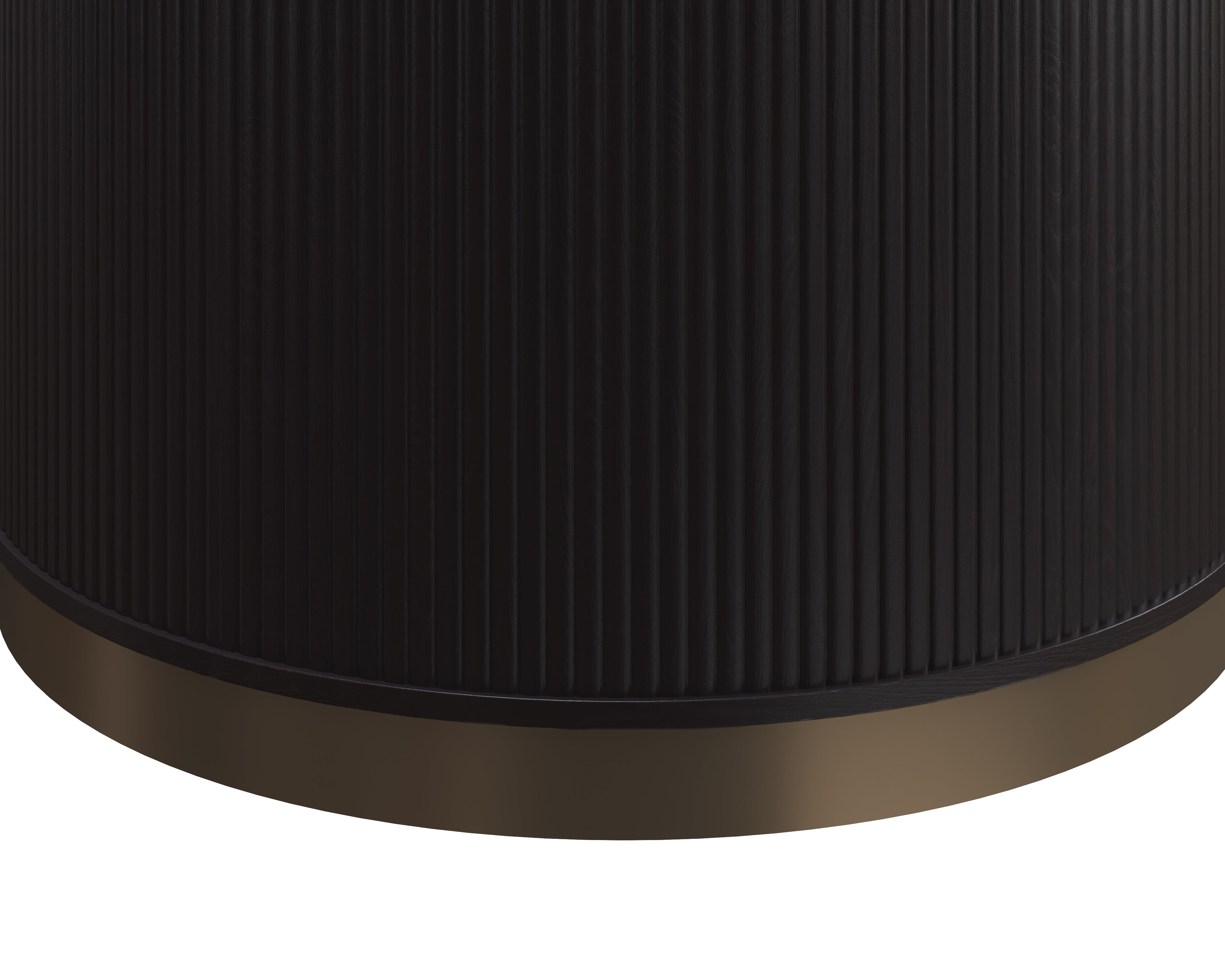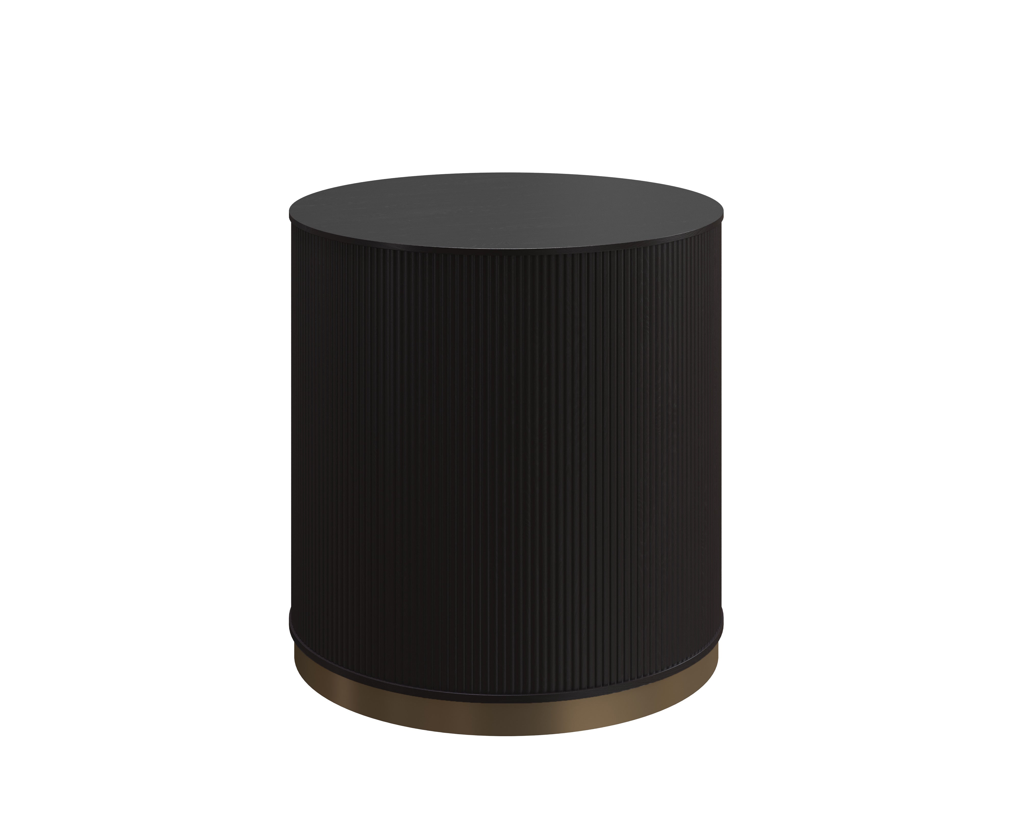 The Kalla Side Table brings form and function to life. Crafted with a rustic oak veneer with vertical reeding. A gold steel base finishes the look.