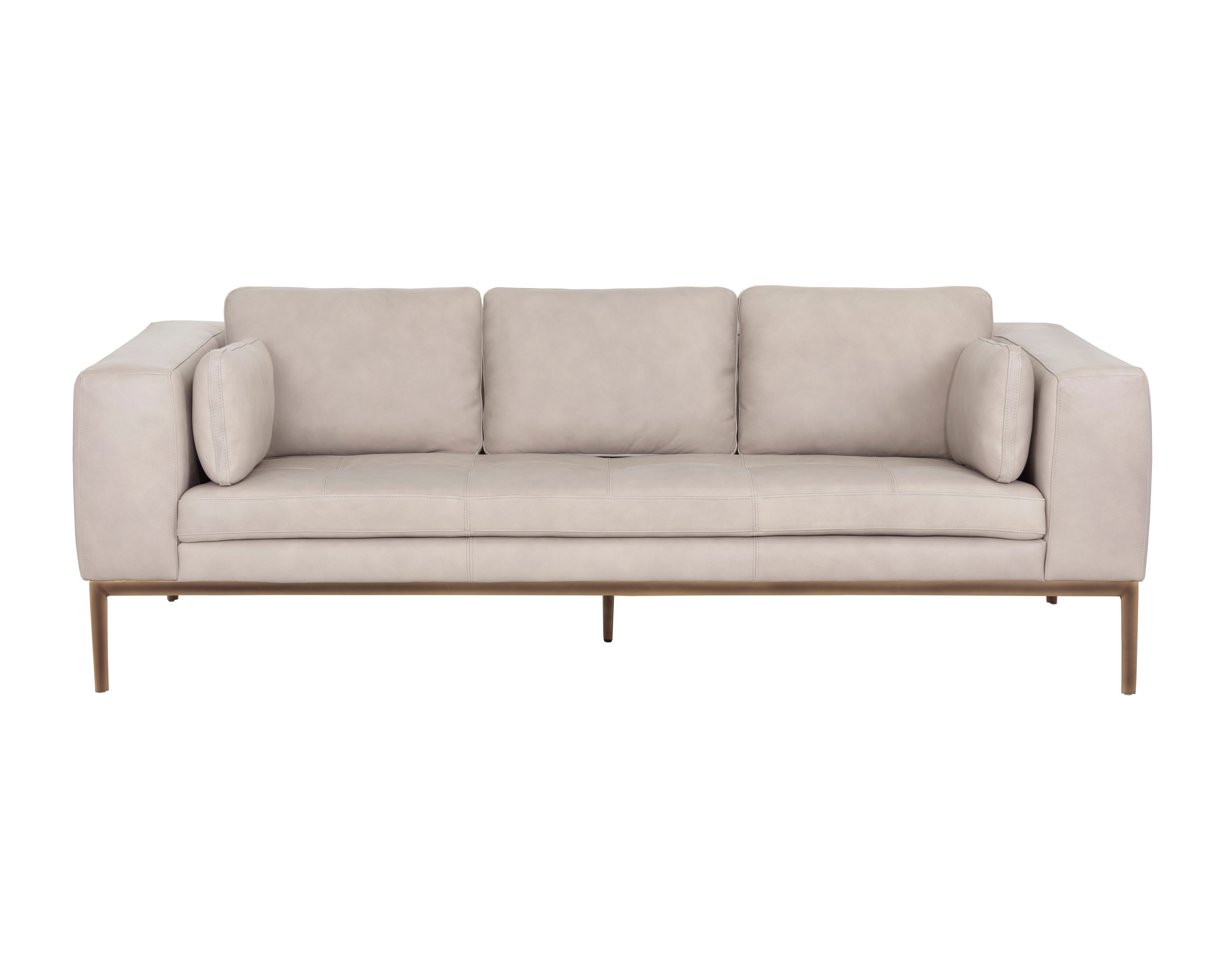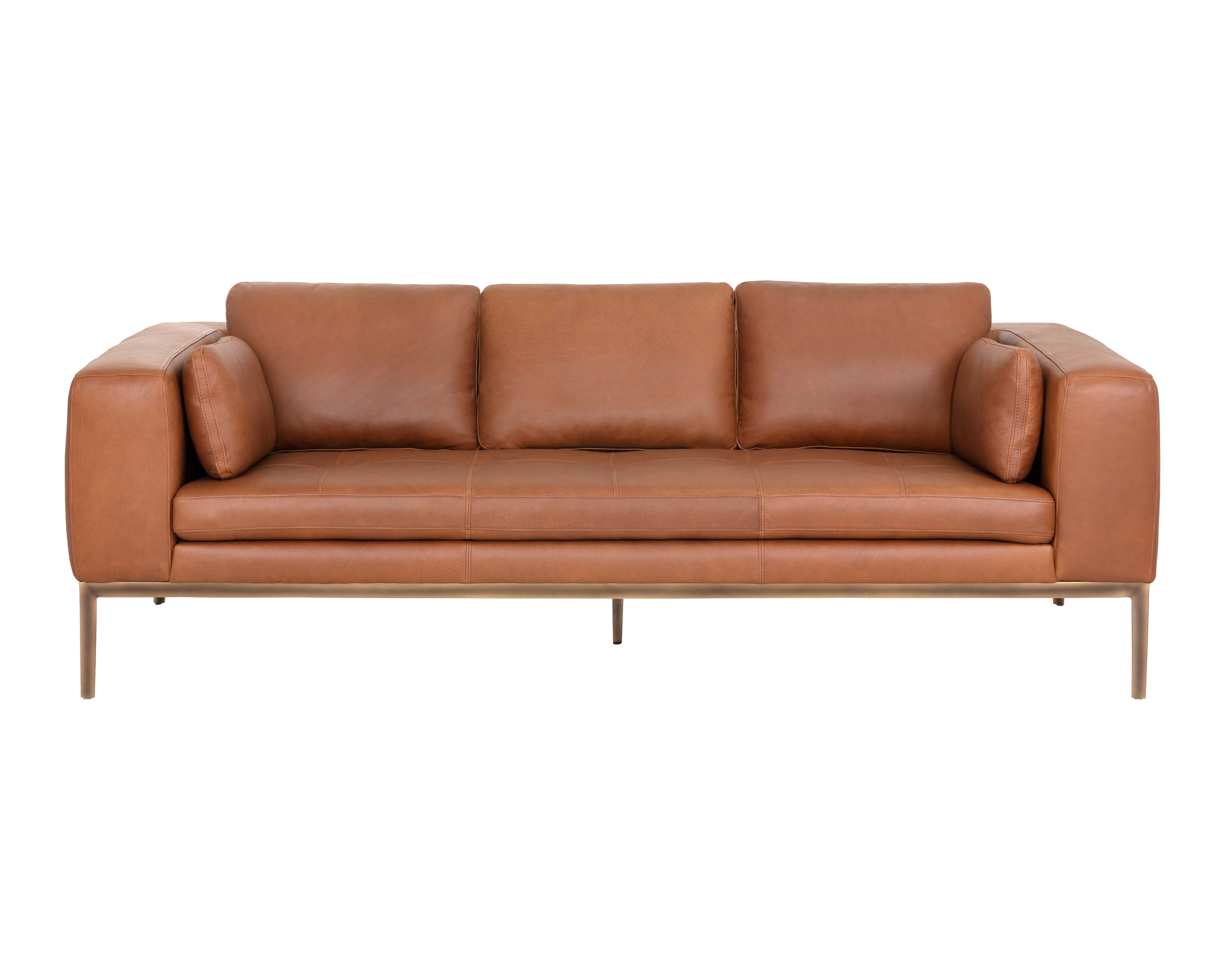 A masculine sofa with a modern design. Features an oversized seat and armrests with antique brass feet. Can be paired with coordinating armchair. Handle with Care: This design has been crafted with leather. Leather is a natural material; as such markings, wrinkles, grooves and light scratches are acceptable and appreciated characteristics. No two pieces are alike. Visit our Product Care page for more information on how to ensure the lasting beauty of this piece.