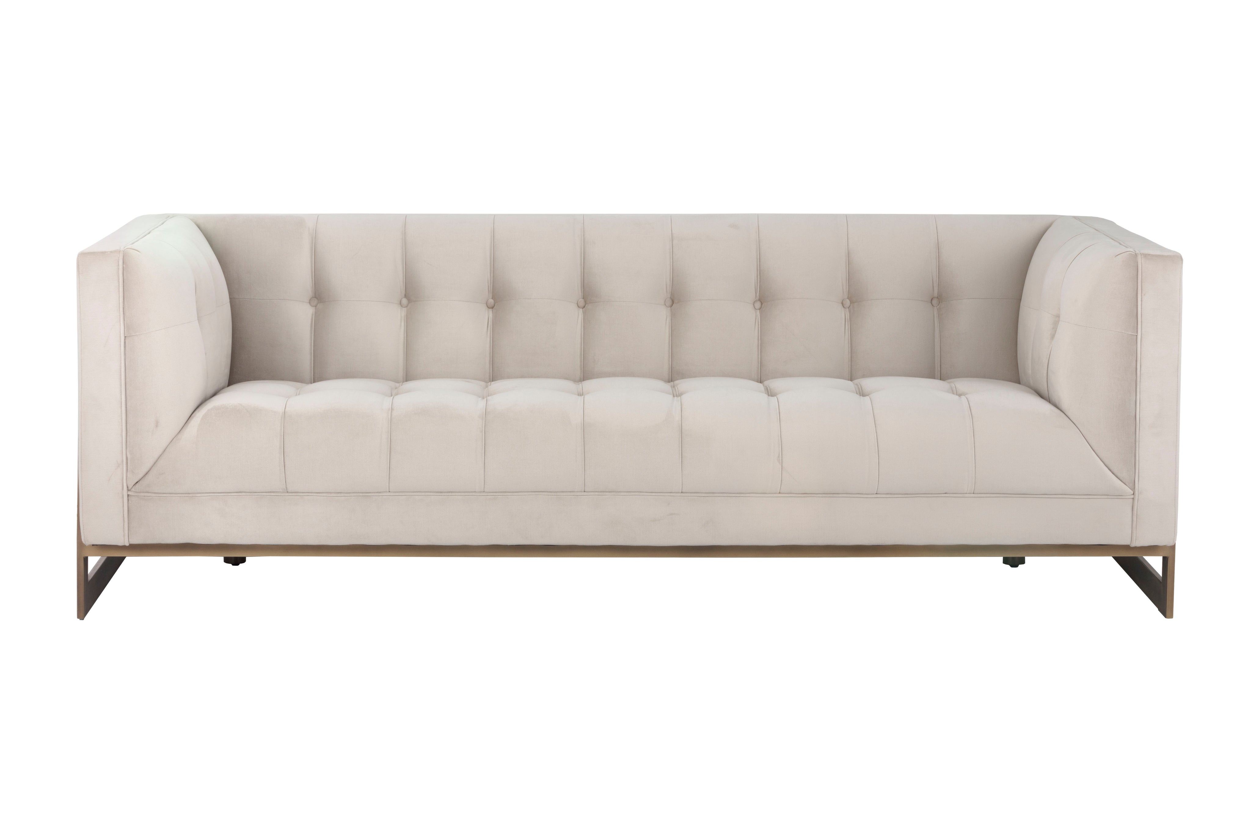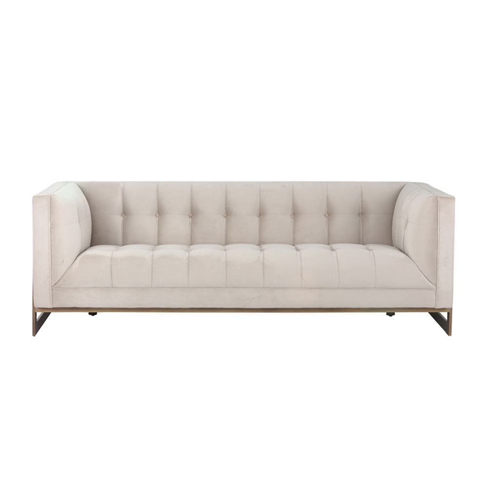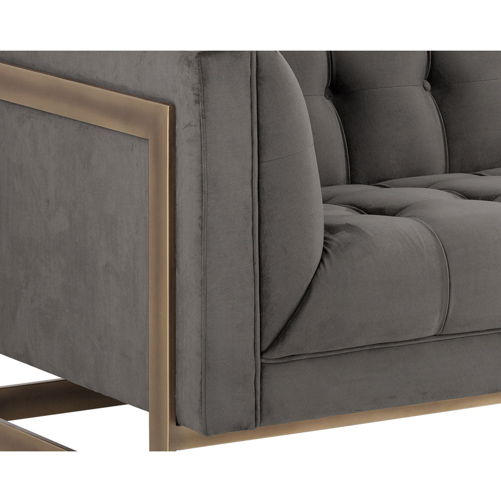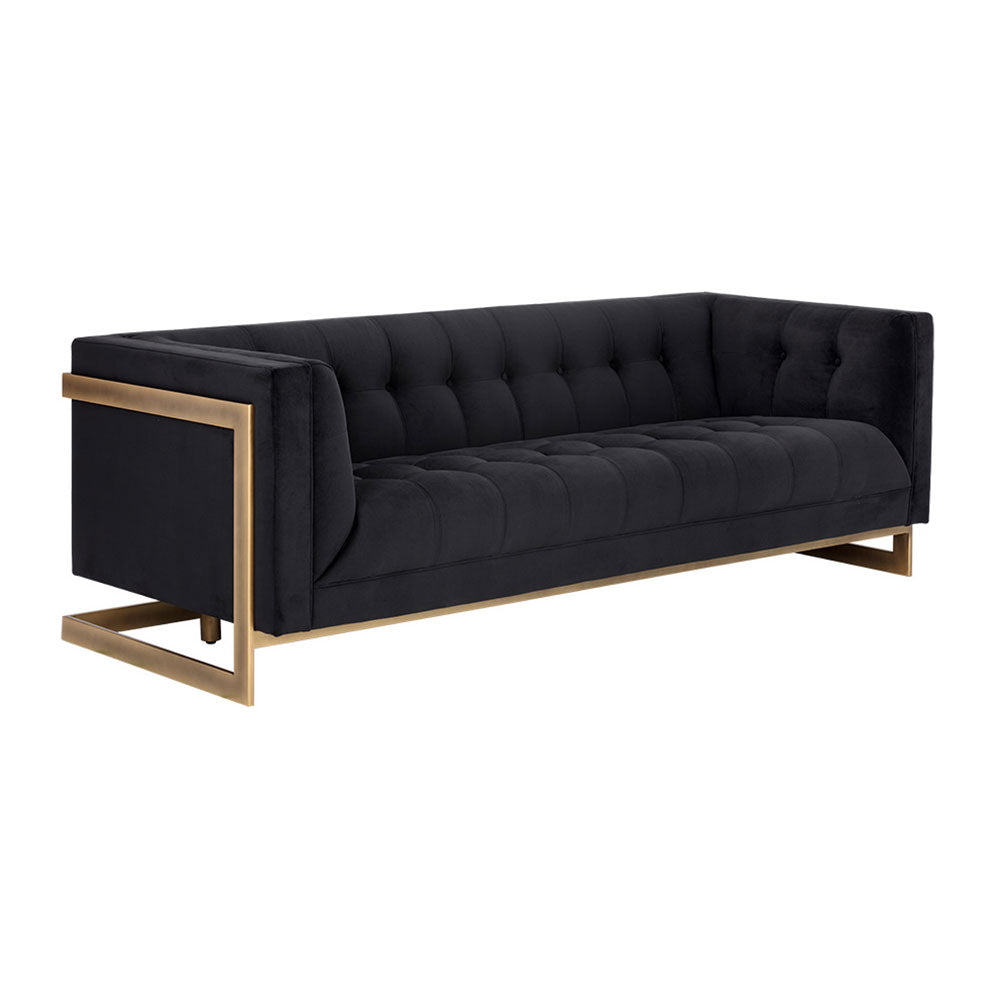 The streamlined design of this sofa is bold yet refined. Features beautiful deep button tufting, piping, and an exposed rustic bronze steel frame. Stocked in abbington black fabric. Perfect for residential and commercial settings.