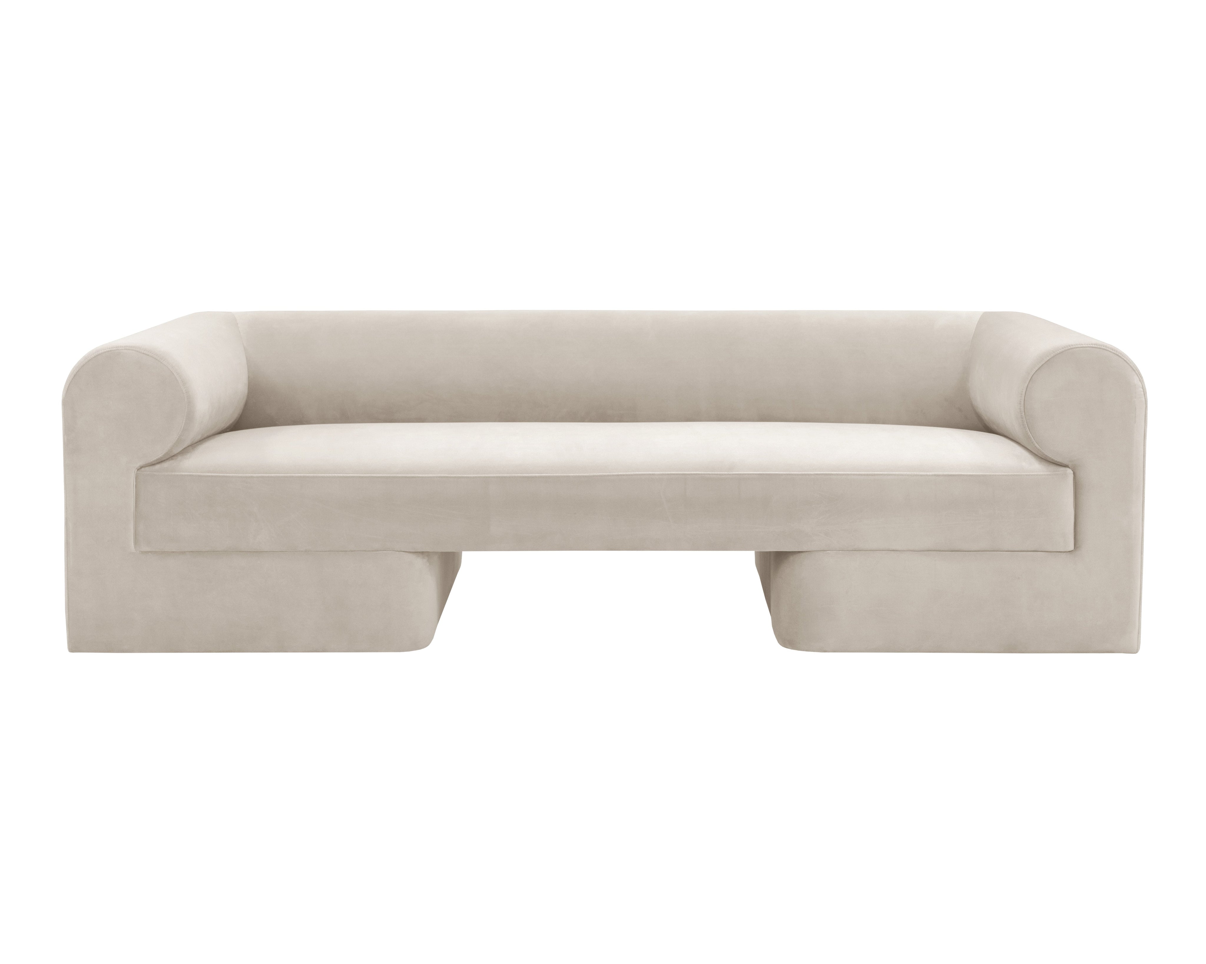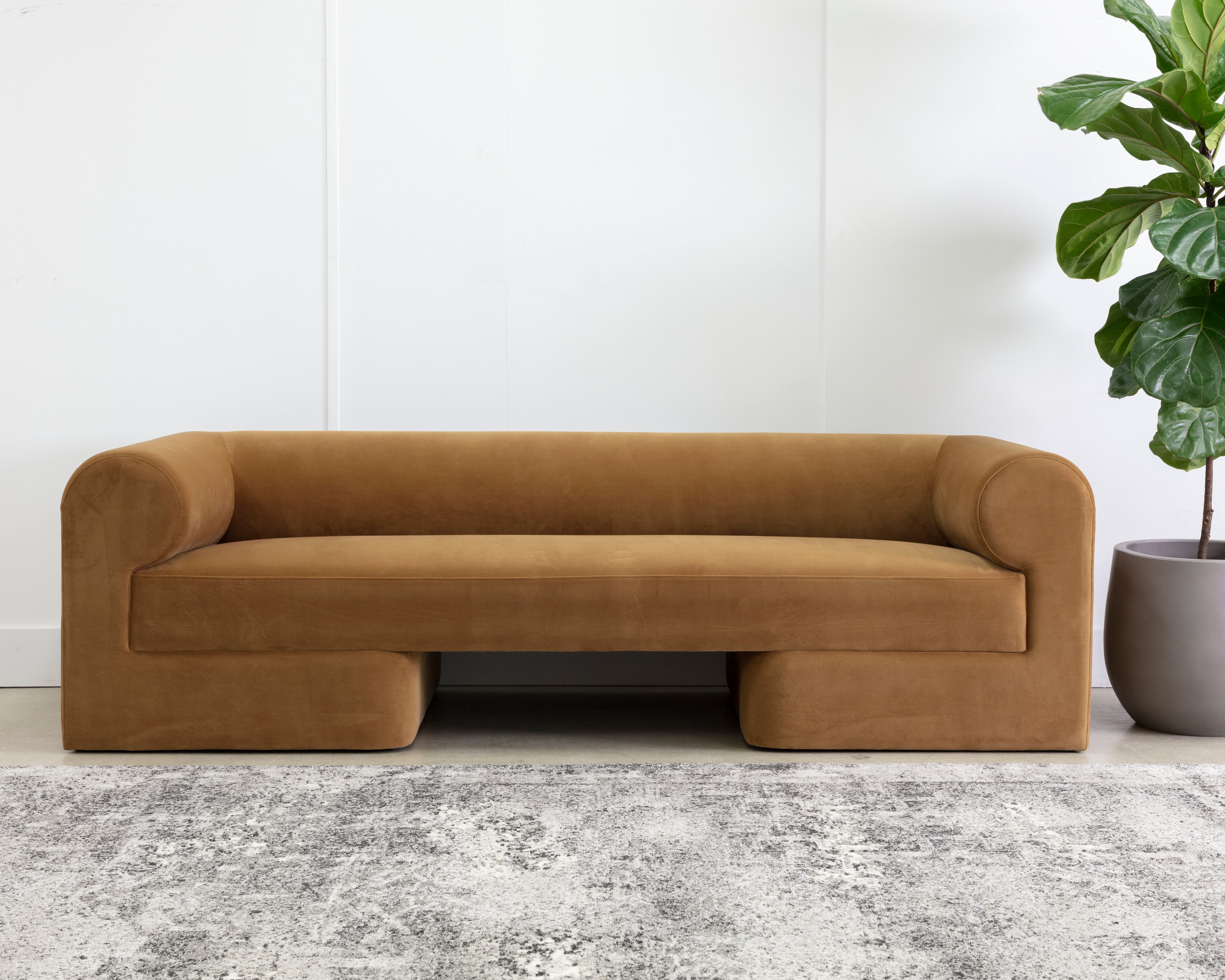A bold take on contemporary style, this sofa will stand out in any space. Features rounded back and arm rests for ultimate comfort. Fully upholstered in luxurious meg ash fabric. Pair with coordinating armchair to complete the look.