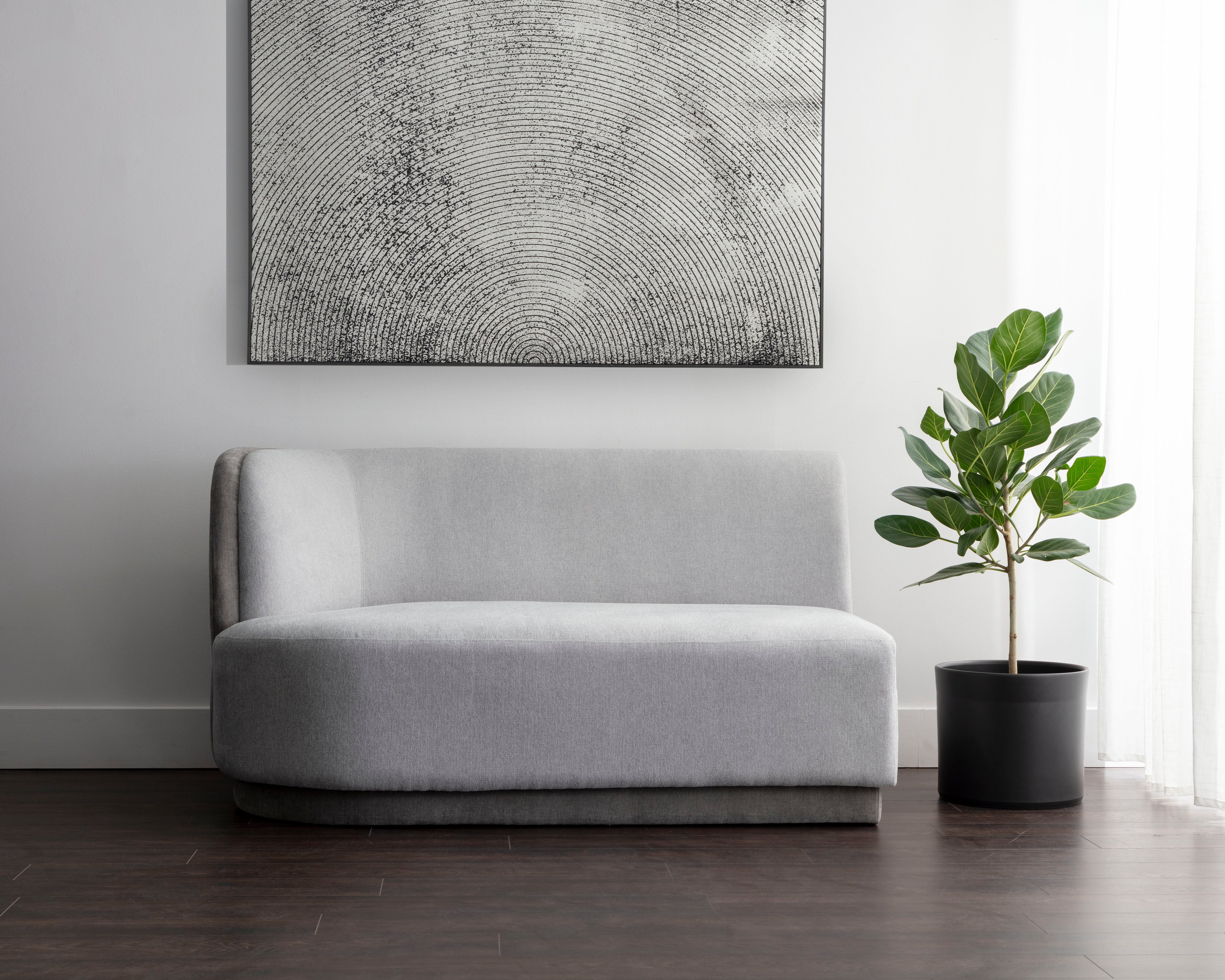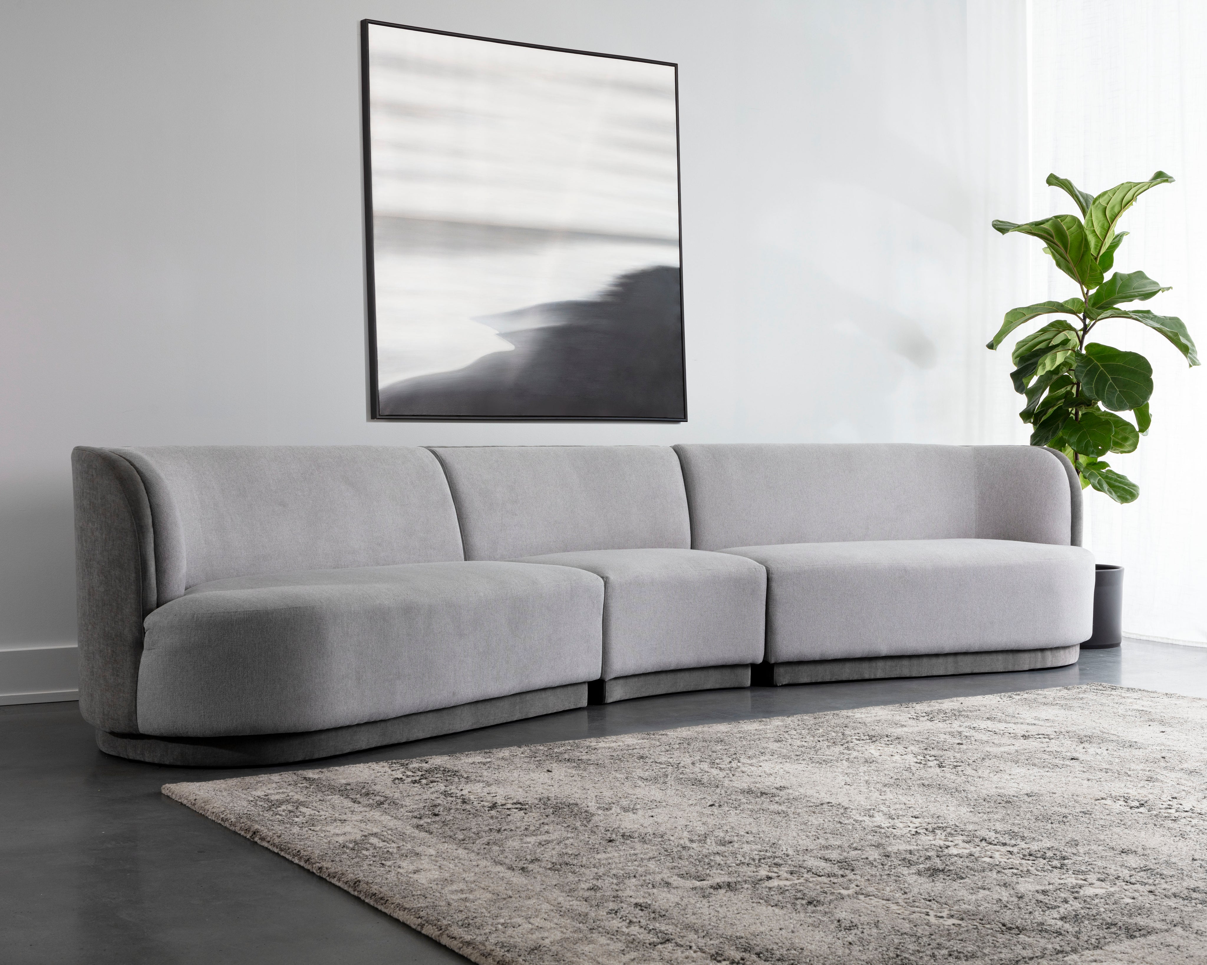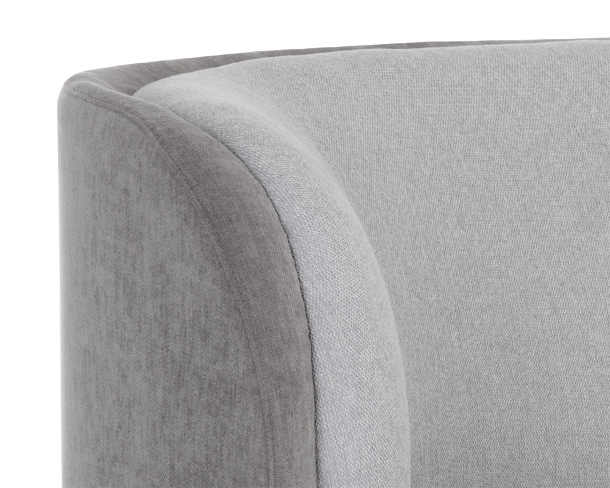 Infuse comfort into any space with this curvy, modular left armless chair that offers versatility in its placement. Stocked in danny dusty blue fabric and completed with a pine wood frame. This piece can be sourced alone or in a variety of combinations with the coordinating Jaclyn armless chair and right armchair.