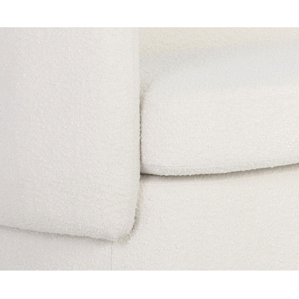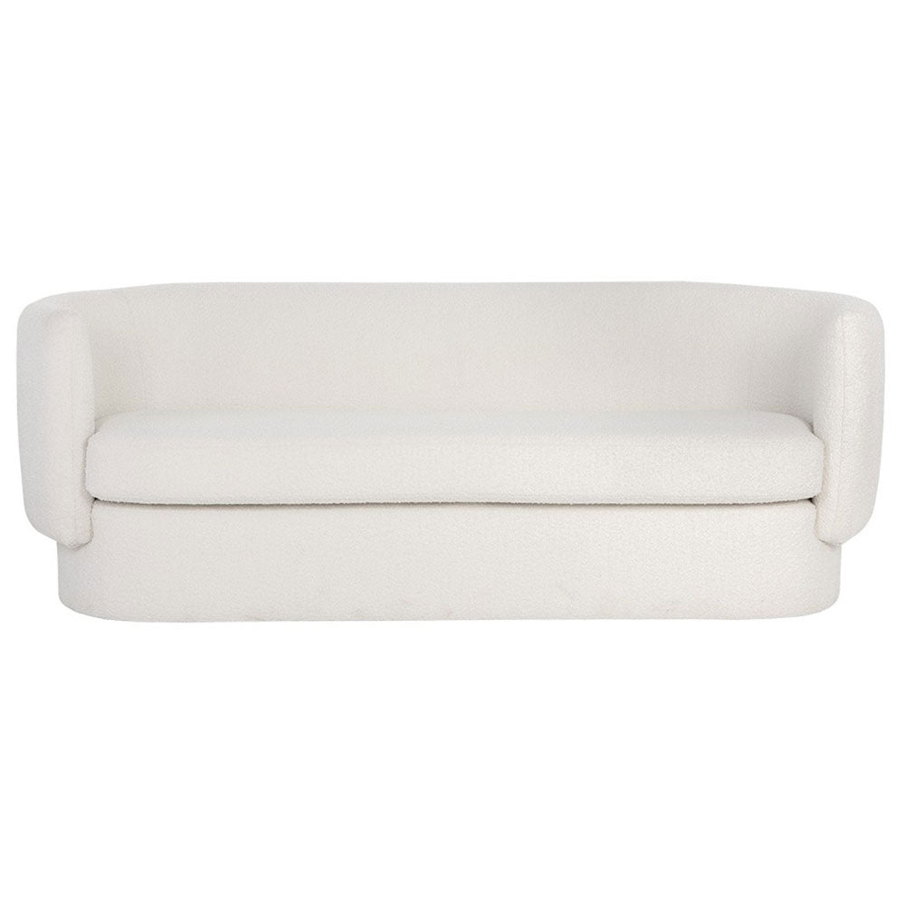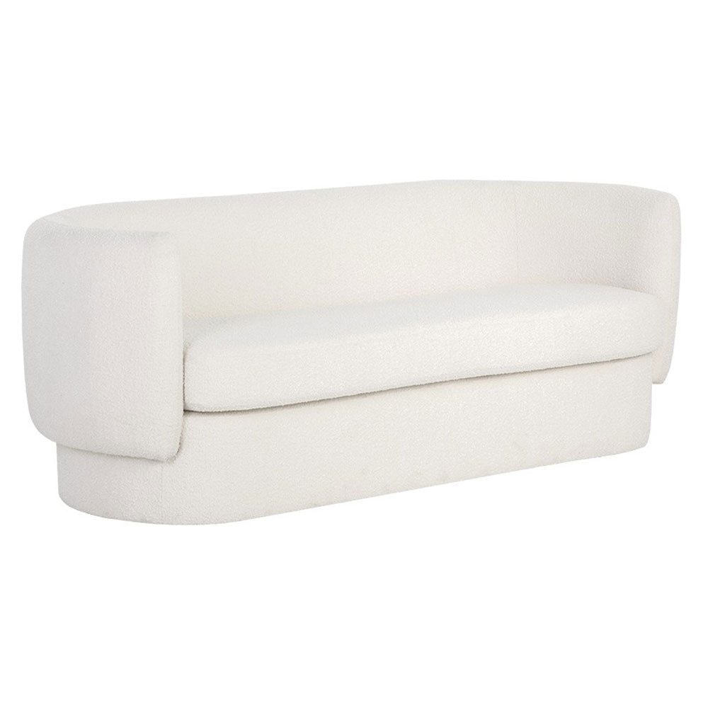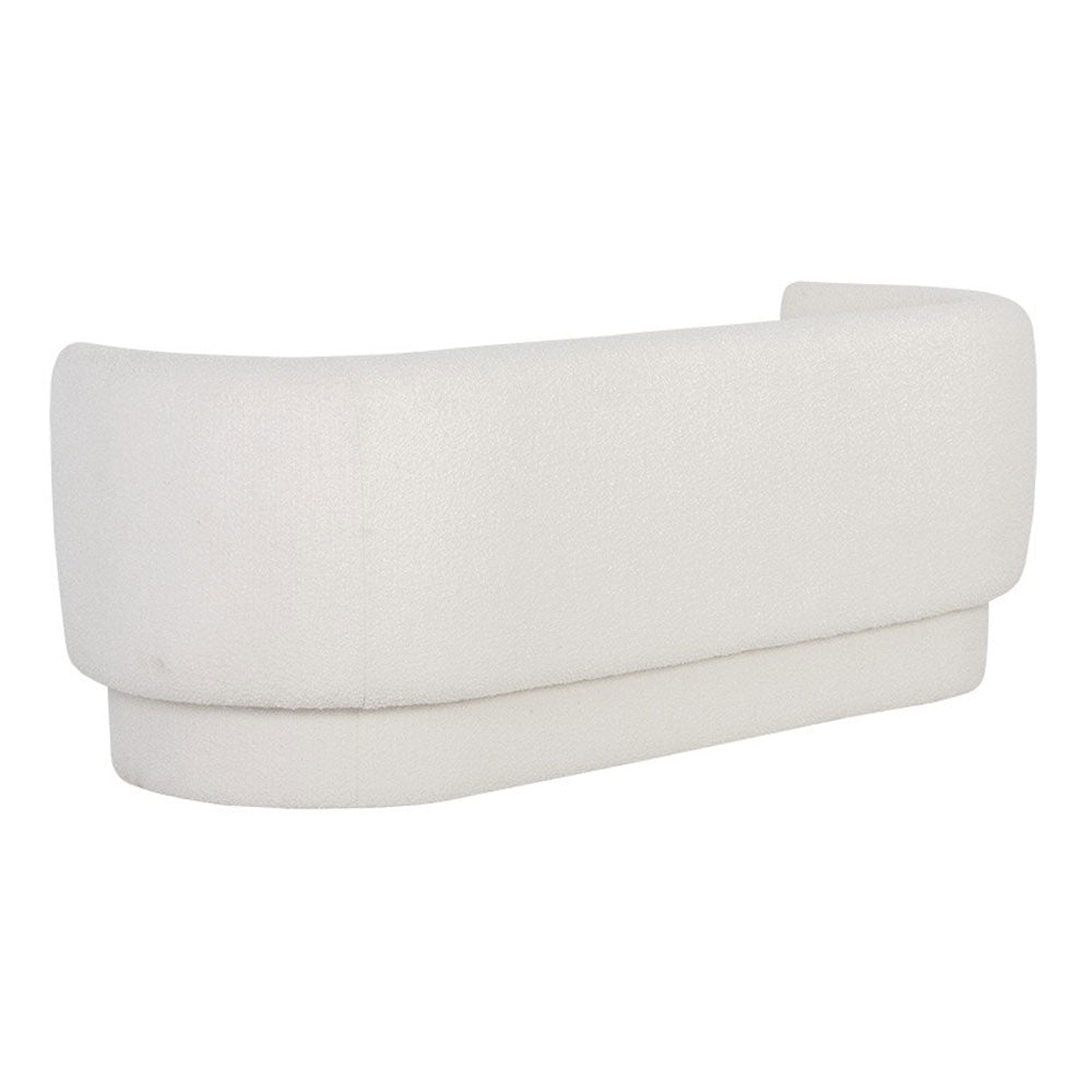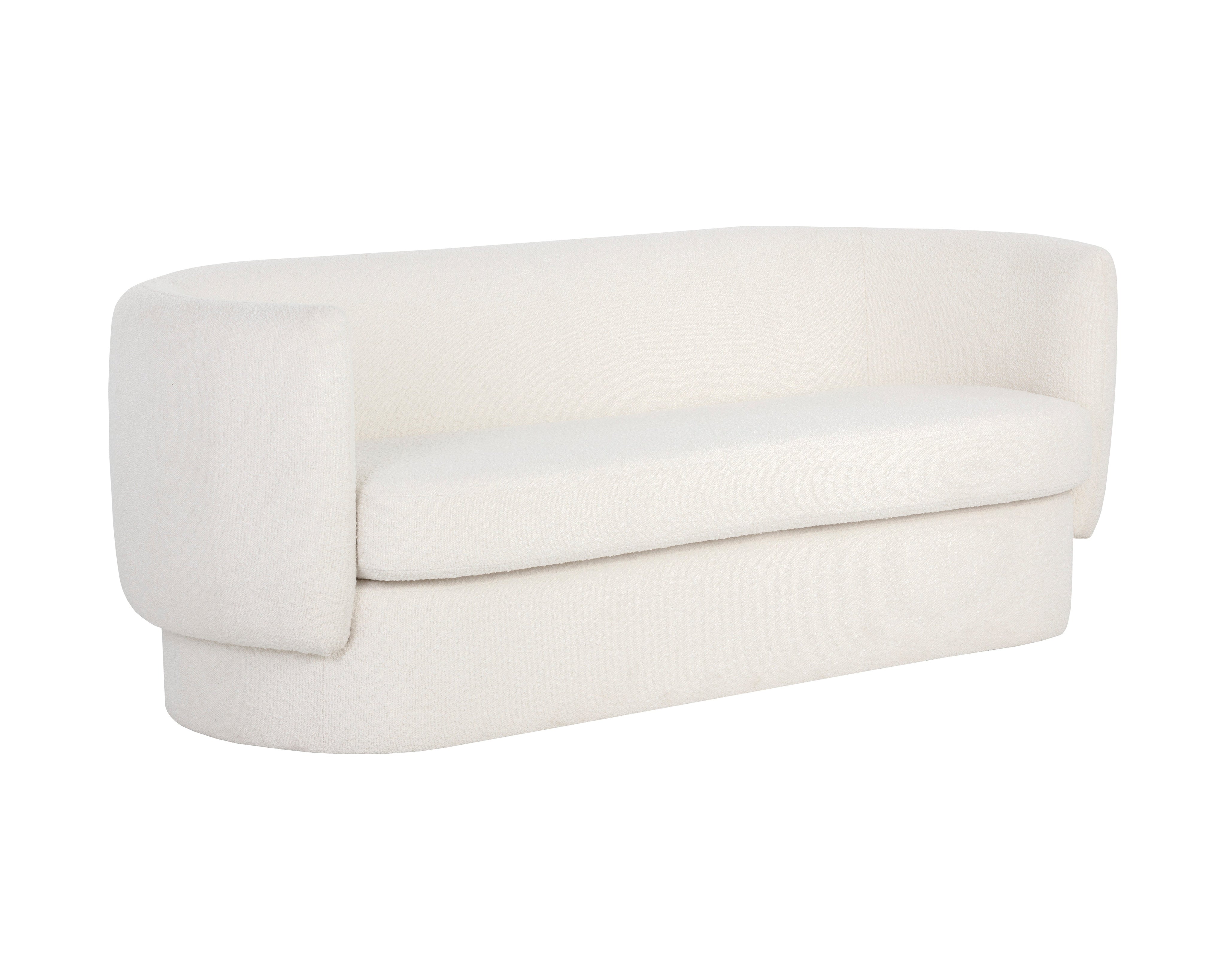 Evoke a stylish flair with this curved, contemporary sofa. Features a capsule shaped frame in maya white fabric. Maya fabric features a boucle texture. Eye-catching from all angles. Coordinating armchair also available.